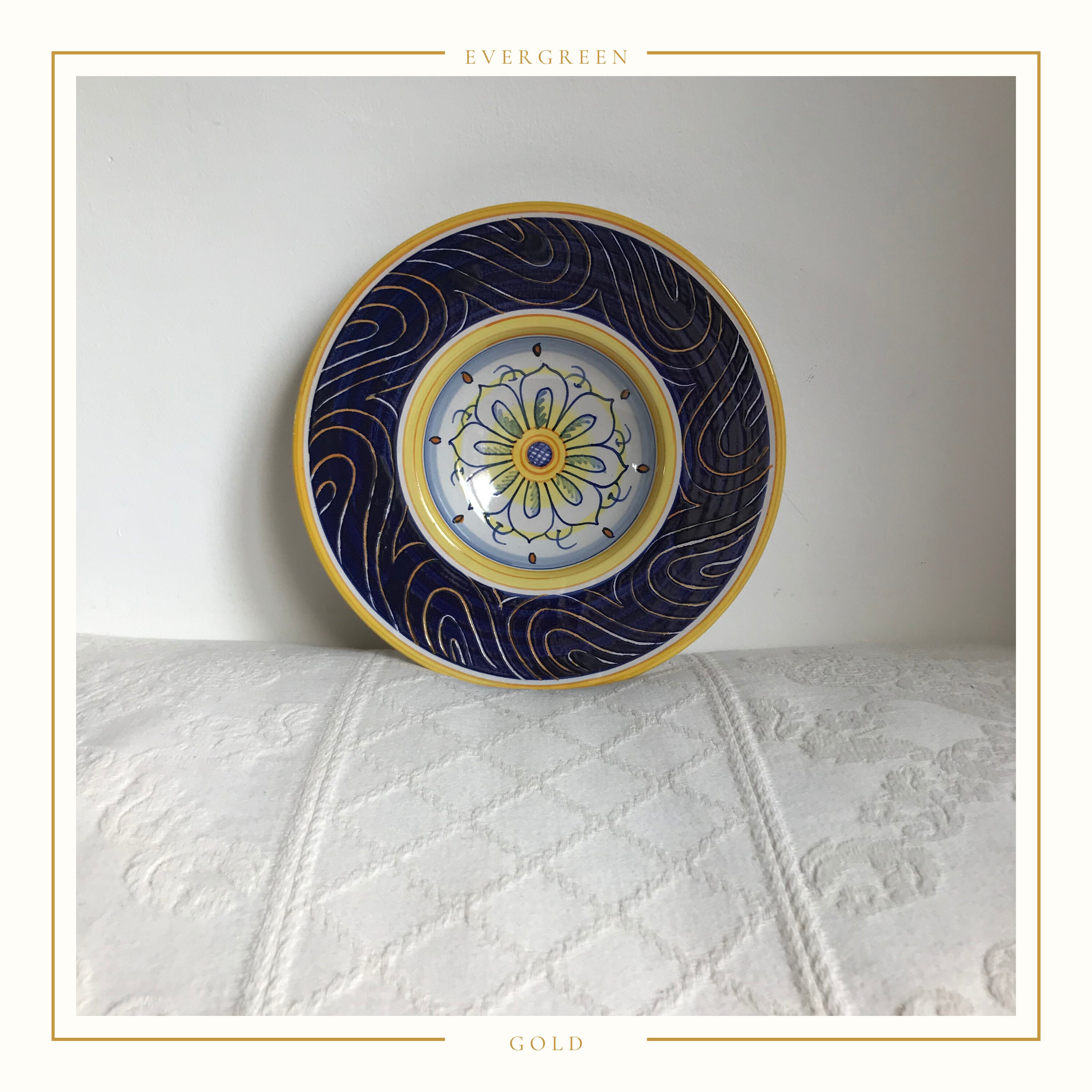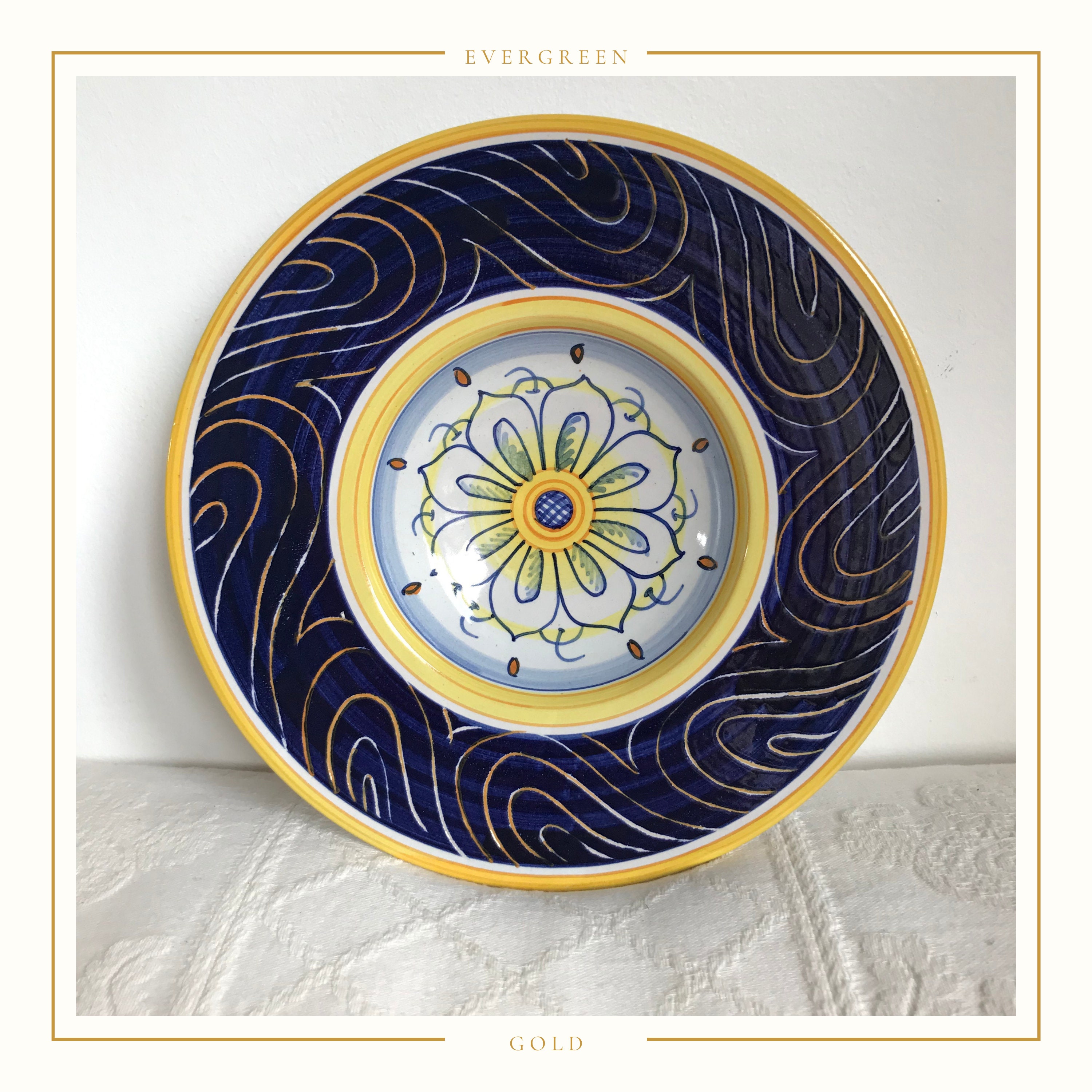 The colours are just stunning. The blue on the rim is a vibrant cobalt colour and has been applied over the top of the white glaze. Areas of the blue has then been scraped away in a Sgraffito type process to expose swirls of white glaze. Some of these have then been over glazed in yellow.