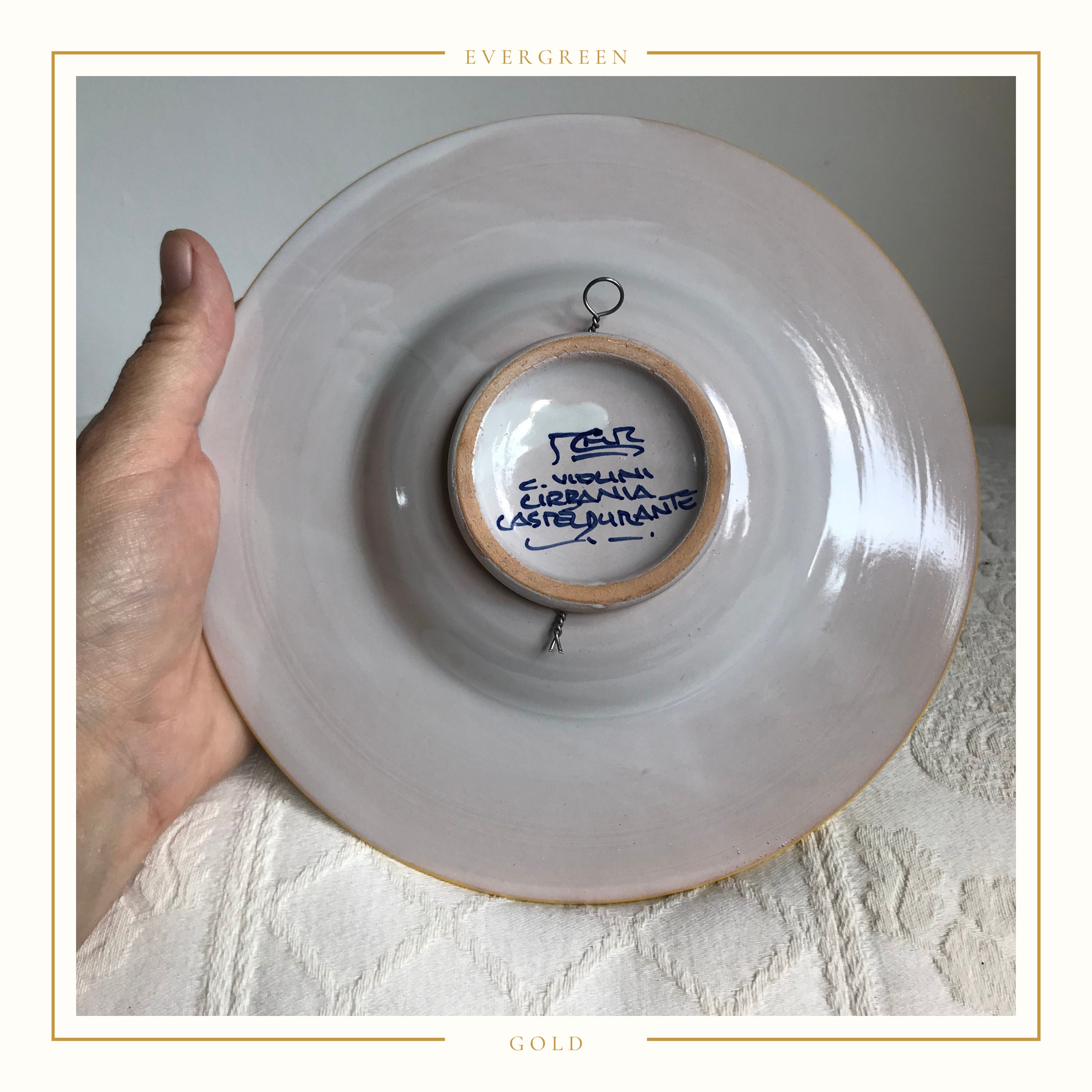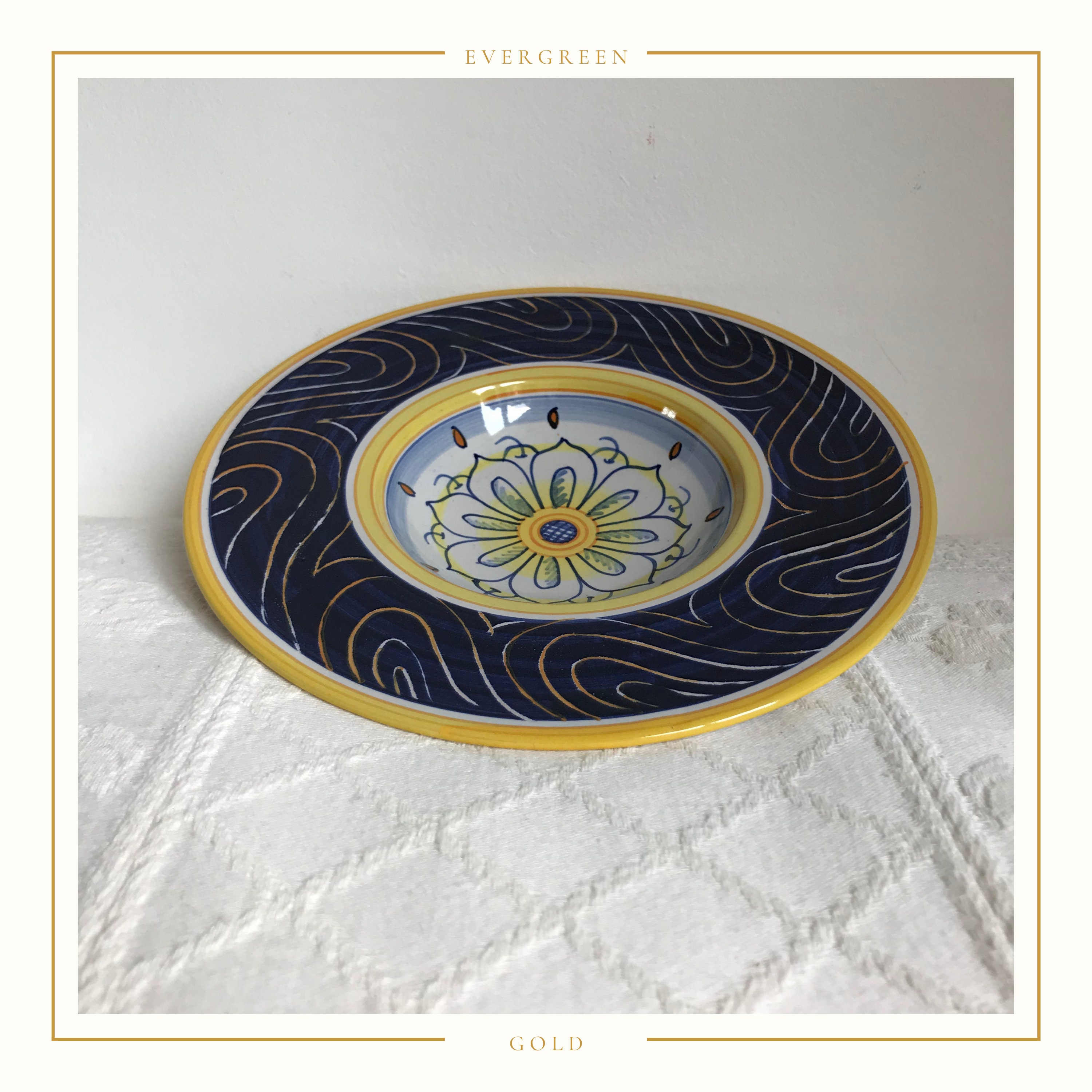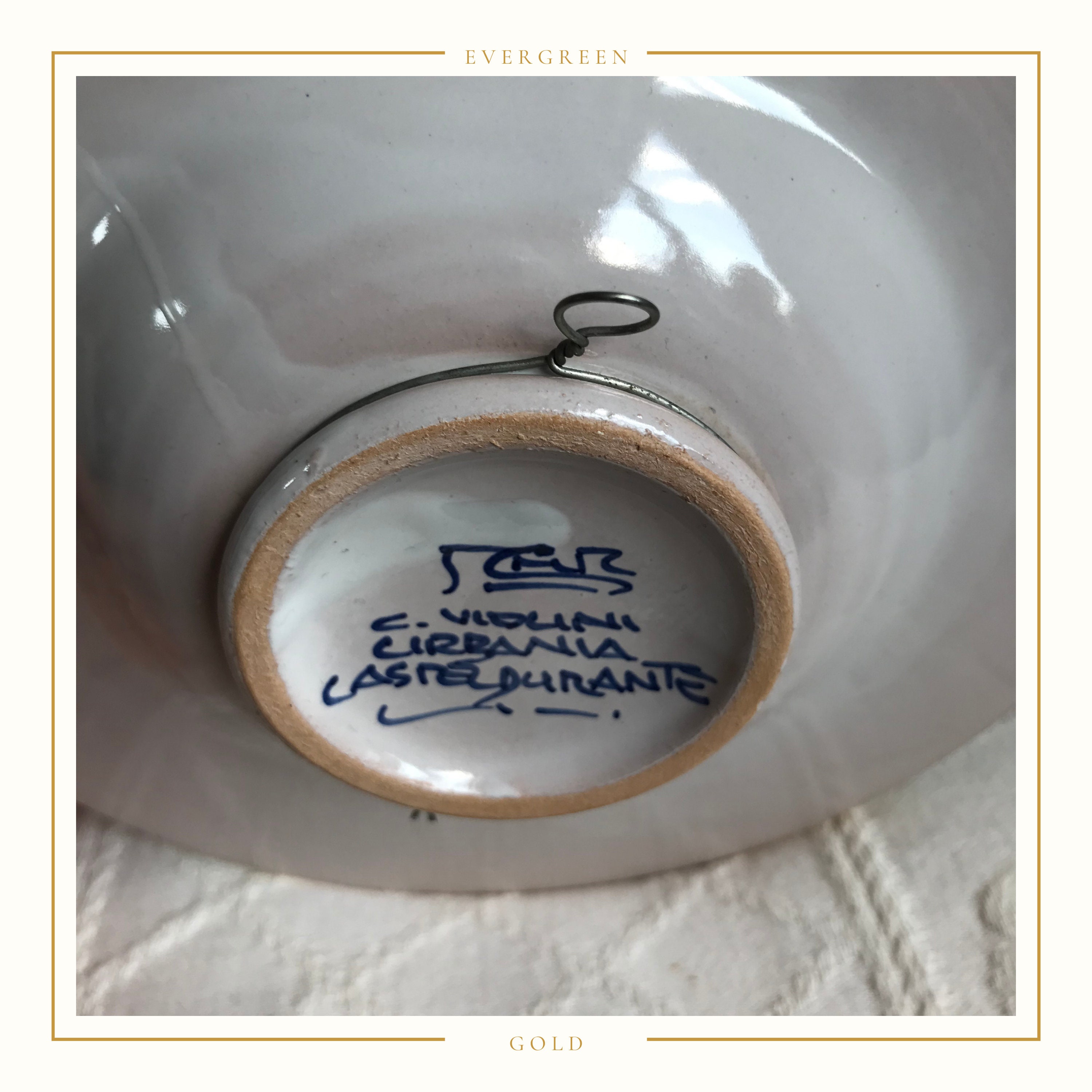 A beautifully crafted and decorated handmade Italian bowl from Castel Durante. This lovely footed bowl has been used in the past as a piece of wall art decoration and is wired ready to hang, however it is fully functional as a stunning serving bowl. It has created with a small bowl and a wide decorated rim and bears the makers name.