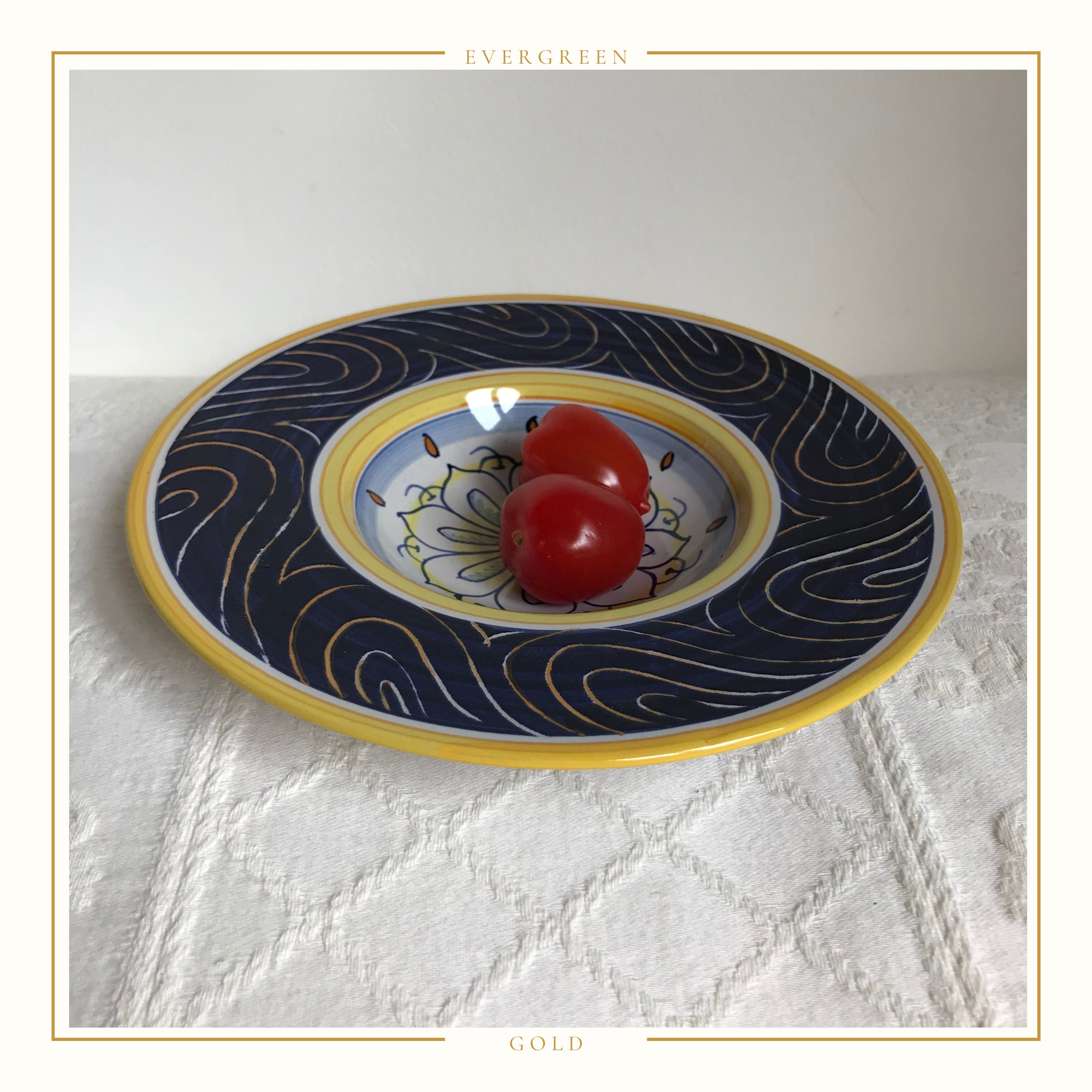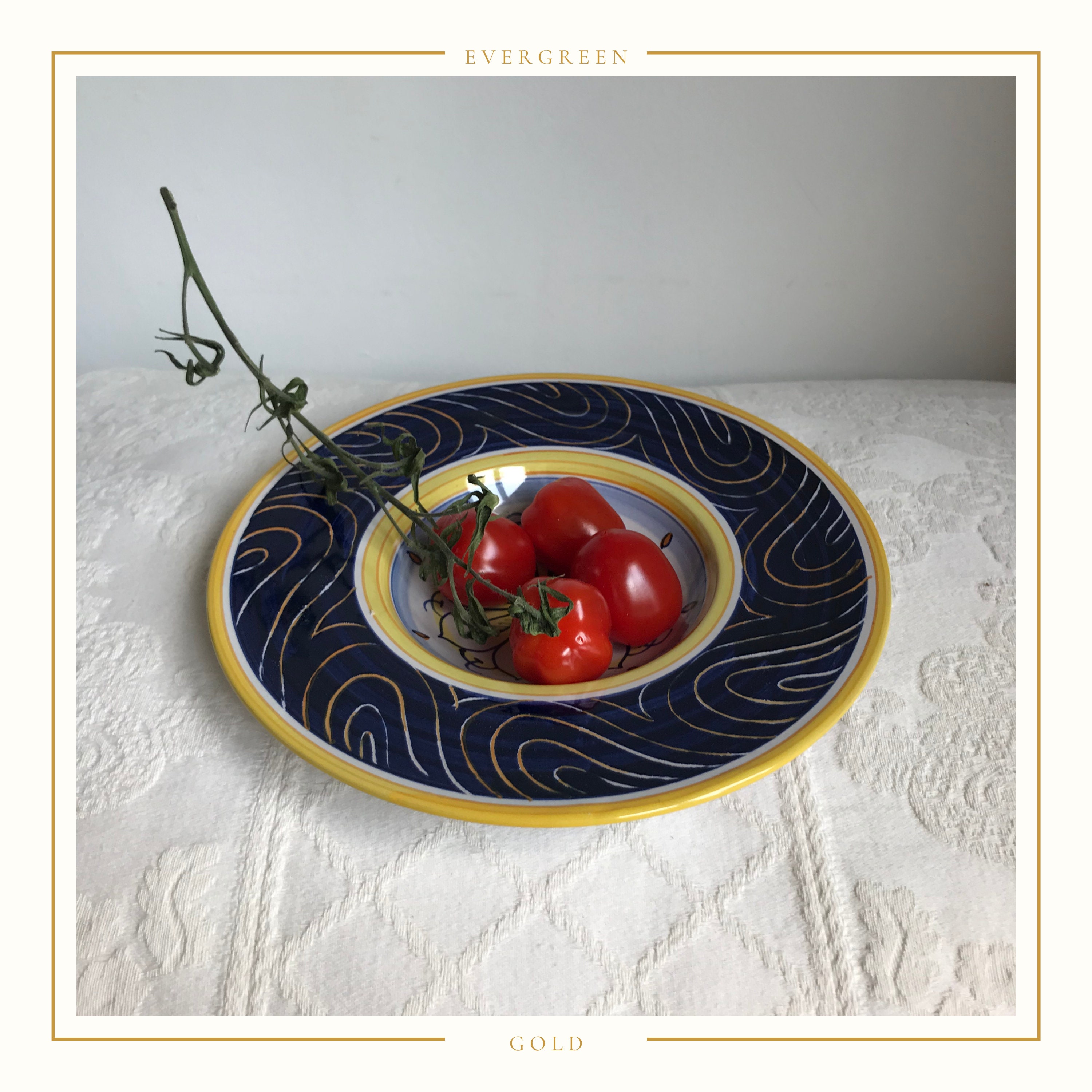 The entire bowl measures approximately 20cm in diameter and stands 3cm high. The central bowl area measures approximately 10.5cm in diameter. The tomatoes shown in the photo are a cherry plum variety but they are one of the larger cherry tomato varieties.