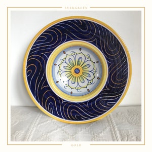 These lovely items are all hand painted and feature swirls of vibrant powder blue, white and candy pink alternating around the cup and the saucer. These have then been over painted with a decadent pattern design in gold, peach and blue. The white bands feature the pattern in all gold, the blue and the pink bands have the flowers filled with a matte peach colour, outlined in gold. these peach flowers have a central bead of darker blue enamel that sits like a tiny jewel in the centre.