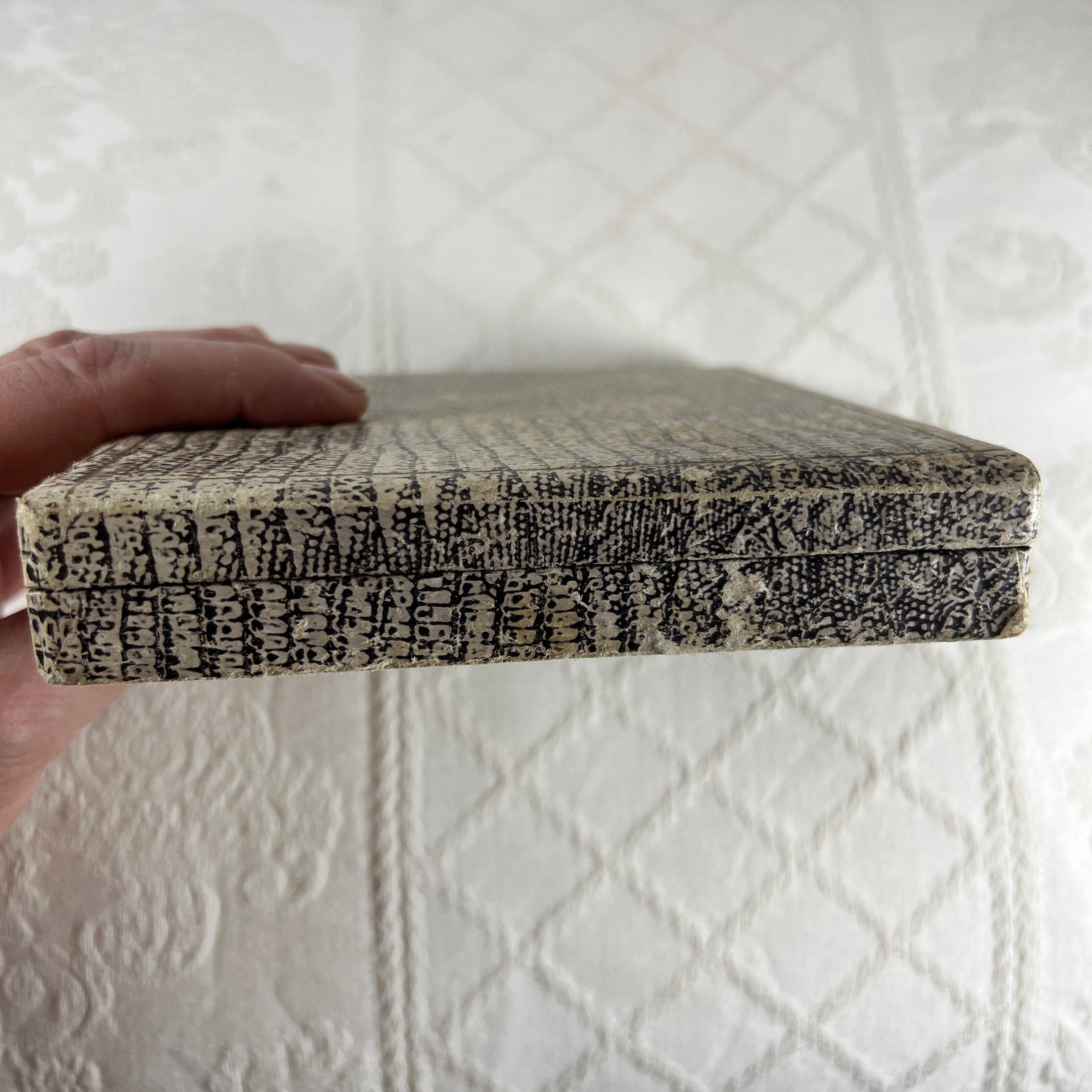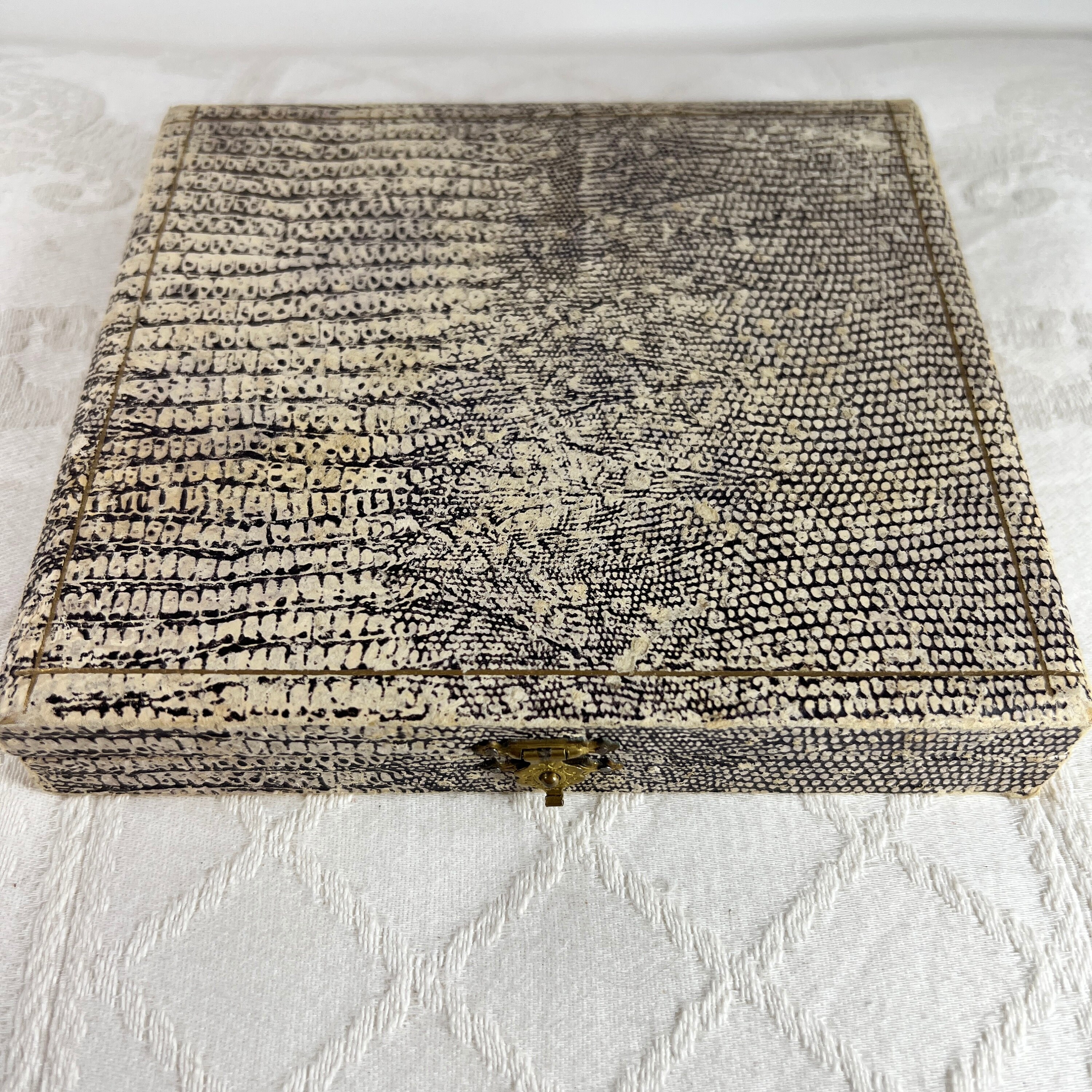 They are housed in a faux reptile skin box with a hinged lid and small brass coloured catch on the front. The reptile effect covering appears to be a paper or light card type material and shows areas of wear and damage, giving it a beautifully aged and vintage feel.