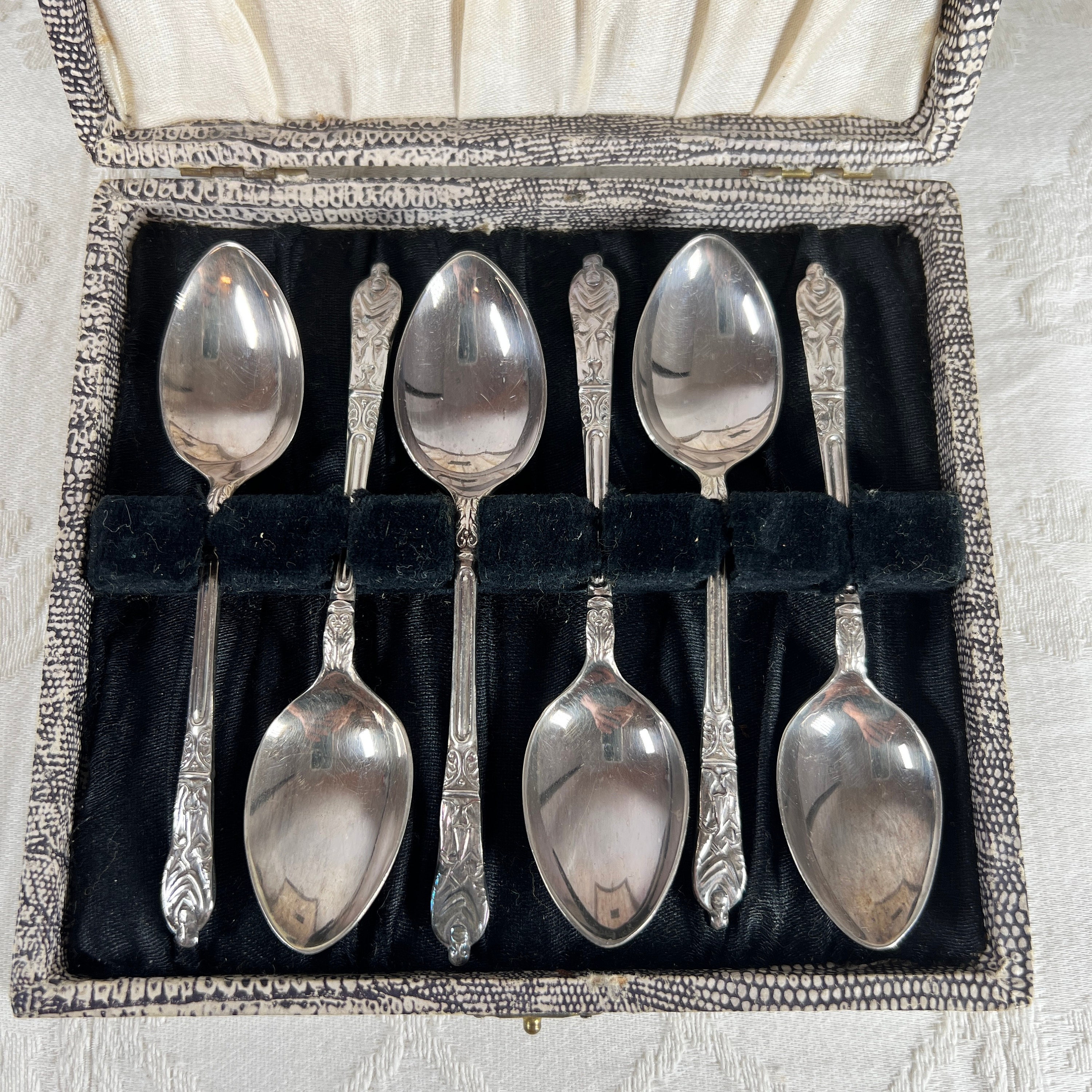 A wonderful set of 6 vintage silver plated Apostle coffee spoons in their original presentation box. These lovely spoons were made in Sheffield, England and are believed to date from the early to mid 20th Century. They are contained within their original presentation box and are in very good vintage condition.