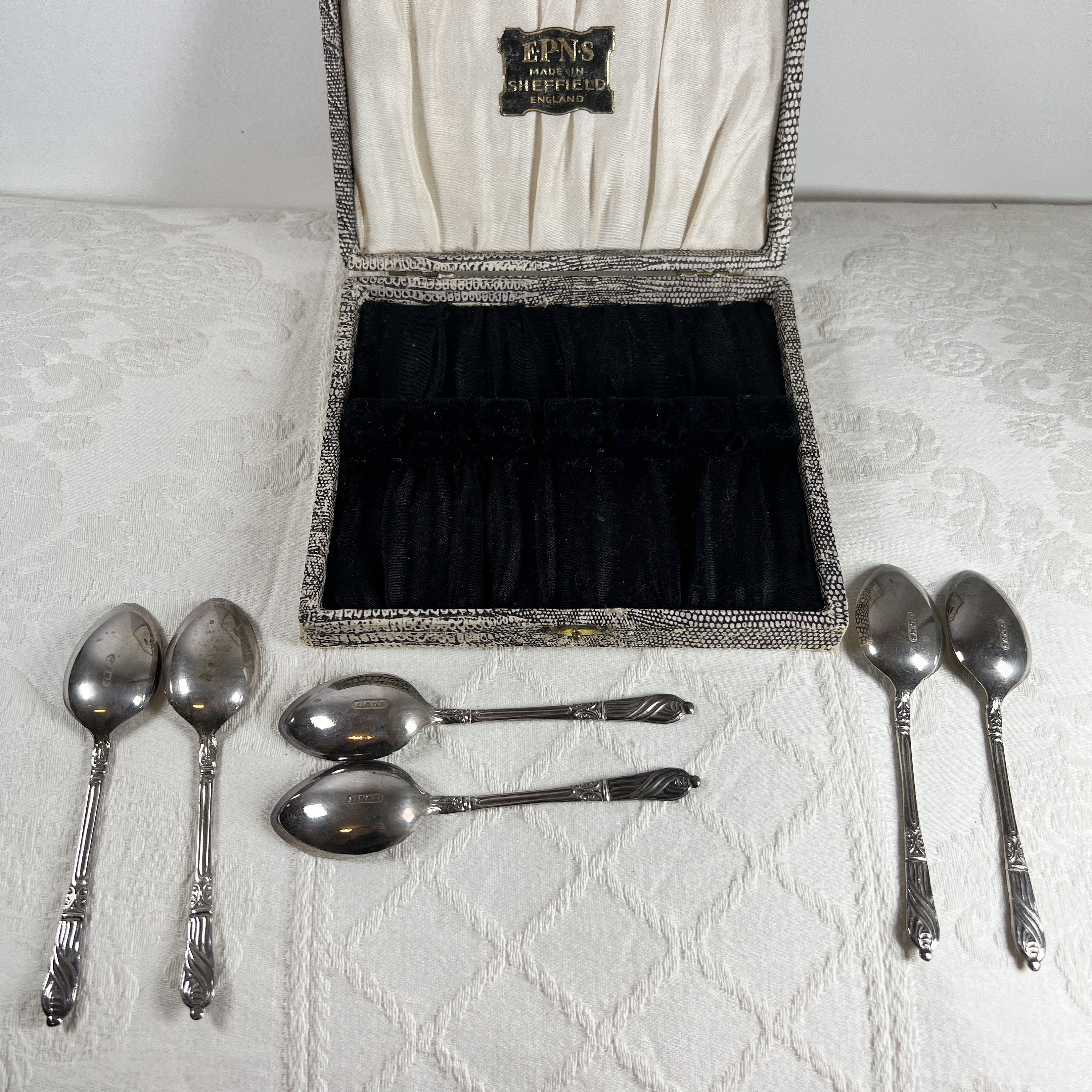 Inside the box the spoons sit in a black velvet lined rack with a black satin lined base, which holds them neatly. The lid is lined in a cream satin style material with an embossed card attached to show that they are plated and made in Sheffield.