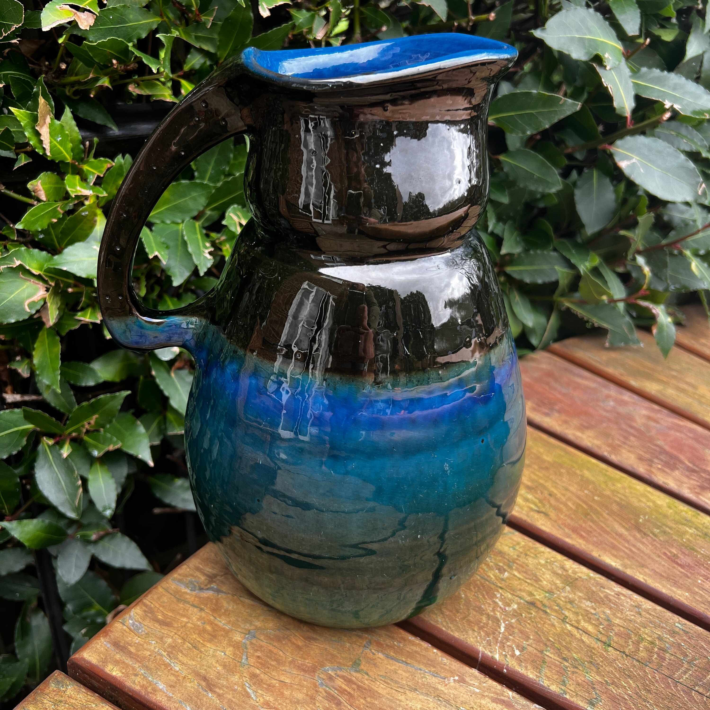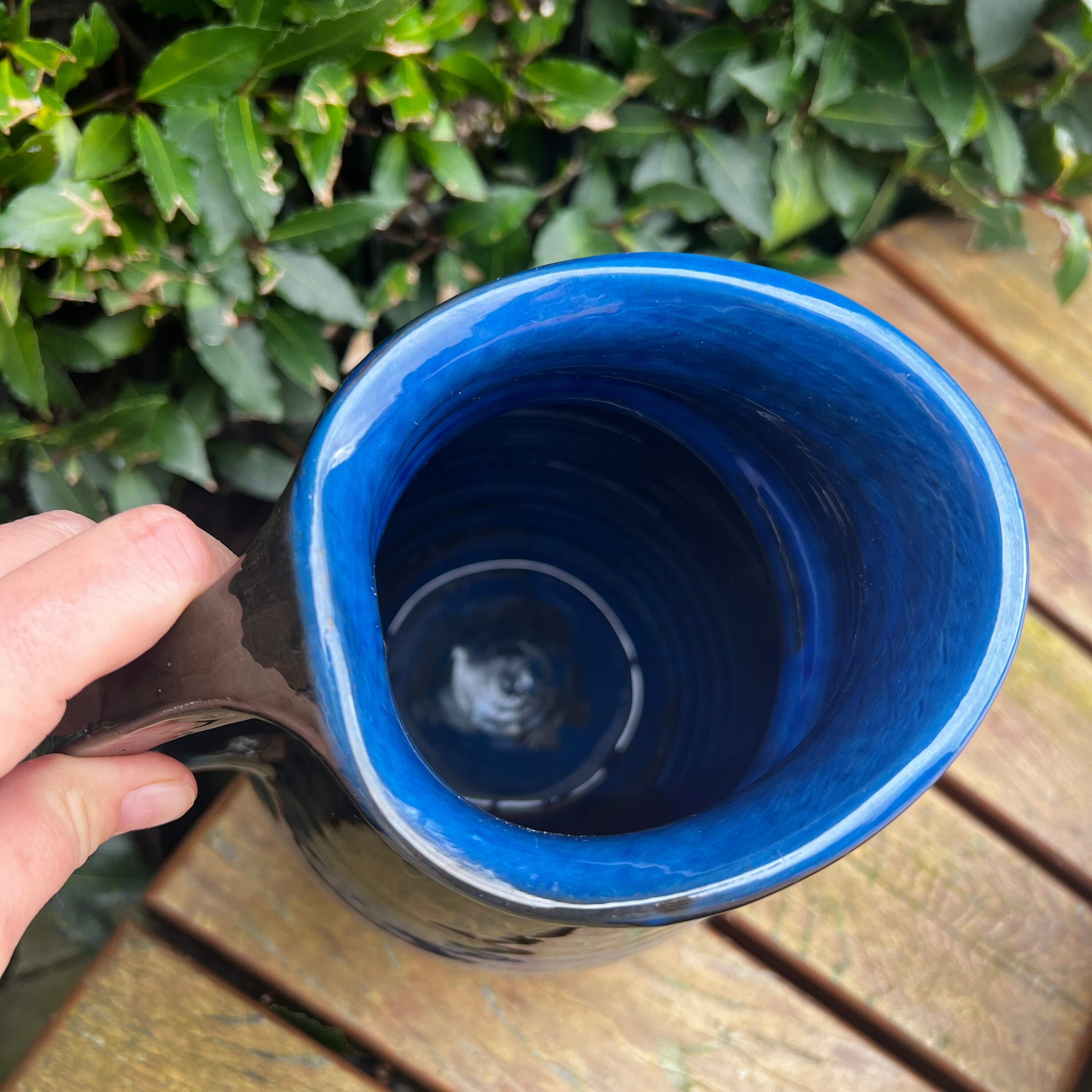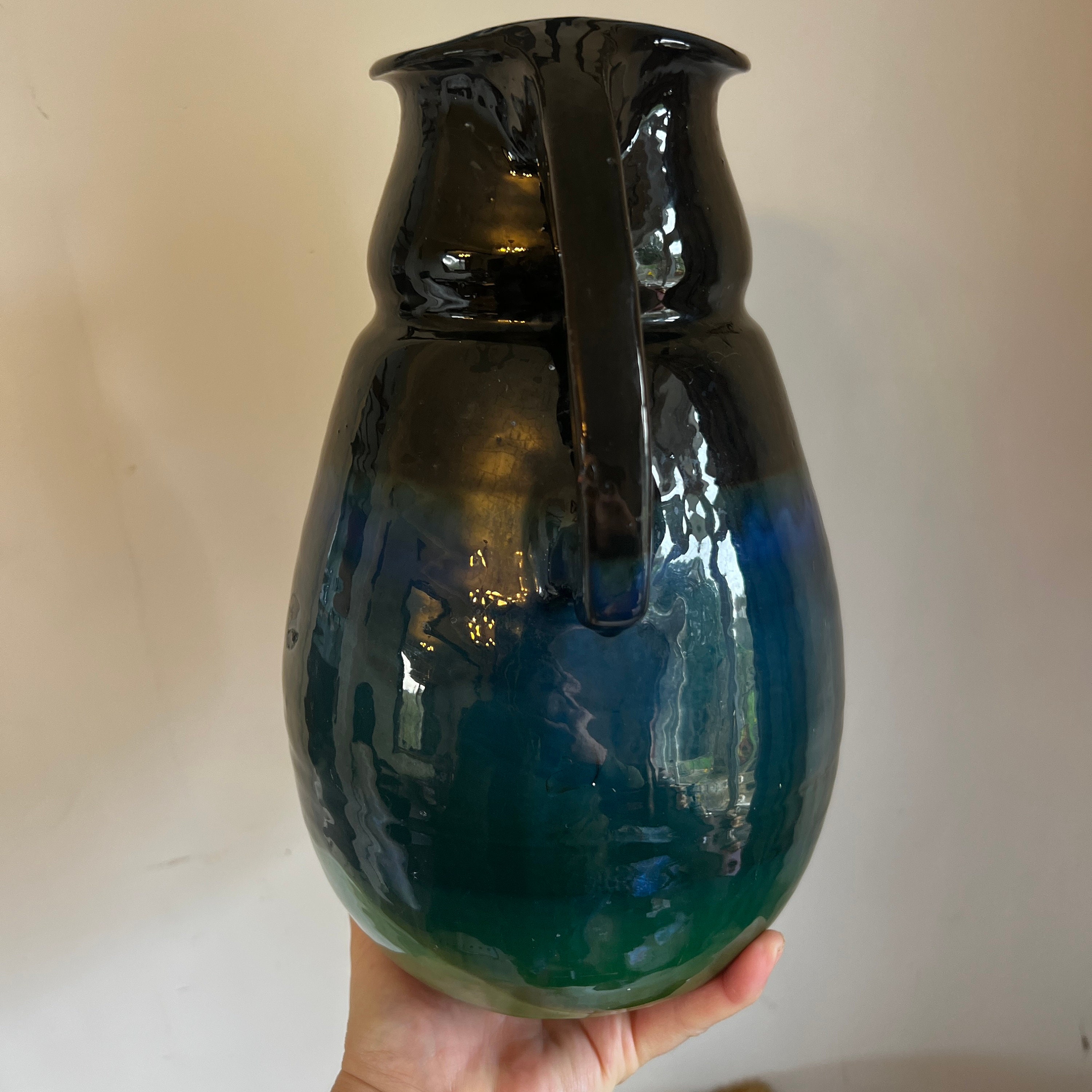 This stunning piece is made from a thick red clay and glazed in a bright blue inside. It has been glazed with layers of black, brown, blue and green on the outside and has a lovely organic and free flowing graduated colour. The photographs show it in natural sunlight and artificial light to show the colours. It looks most impressive when well lit to pick up all the colours and allow the lighter greens to pop. There is also a slight iridescent lustre on the outer glaze that shows up in bright light. This is a handmade and decorated piece and as such does have a few glaze manufacturing issues to point out. There is a little blip in the glaze on the handle, perhaps from the time of glaze dipping. There is also a large smudge in the glaze on the body where the glaze has been disturbed prior to firing. These can all be seen in the photographs.