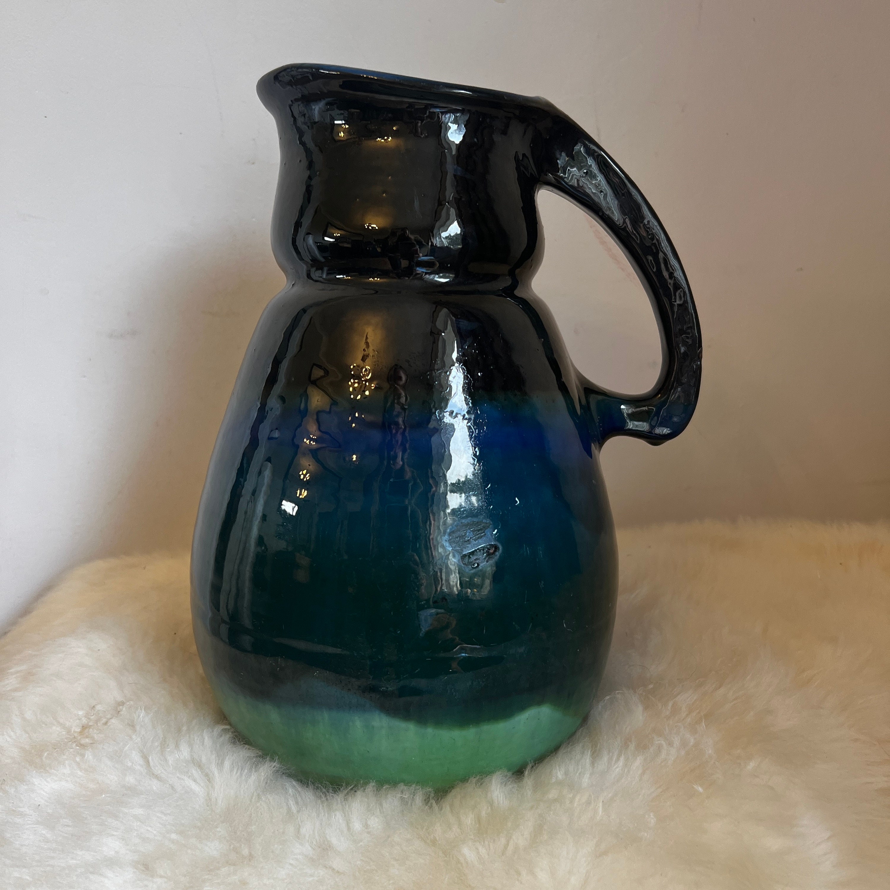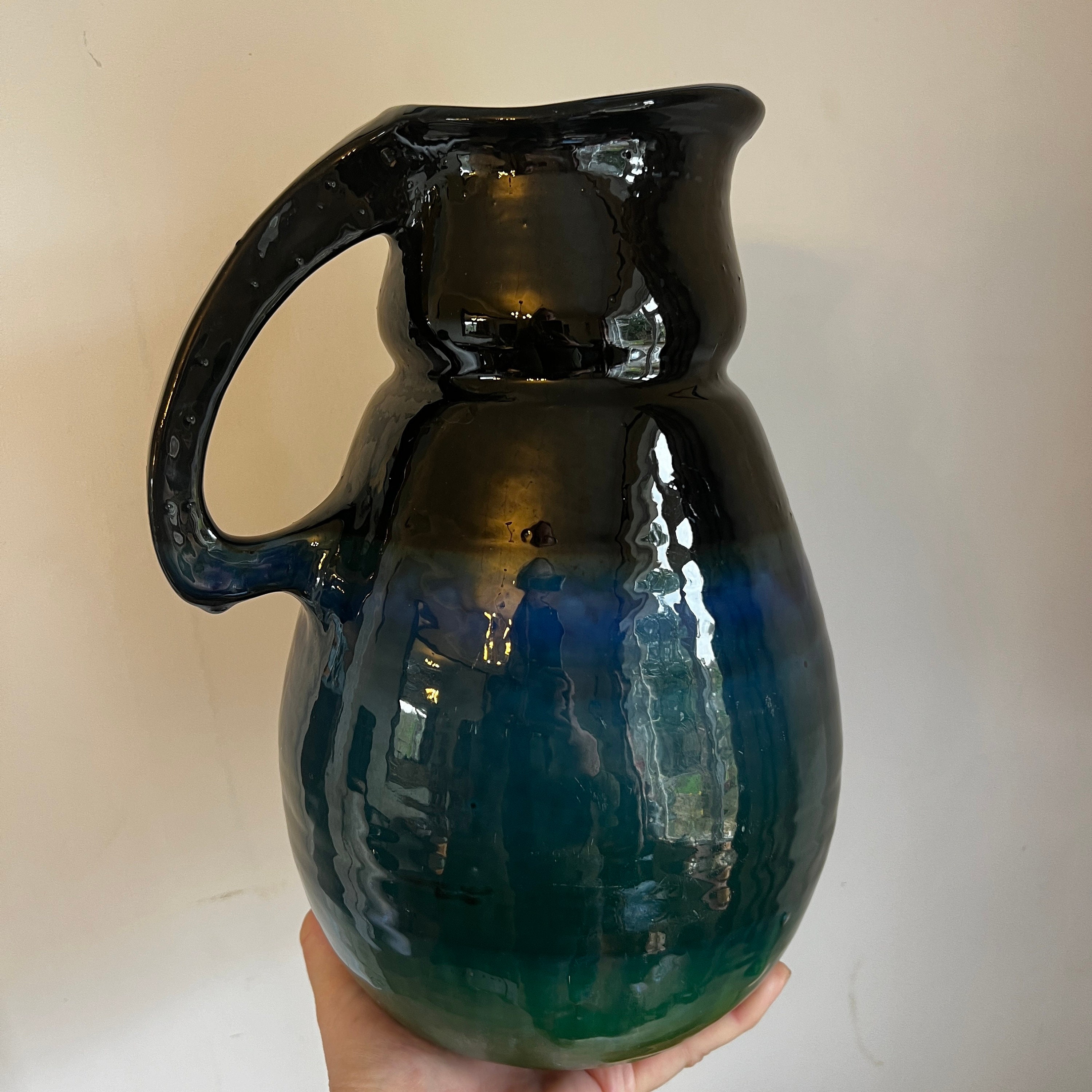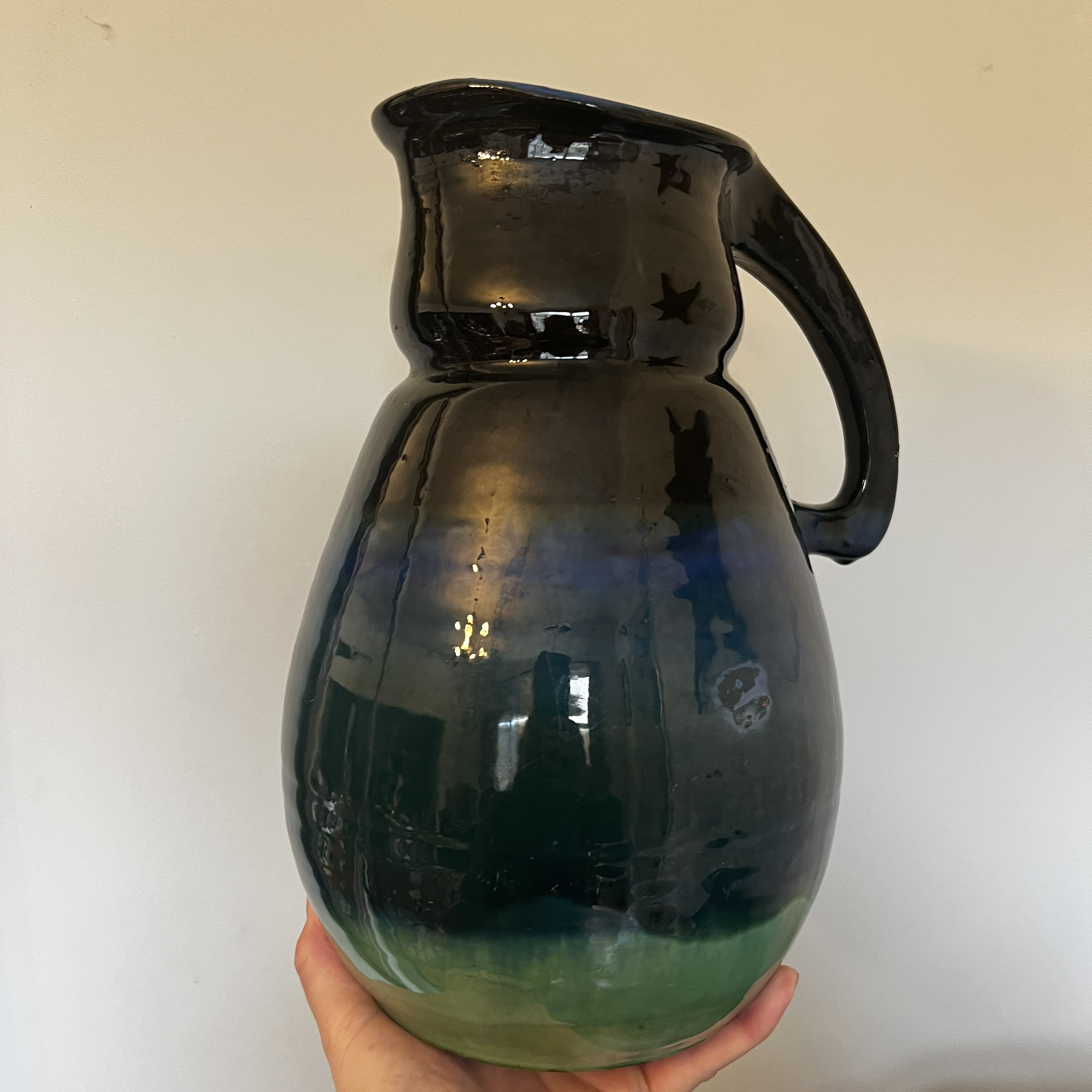 This stunning piece is made from a thick red clay and glazed in a bright blue inside. It has been glazed with layers of black, brown, blue and green on the outside and has a lovely organic and free flowing graduated colour. The photographs show it in natural sunlight and artificial light to show the colours. It looks most impressive when well lit to pick up all the colours and allow the lighter greens to pop. There is also a slight iridescent lustre on the outer glaze that shows up in bright light. This is a handmade and decorated piece and as such does have a few glaze manufacturing issues to point out. There is a little blip in the glaze on the handle, perhaps from the time of glaze dipping. There is also a large smudge in the glaze on the body where the glaze has been disturbed prior to firing. These can all be seen in the photographs.