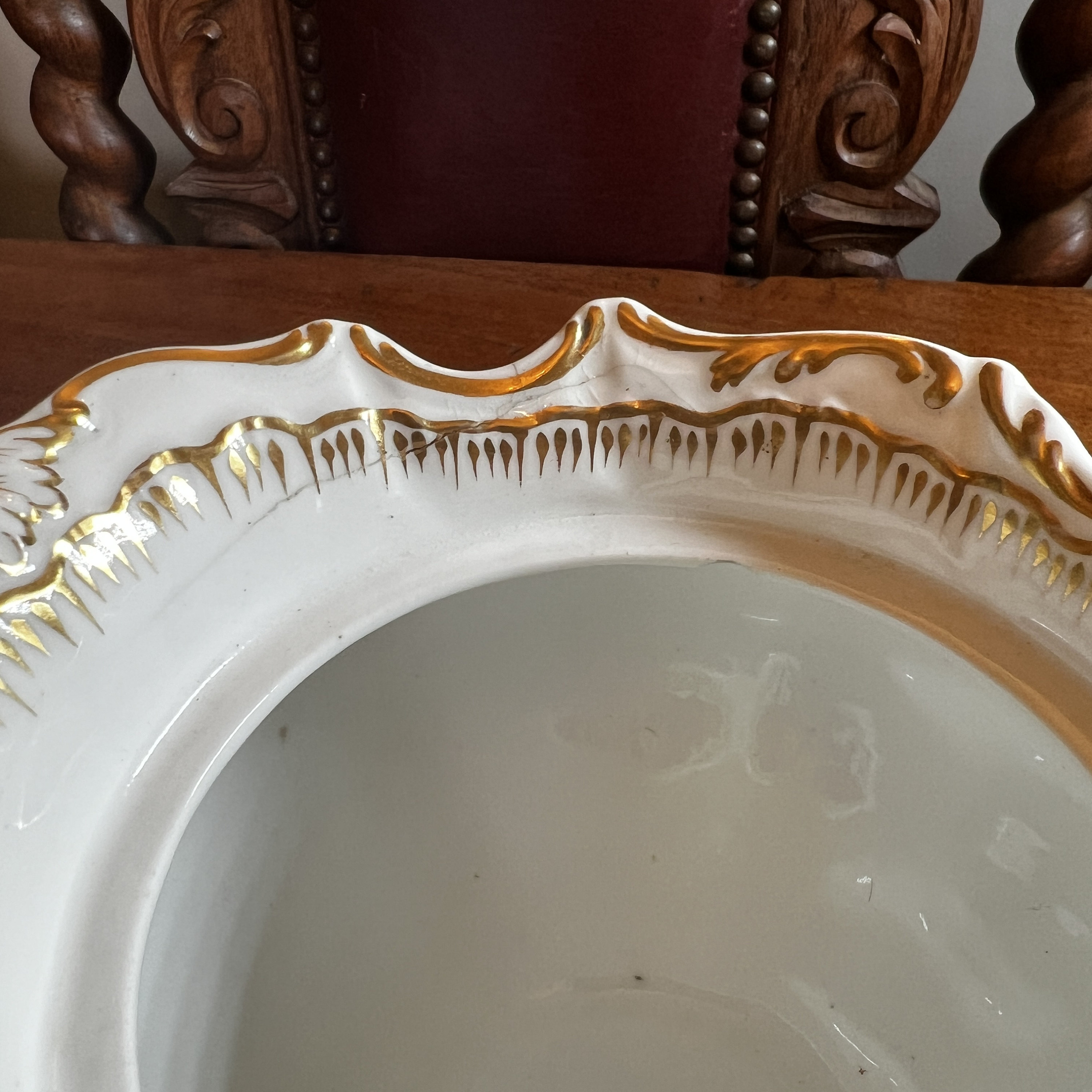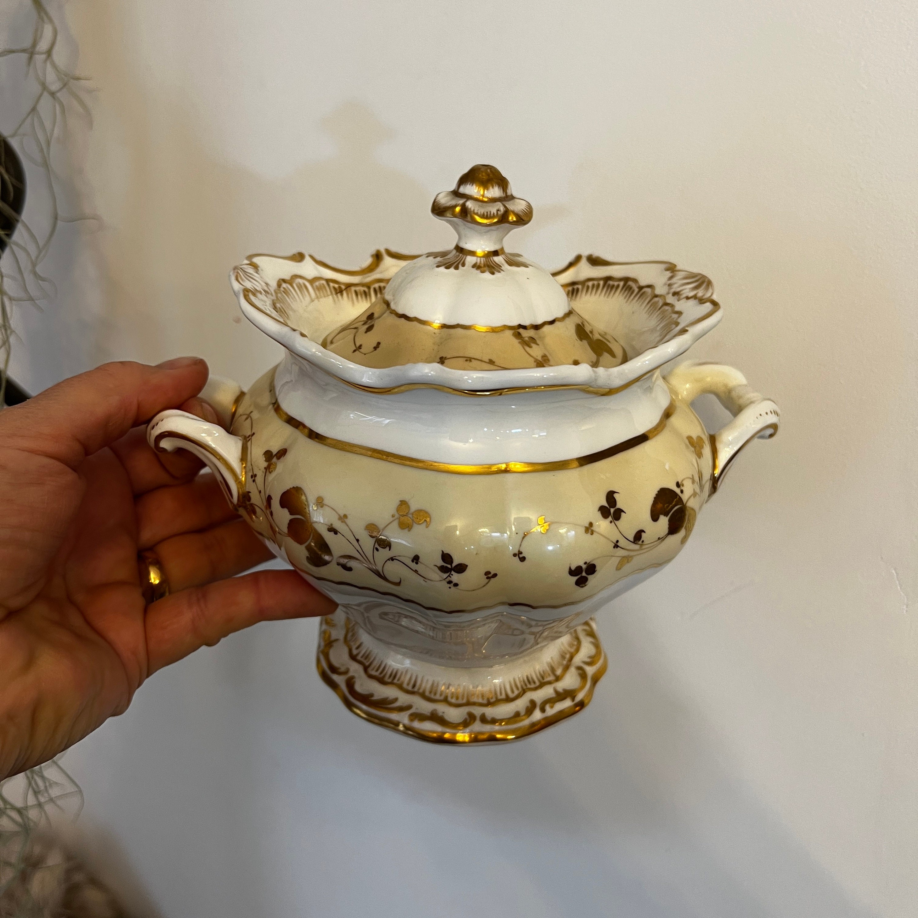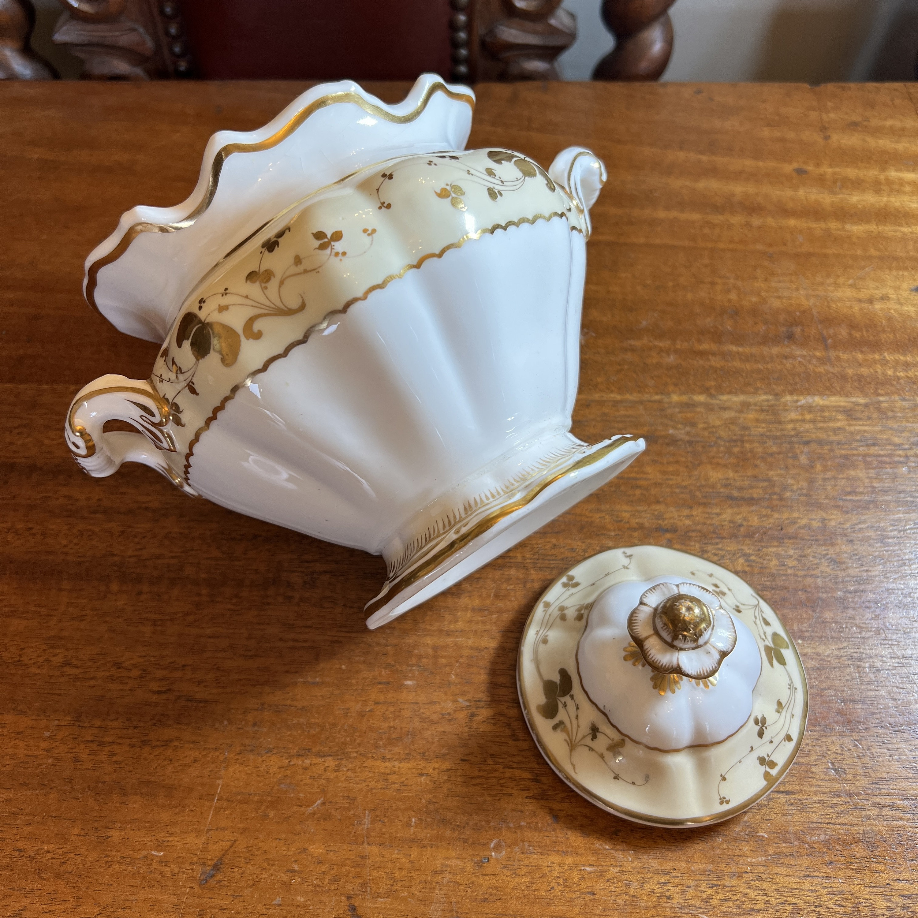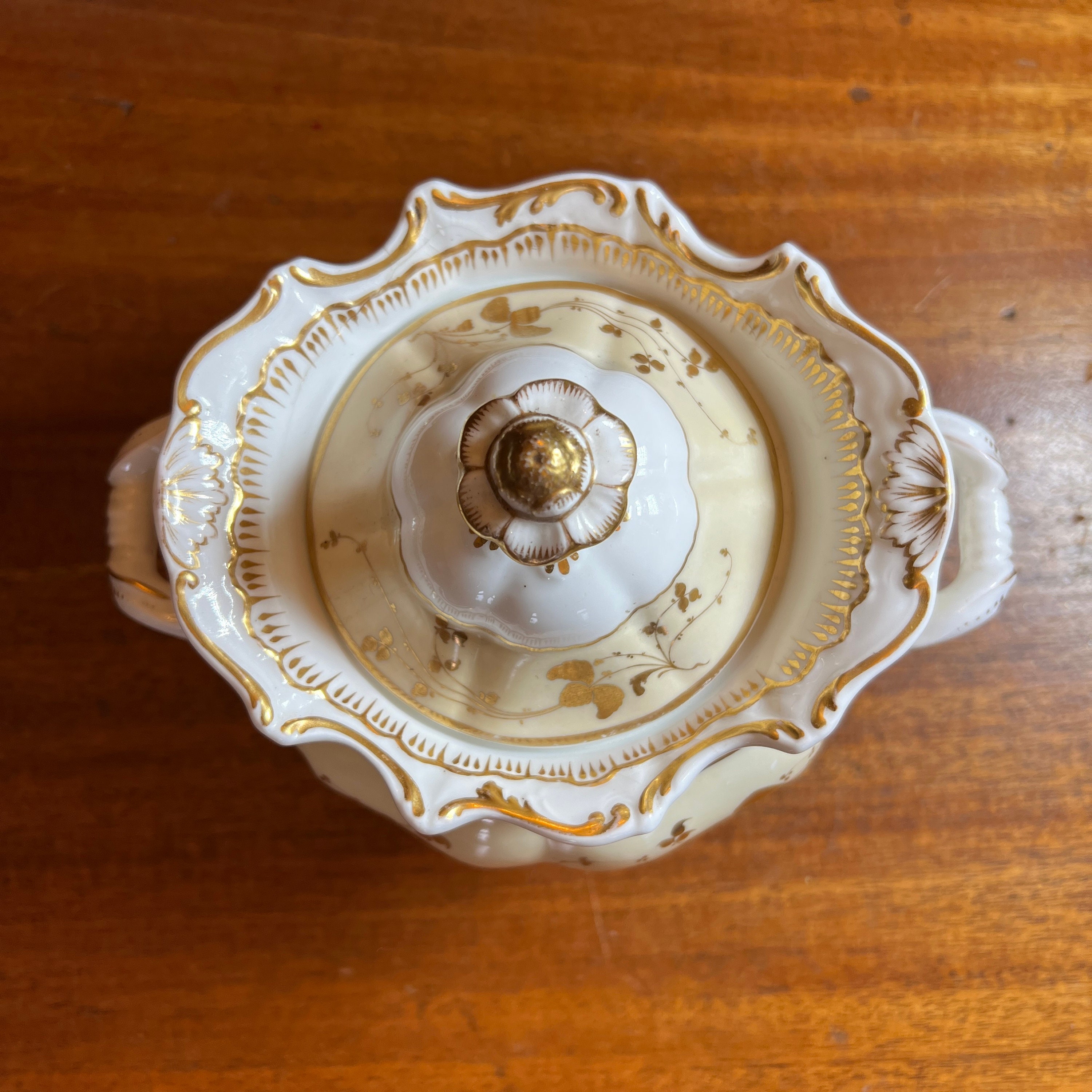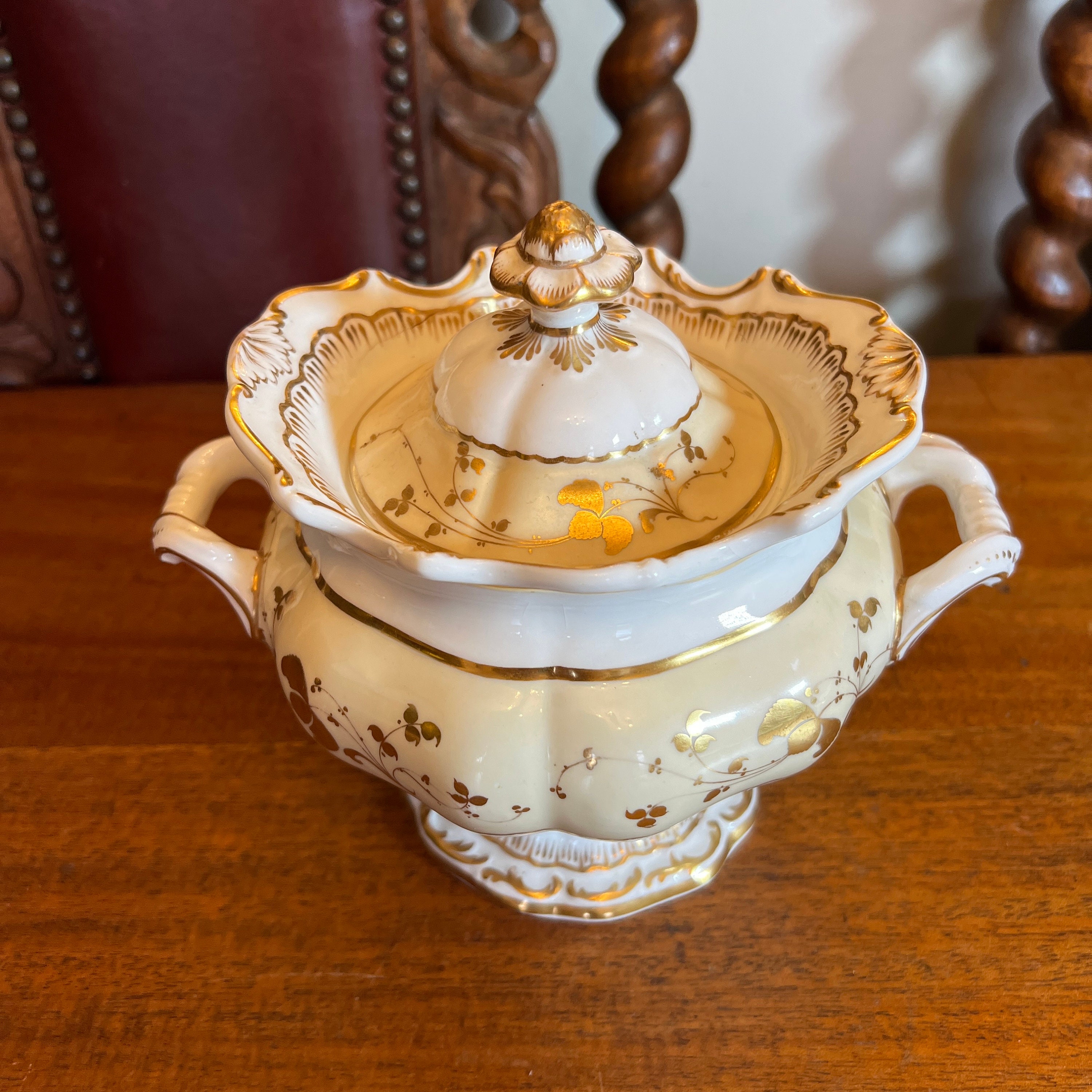 This beautiful item was created to be used as a large lidded sugar bowl, termed a sucrier. It has an elaborate shape with a sculpted pedestal foot and rim. The body of the pot is shaped and decorated with two pretty side handles. The lid is domed and deep set with an ornate finial on the top. The pot is decorated with a cream coloured band around the lid and widest part of the body and then quite intricately hand gilded to highlight the moulding and shape. It is very pretty, decorative and yet completely functional.