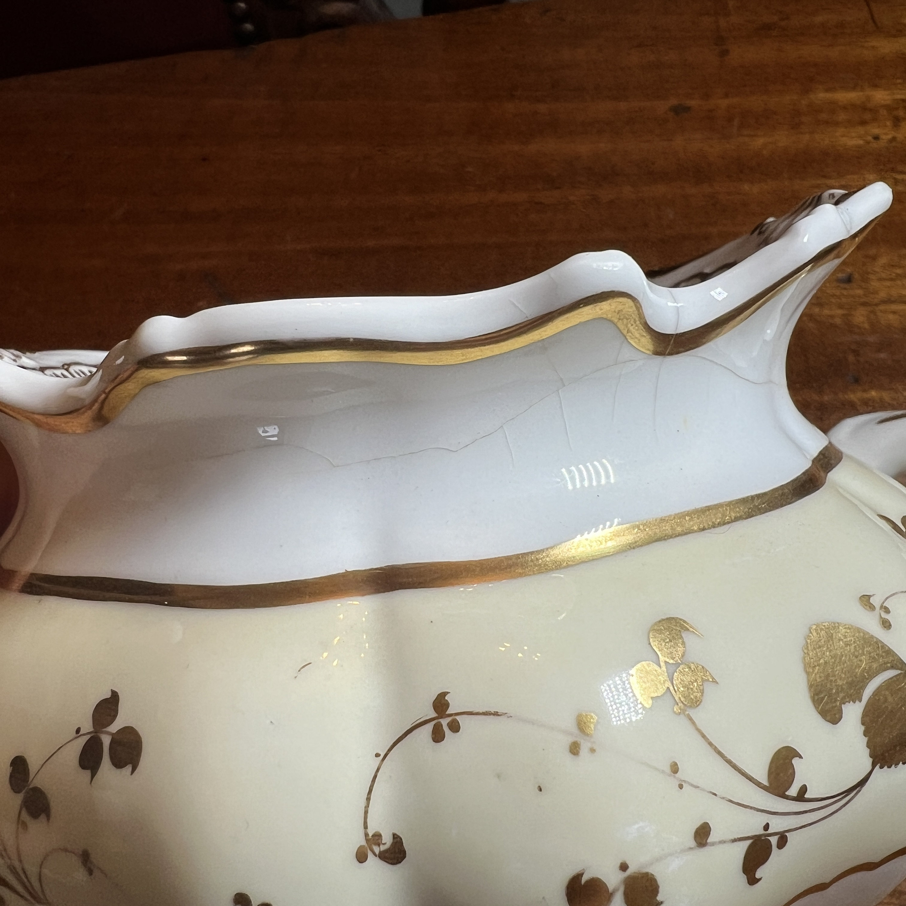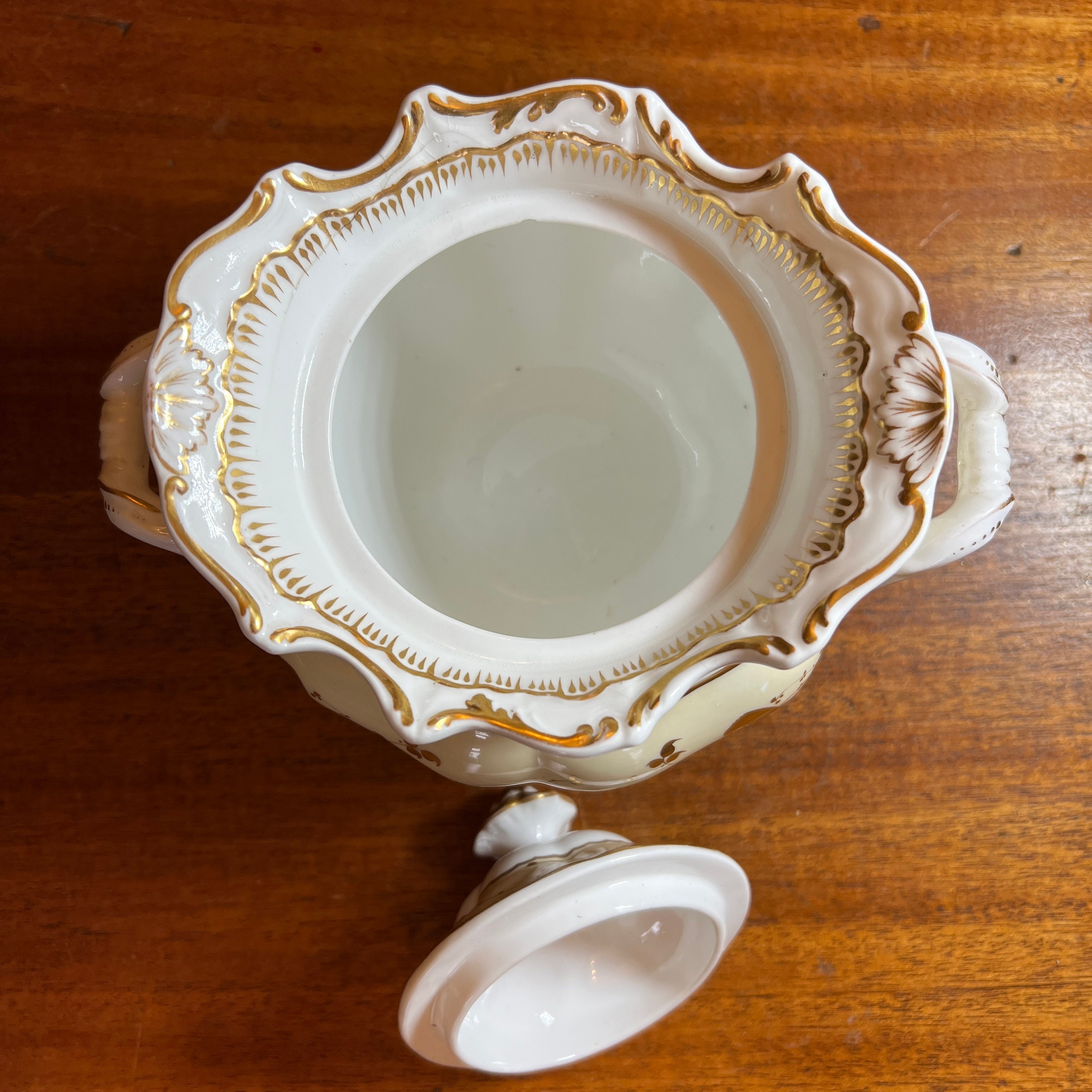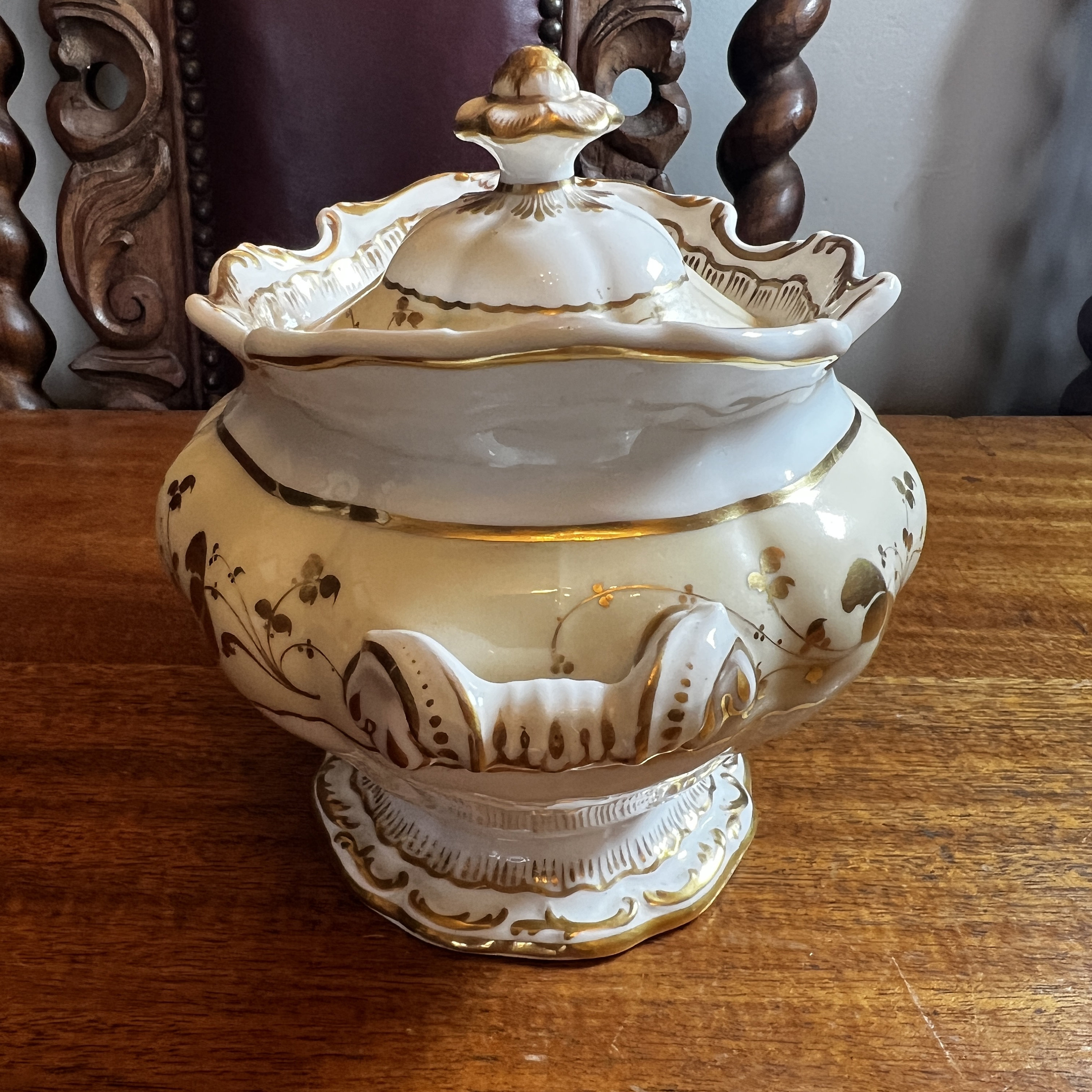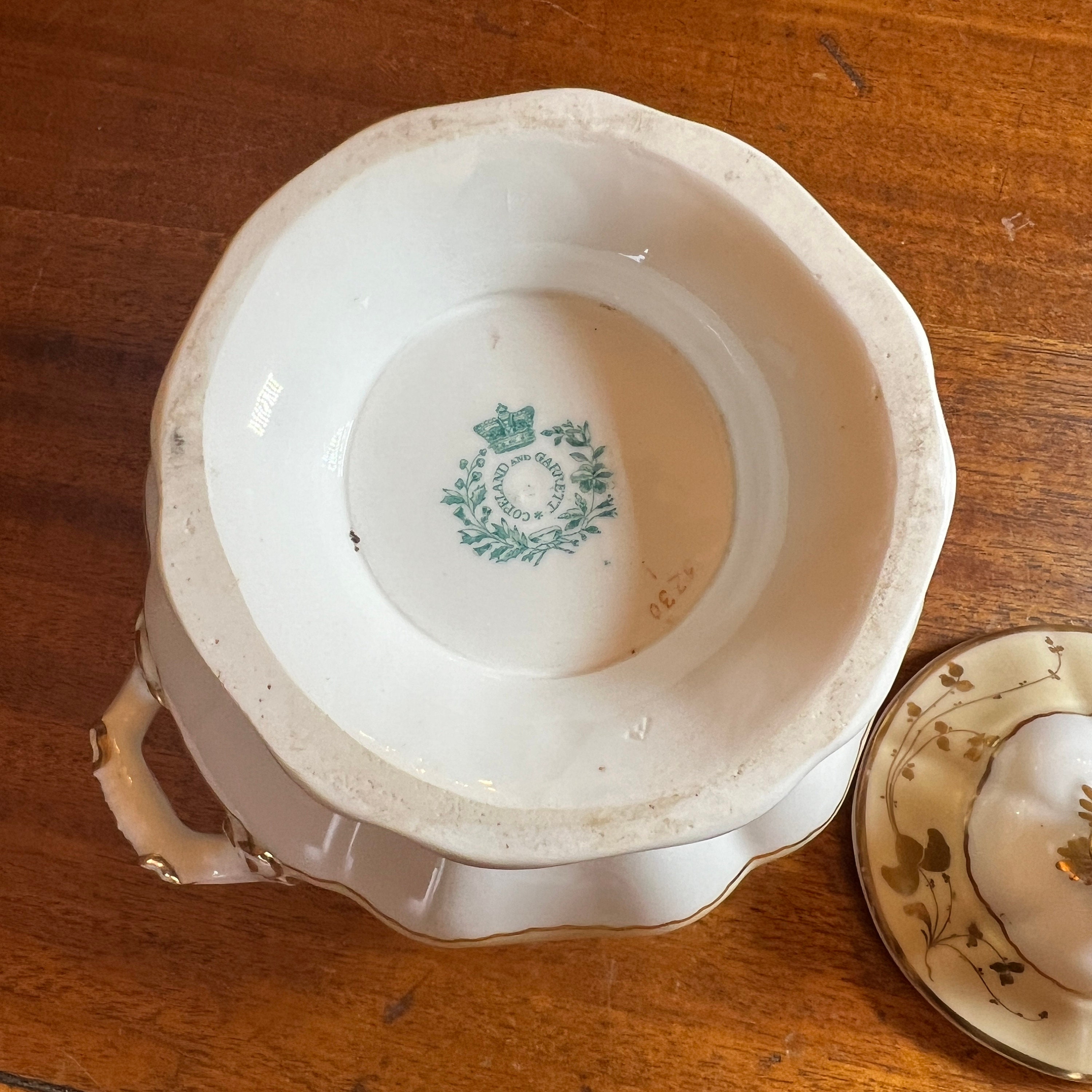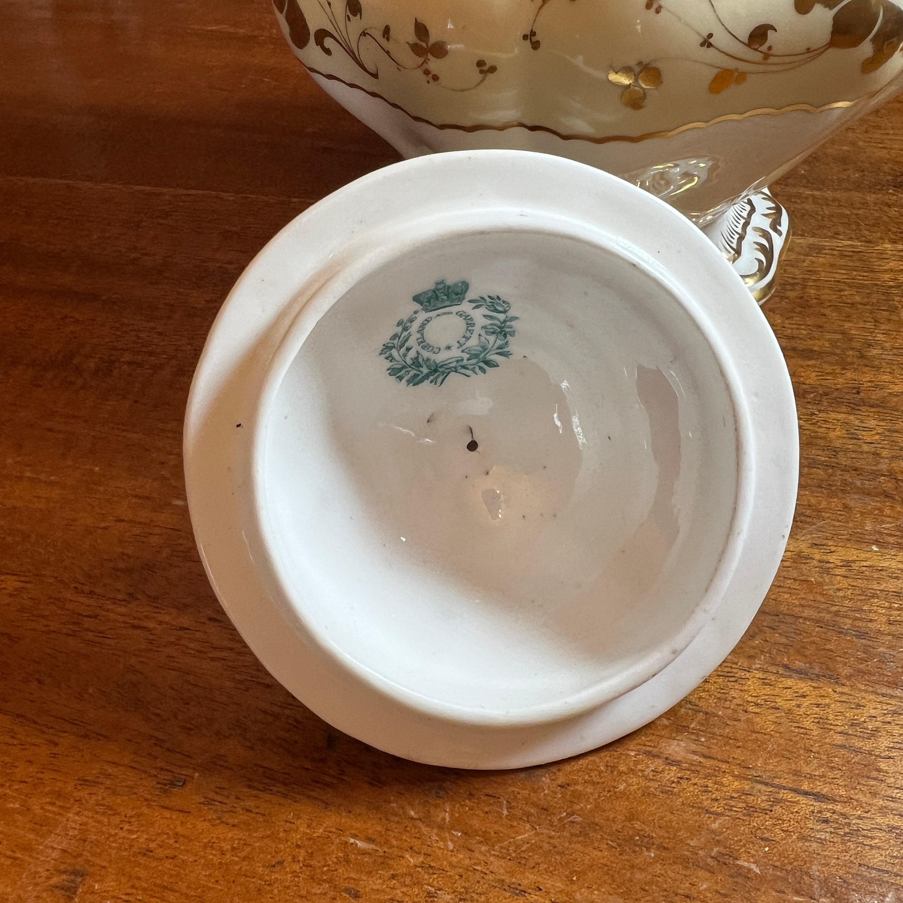 An elegant late Regency / Georgian / early Victorian era sucrier by Copeland and Garrett, England. The manufacturer's mark suggests this item was made between 1833 and 1847. Both the inner lid and base are stamped. There is also a hand written number in gold on the base.