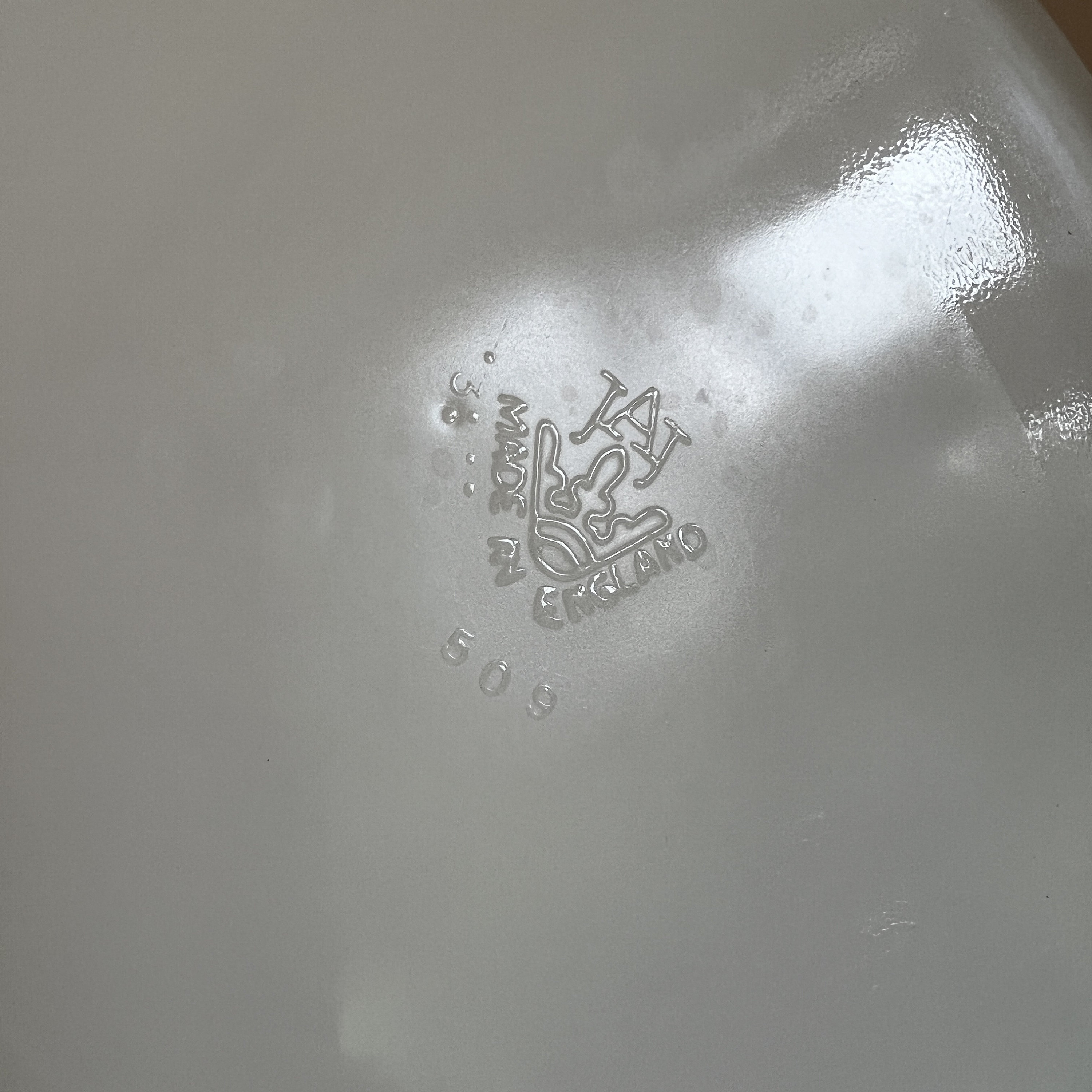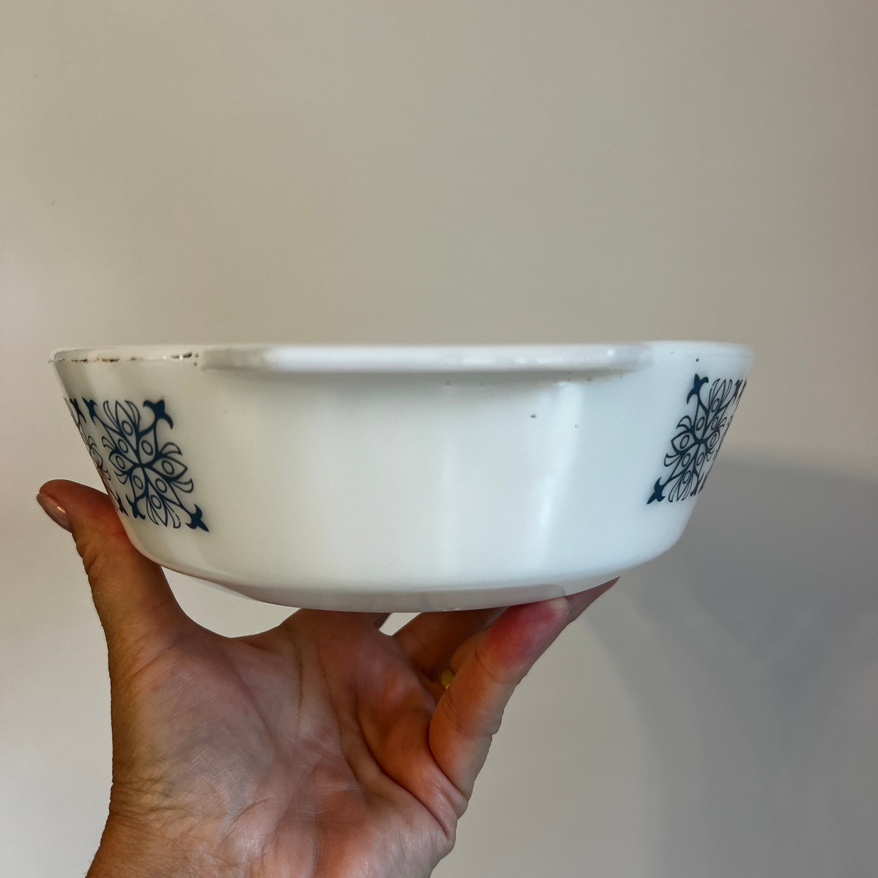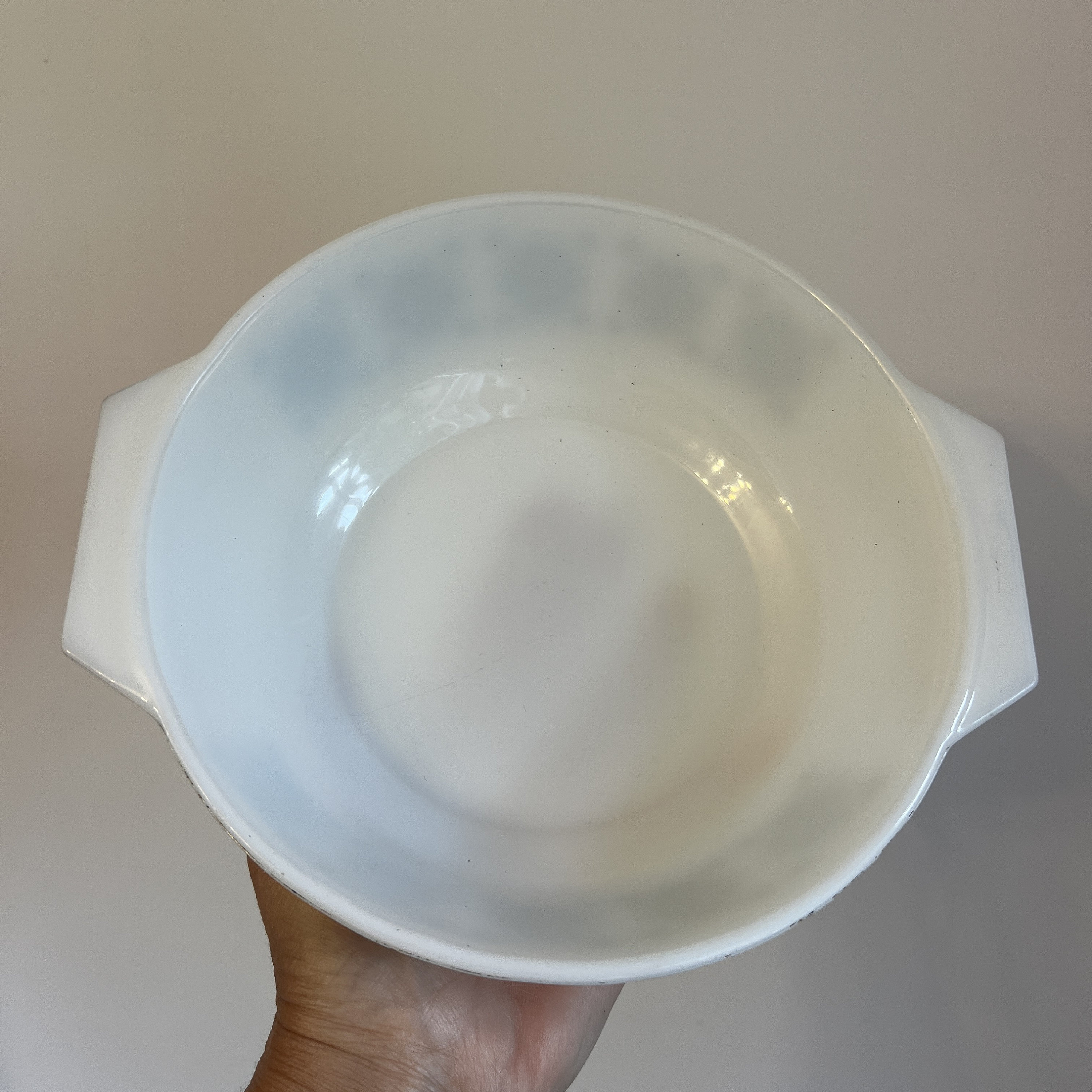 Lovely 1960's-70's English white Pyrex round oven to tableware dish by JAJ (James A. Jobling) in their lovely Chelsea design. This pretty dish holds approximately 1150ml and is in good vintage condition. There is some baked on discolouration in the fine moulded seams of the glassware, but it is in clean condition.