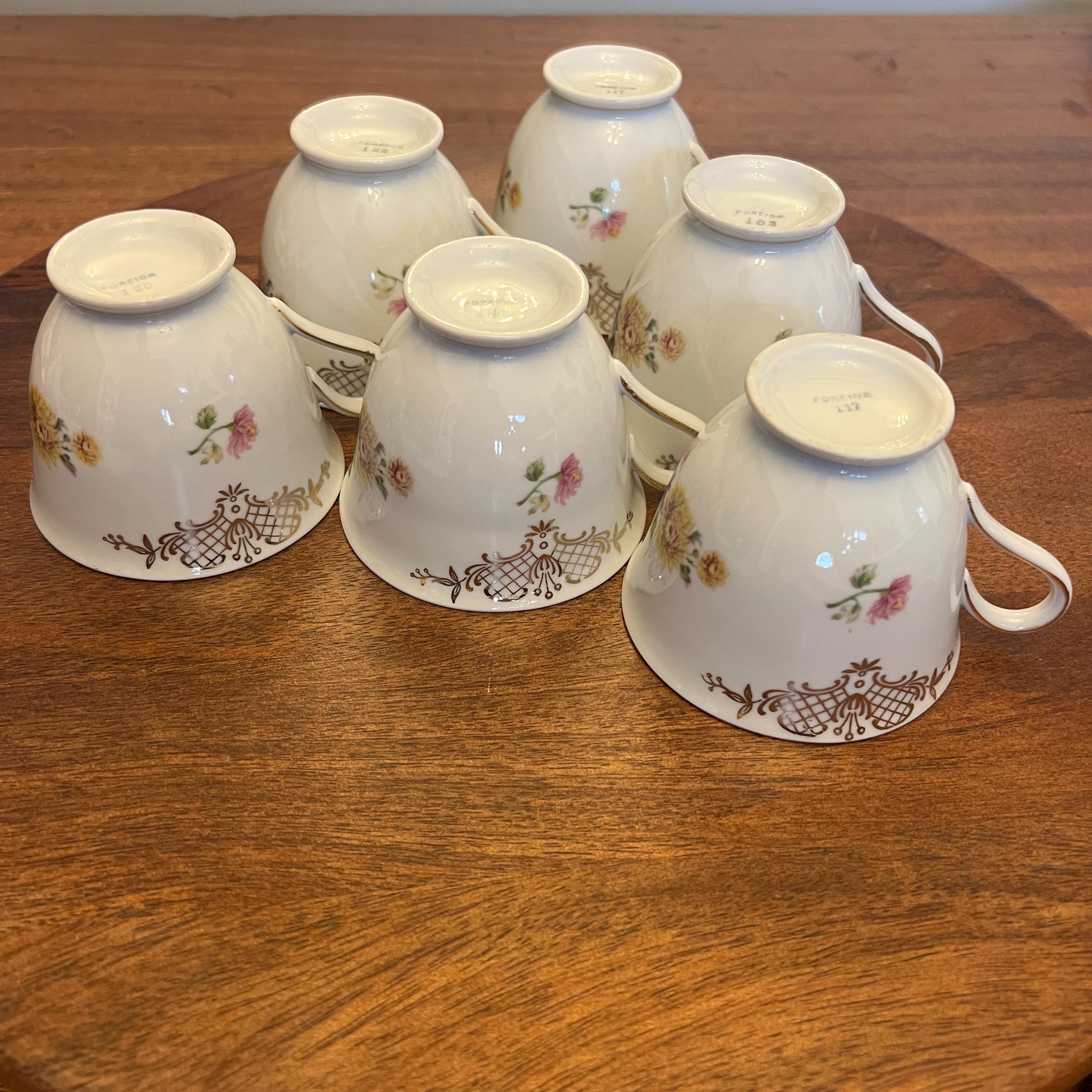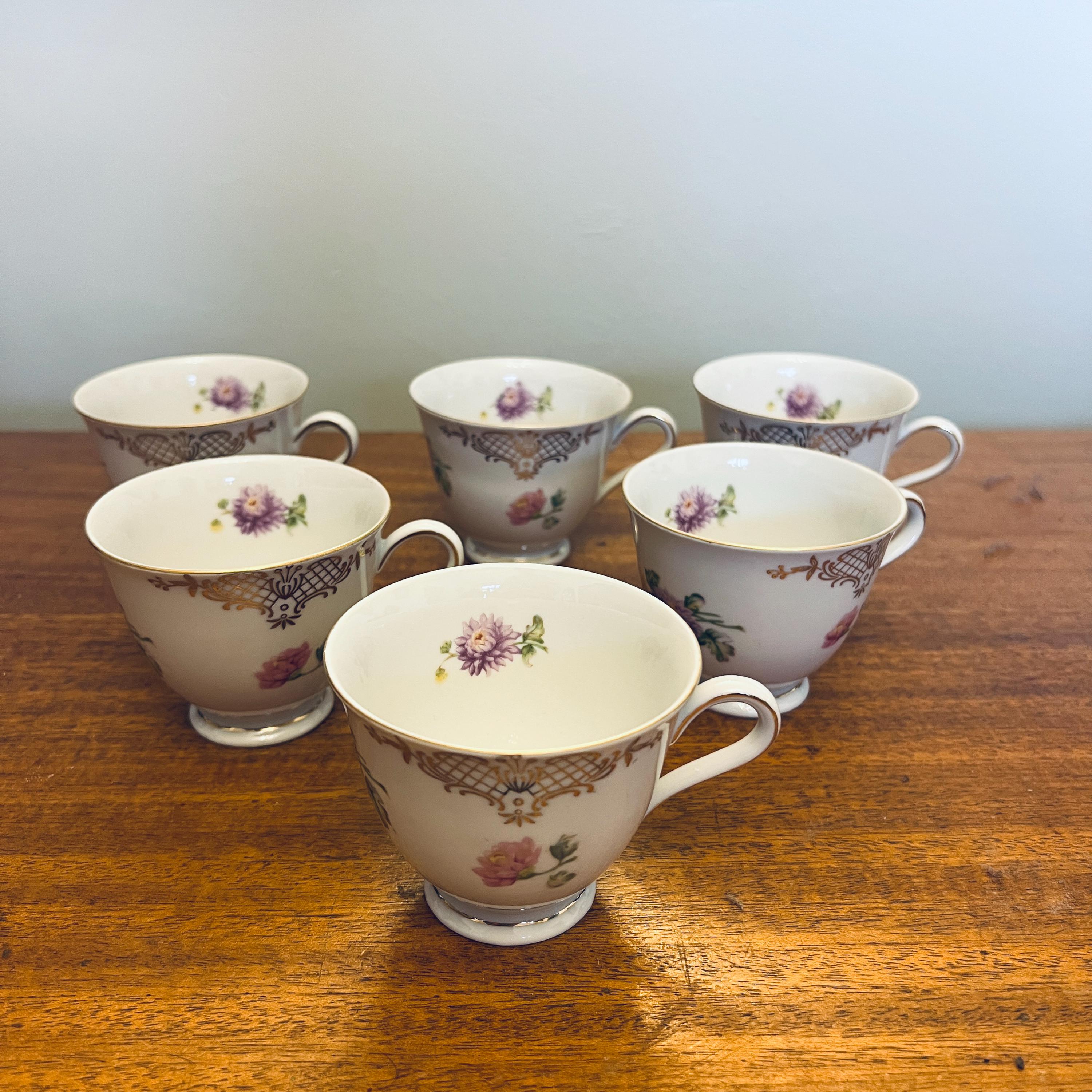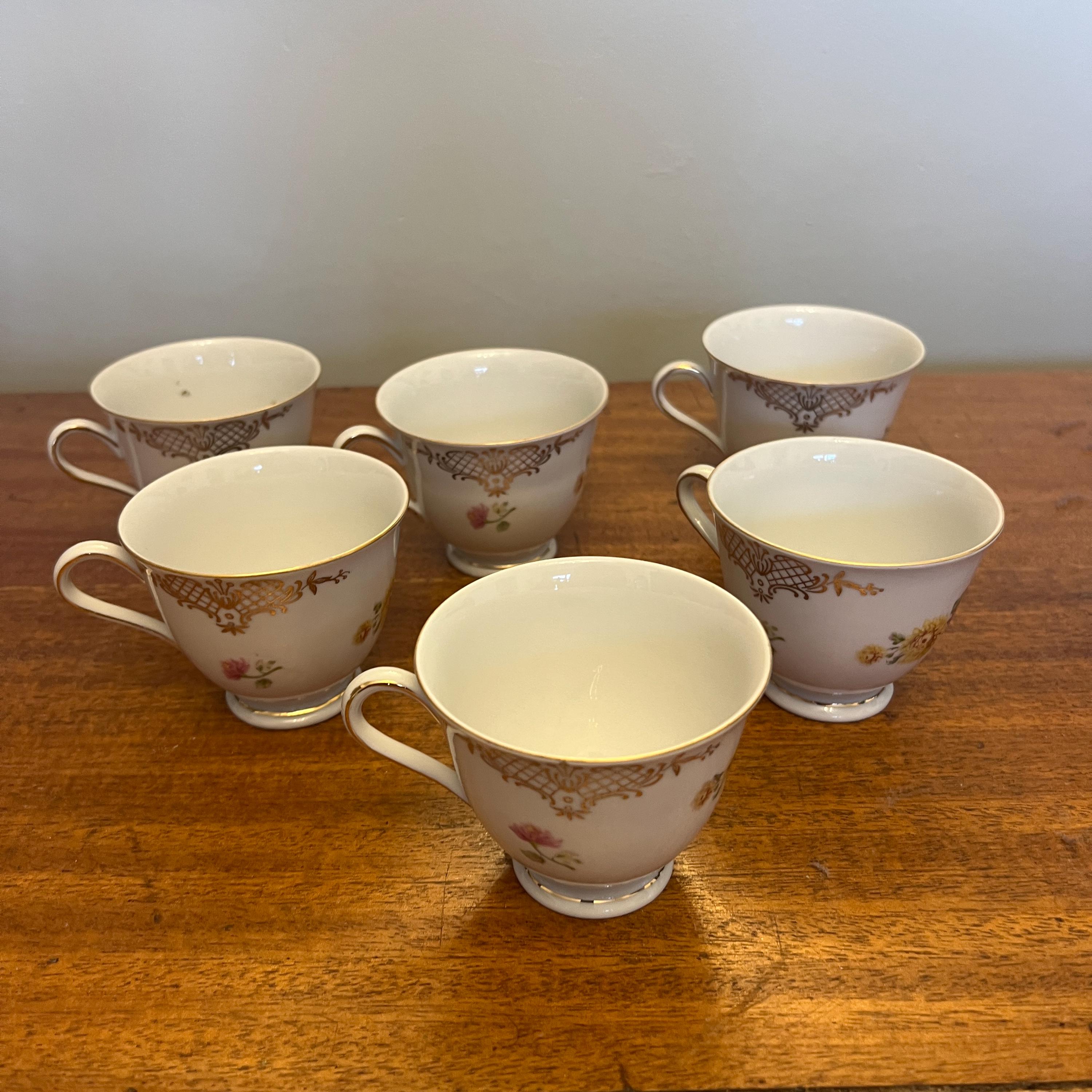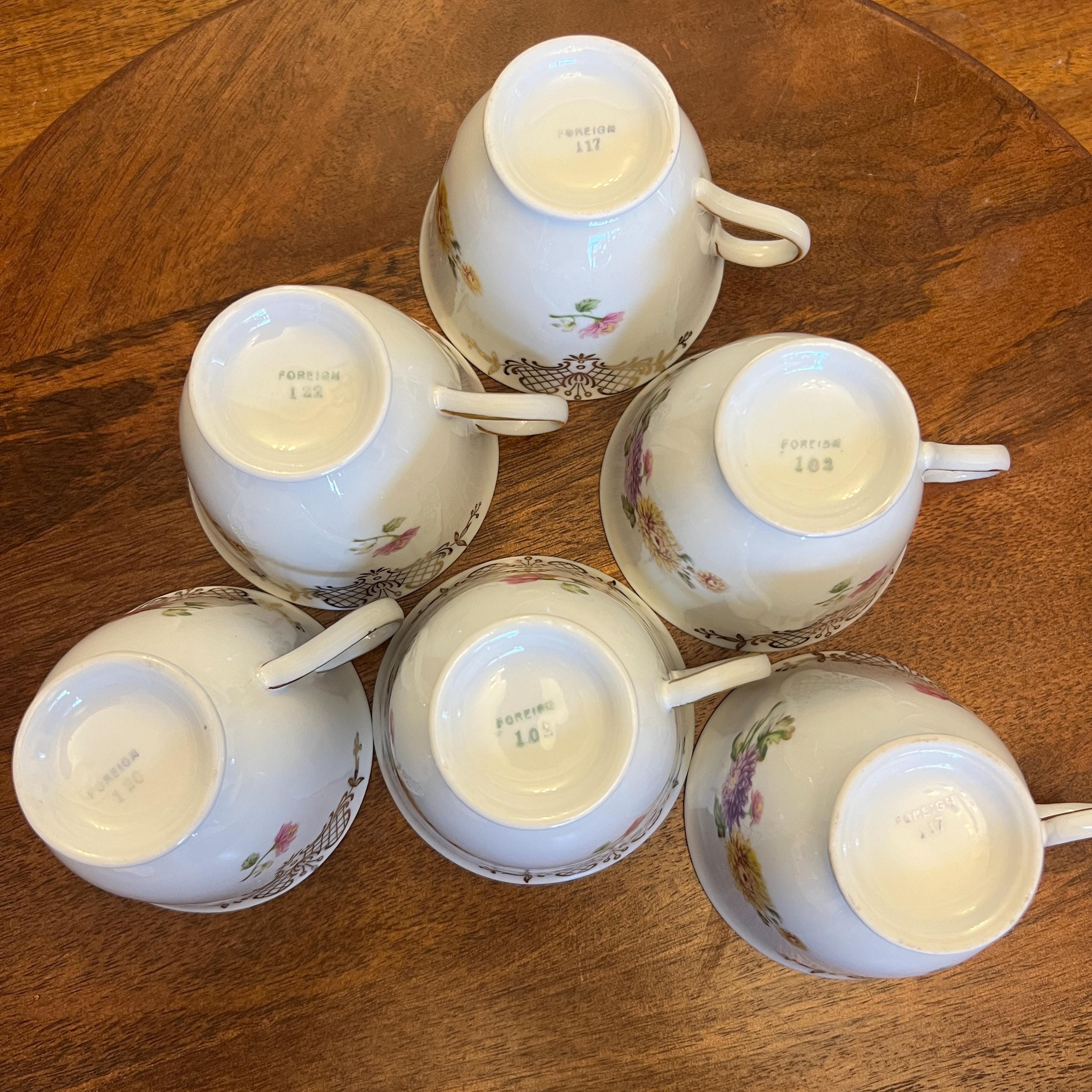 A set of 6 lovely vintage, pedestal footed, china tea cups. These lovely cups do not have their matching saucers but are dainty and elegant to use on their own. They are decorated with a pretty floral transfer design, with golden gilding and are marked 'Foreign' on the base. The maker and age are unknown, although they are thought to date to the mid 20th Century. The cups are all in good condition with no damage or cracks. These are vintage and have been used, so there is some slight wear to the gilding on the rims in places. Please note that one cup has a couple of golden gilding spots inside the cup where the painter had not cleaned up a drip and similarly a few slight miss strokes of gilding around the rim of one or two cups. This can be seen in the photographs.
