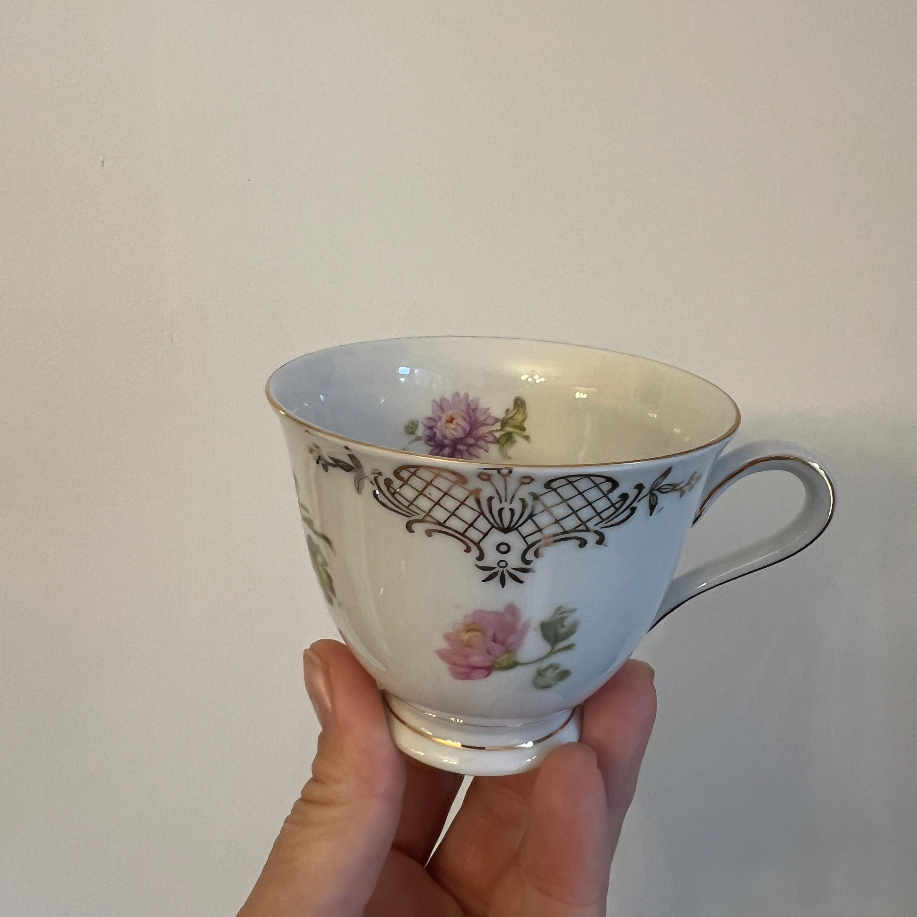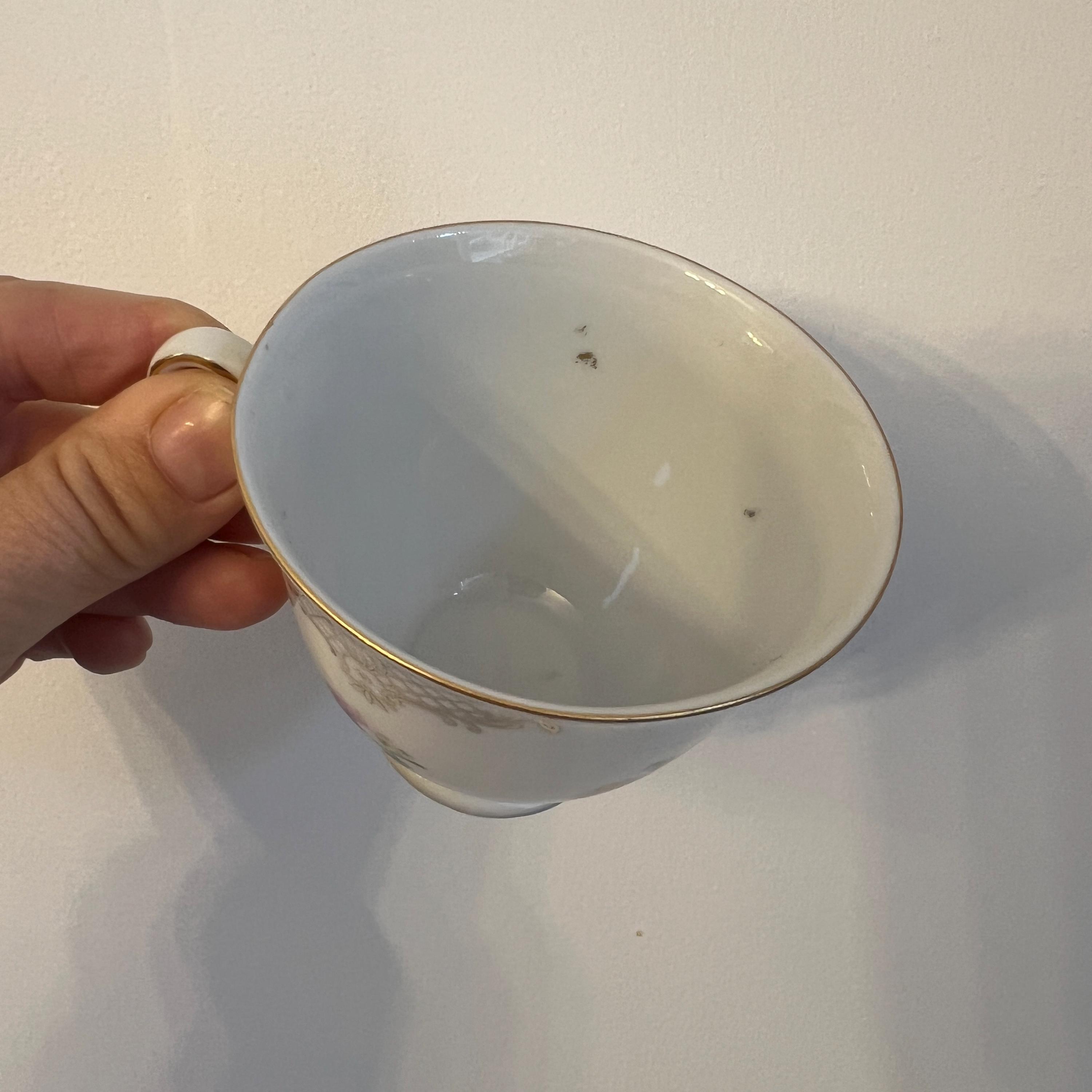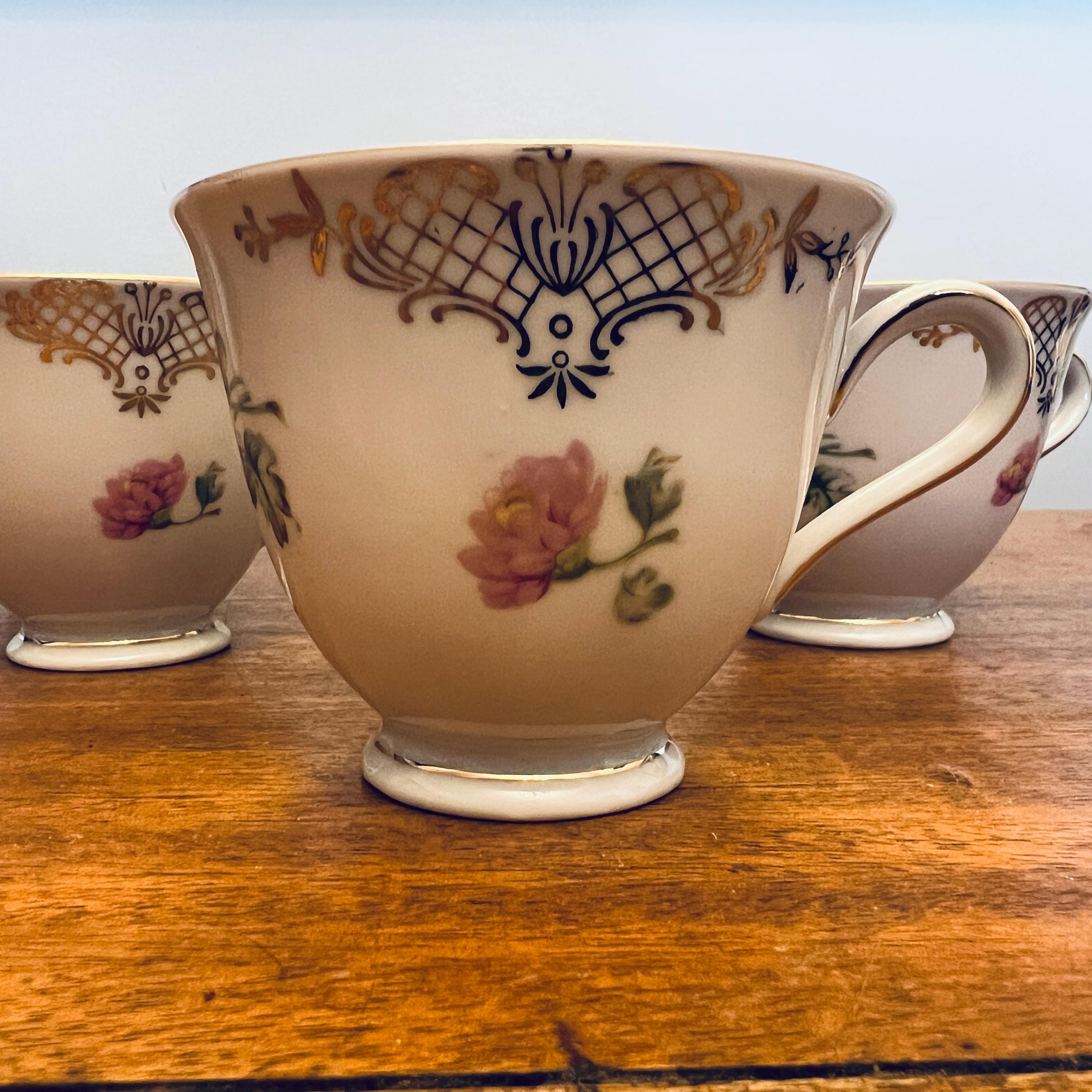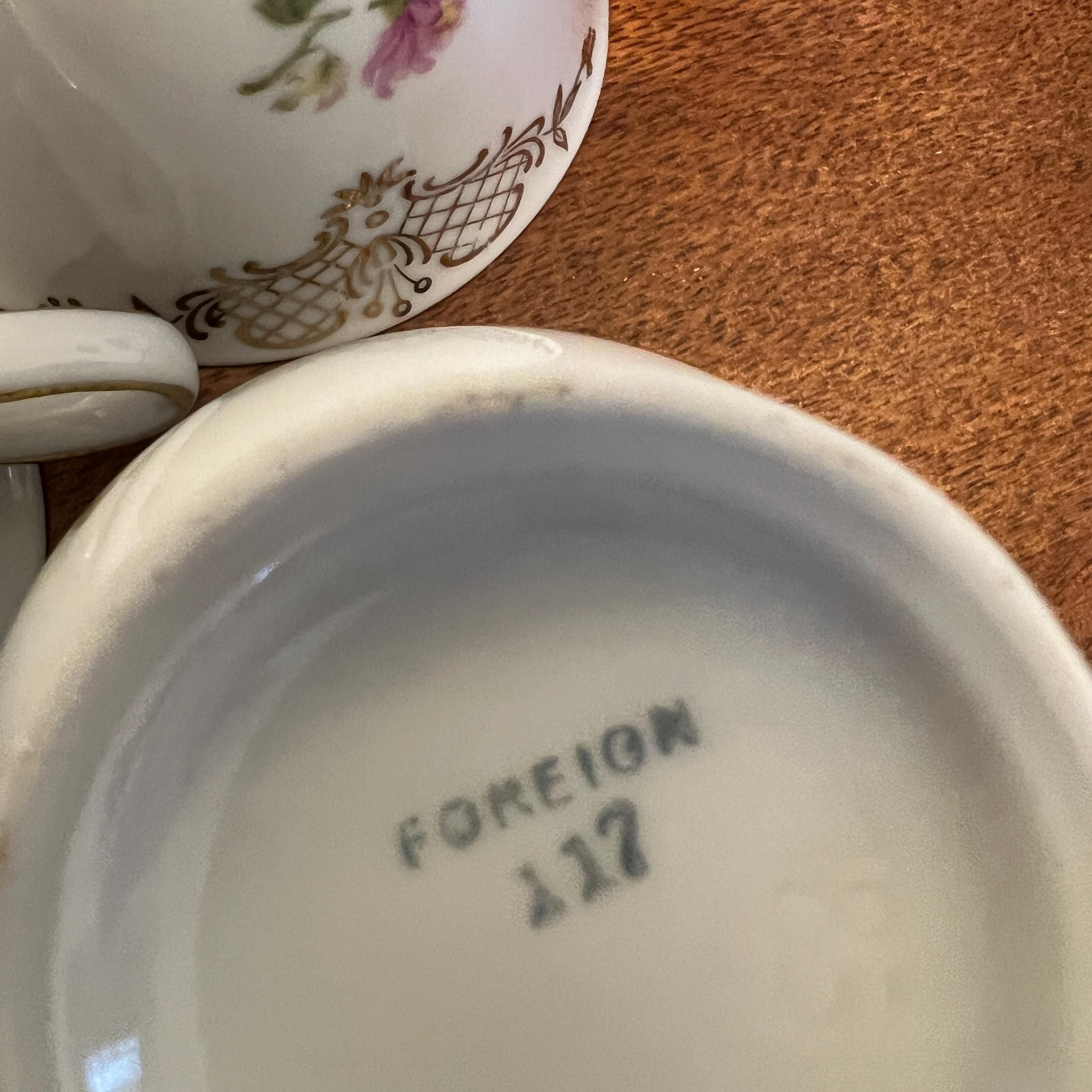 A set of 6 lovely vintage, pedestal footed, china tea cups. These lovely cups do not have their matching saucers but are dainty and elegant to use on their own. They are decorated with a pretty floral transfer design, with golden gilding and are marked 'Foreign' on the base. The maker and age are unknown, although they are thought to date to the mid 20th Century. The cups are all in good condition with no damage or cracks. These are vintage and have been used, so there is some slight wear to the gilding on the rims in places. Please note that one cup has a couple of golden gilding spots inside the cup where the painter had not cleaned up a drip and similarly a few slight miss strokes of gilding around the rim of one or two cups. This can be seen in the photographs.