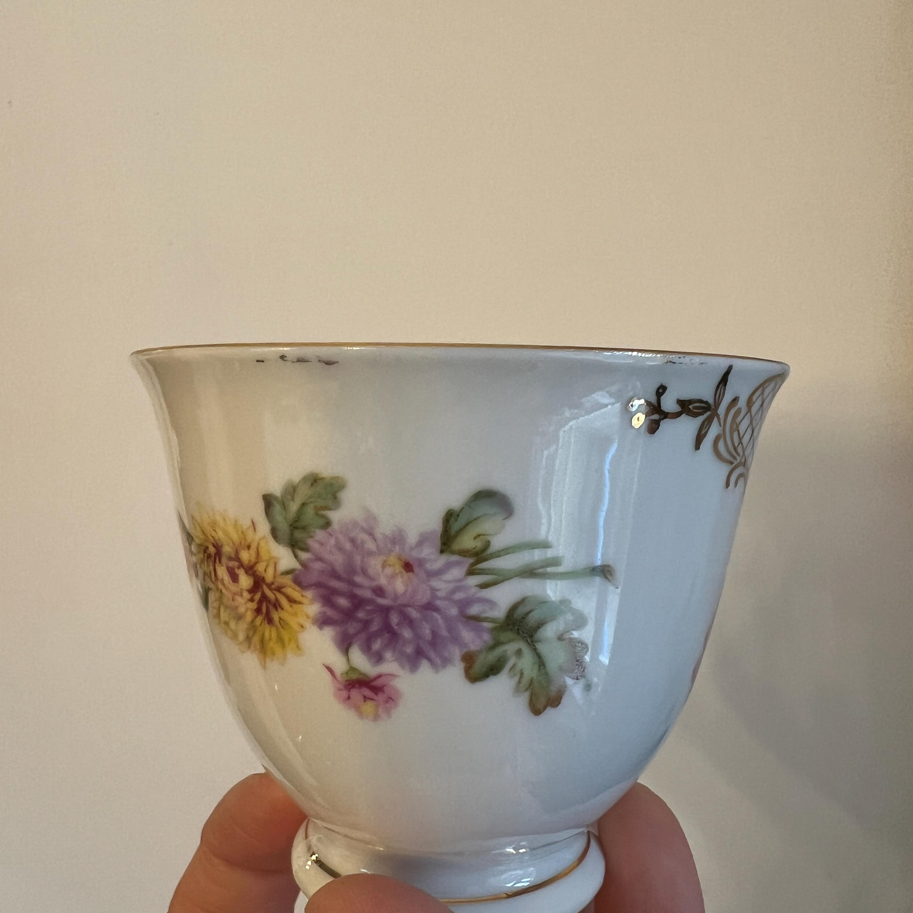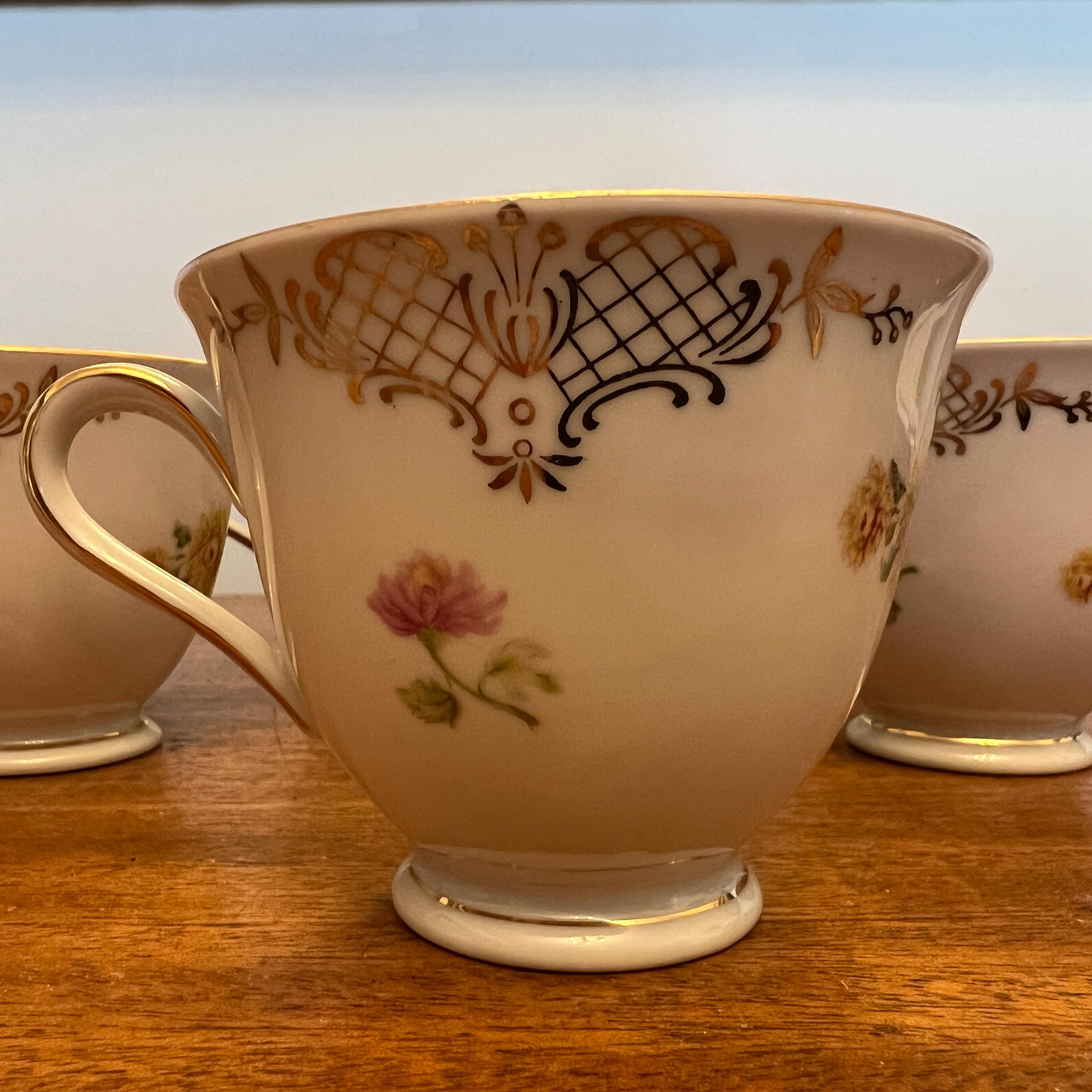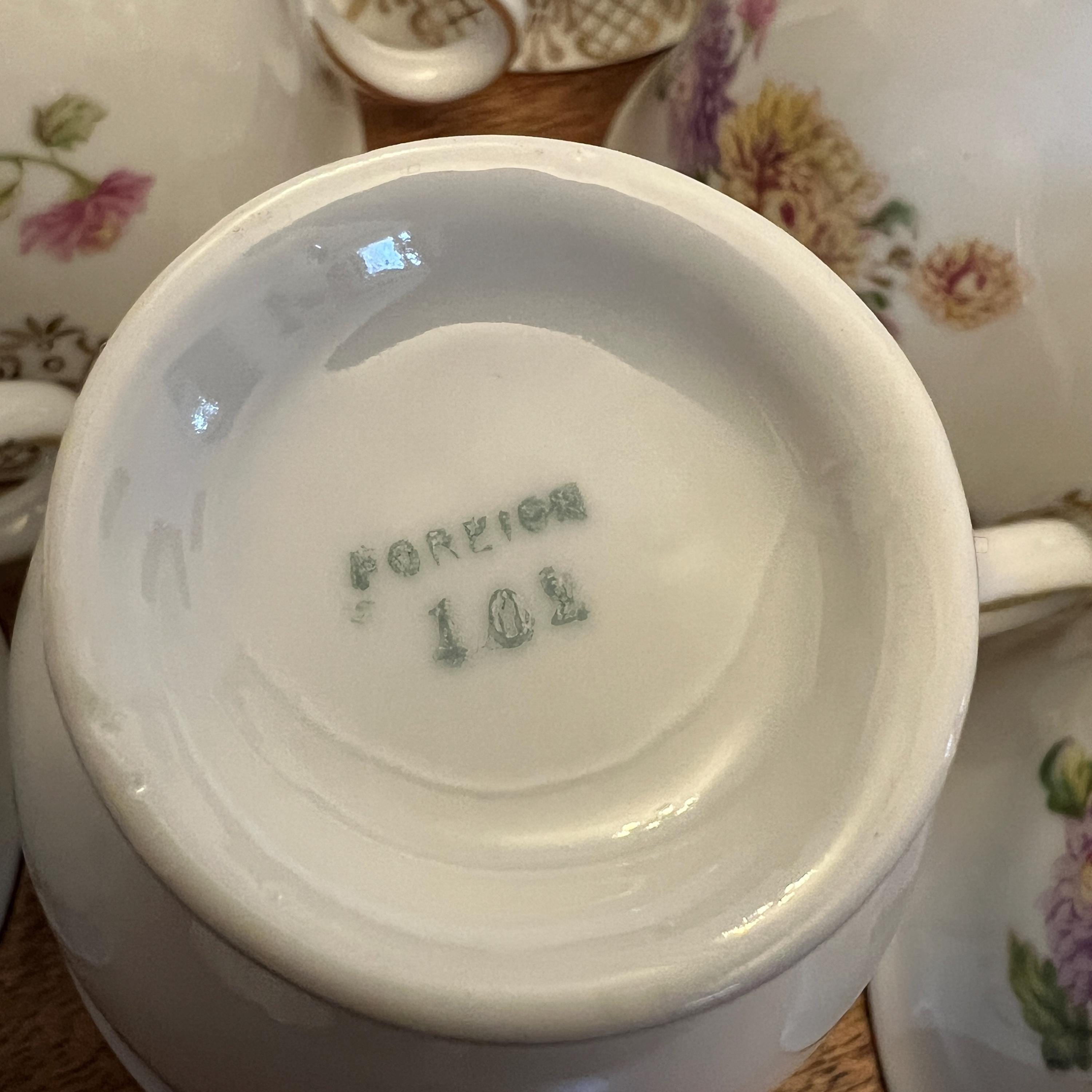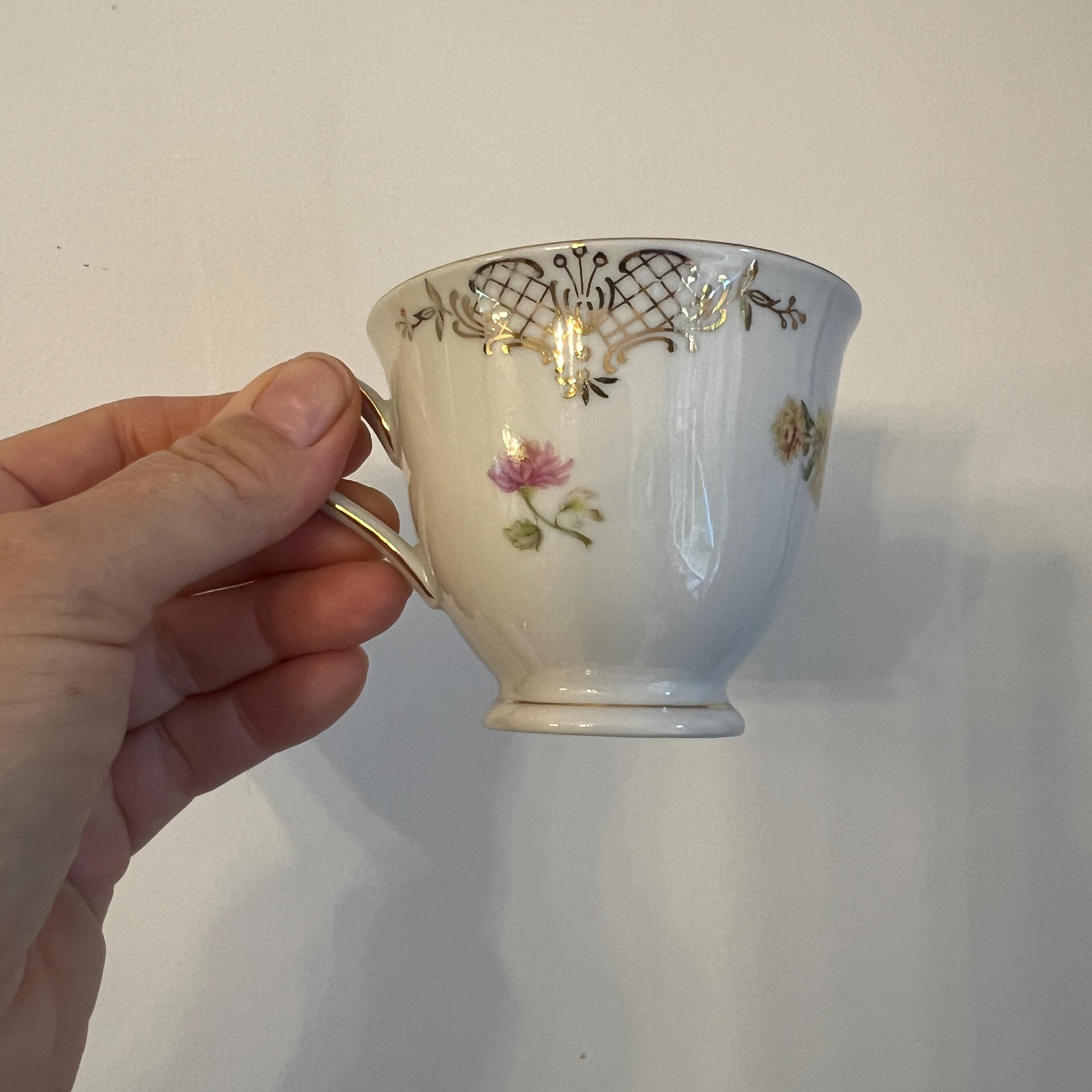 A set of 6 lovely vintage, pedestal footed, china tea cups. These lovely cups do not have their matching saucers but are dainty and elegant to use on their own. They are decorated with a pretty floral transfer design, with golden gilding and are marked 'Foreign' on the base. The maker and age are unknown, although they are thought to date to the mid 20th Century. The cups are all in good condition with no damage or cracks. These are vintage and have been used, so there is some slight wear to the gilding on the rims in places. Please note that one cup has a couple of golden gilding spots inside the cup where the painter had not cleaned up a drip and similarly a few slight miss strokes of gilding around the rim of one or two cups. This can be seen in the photographs.