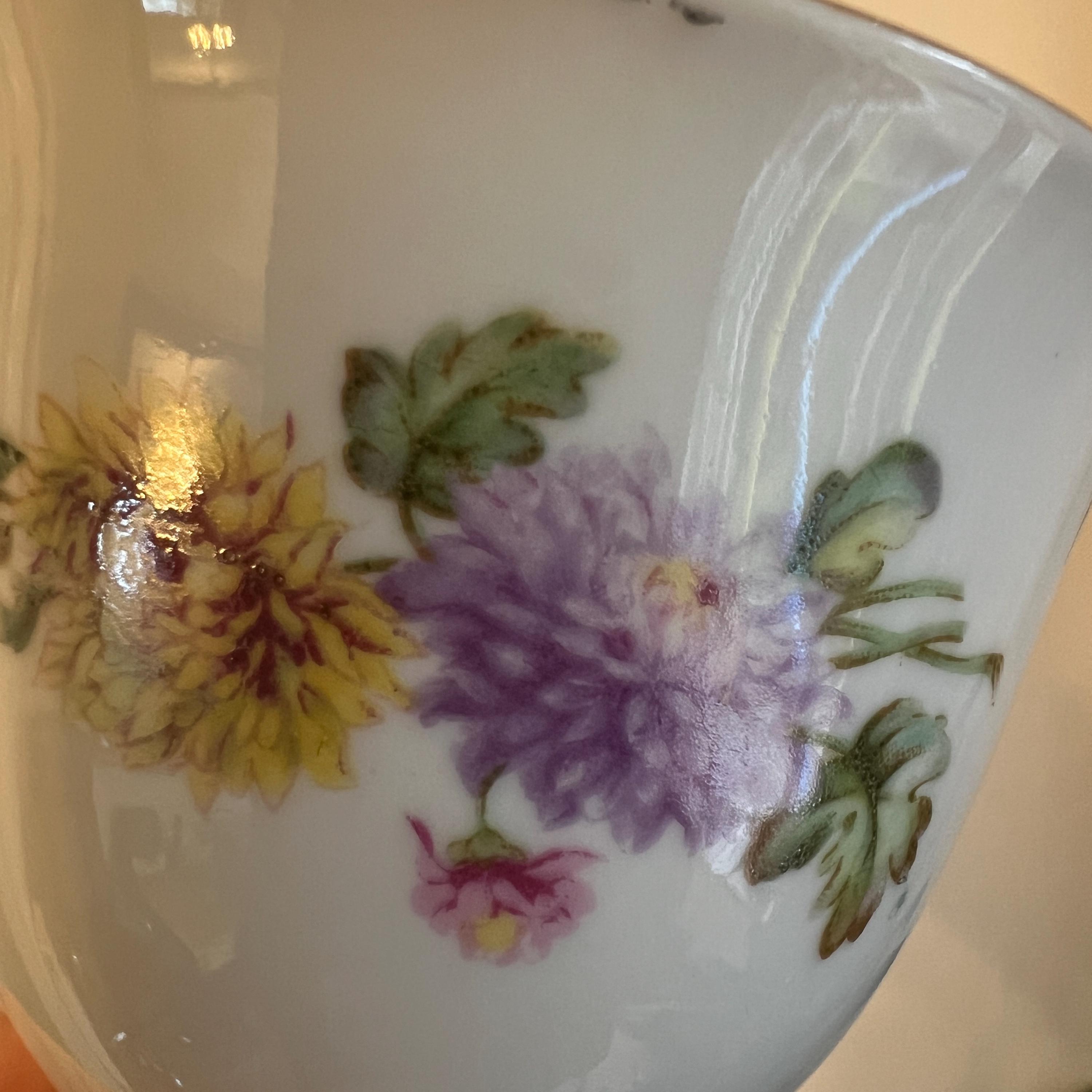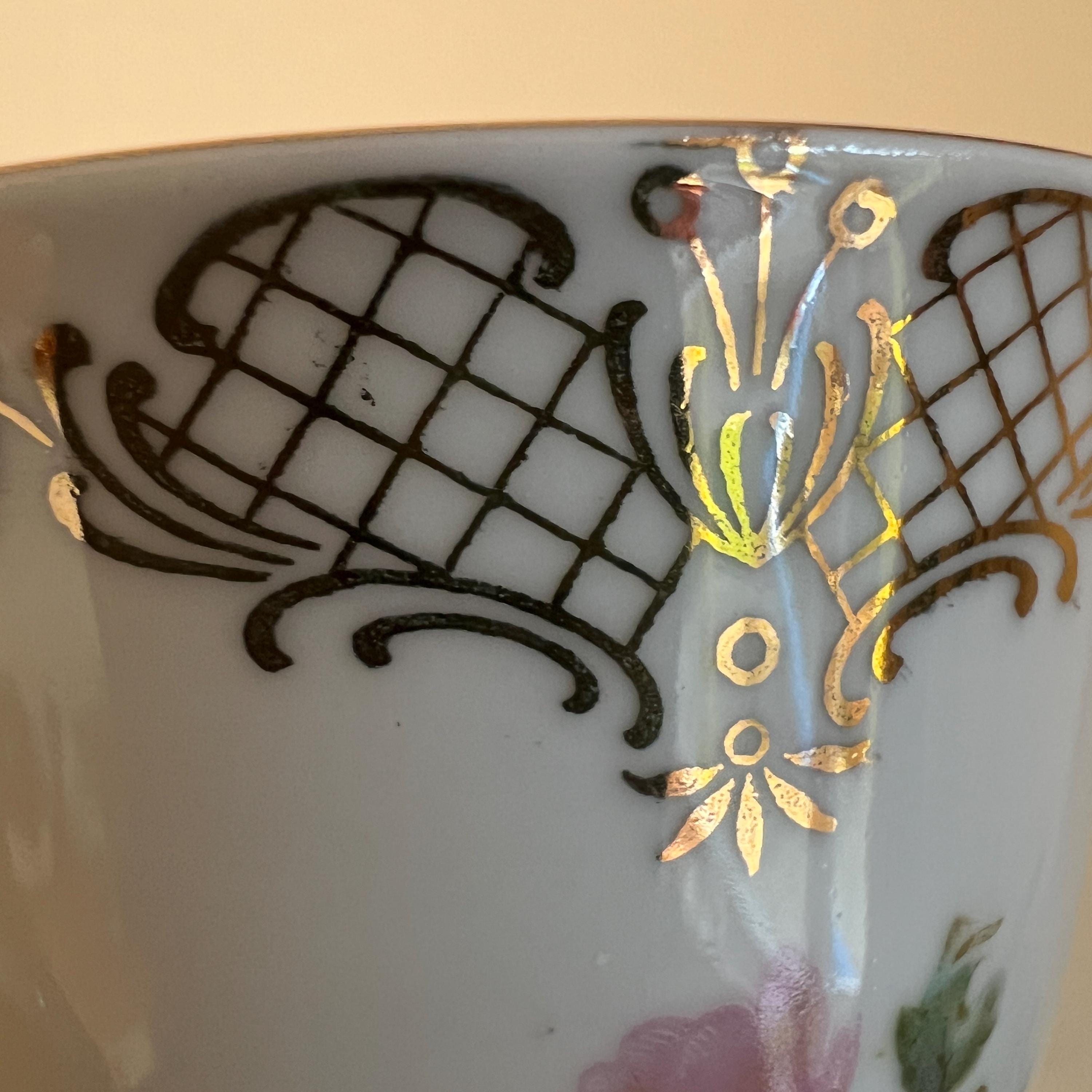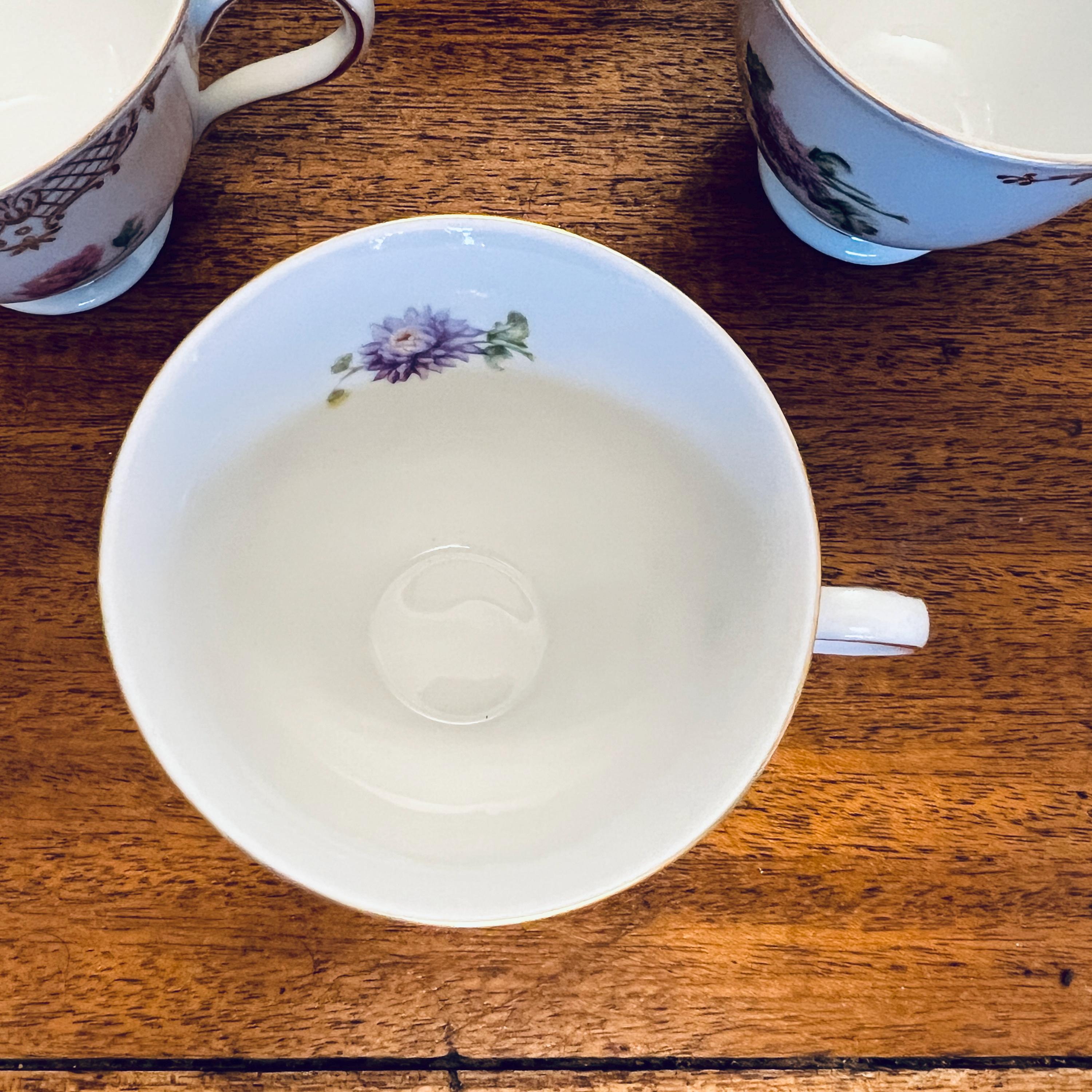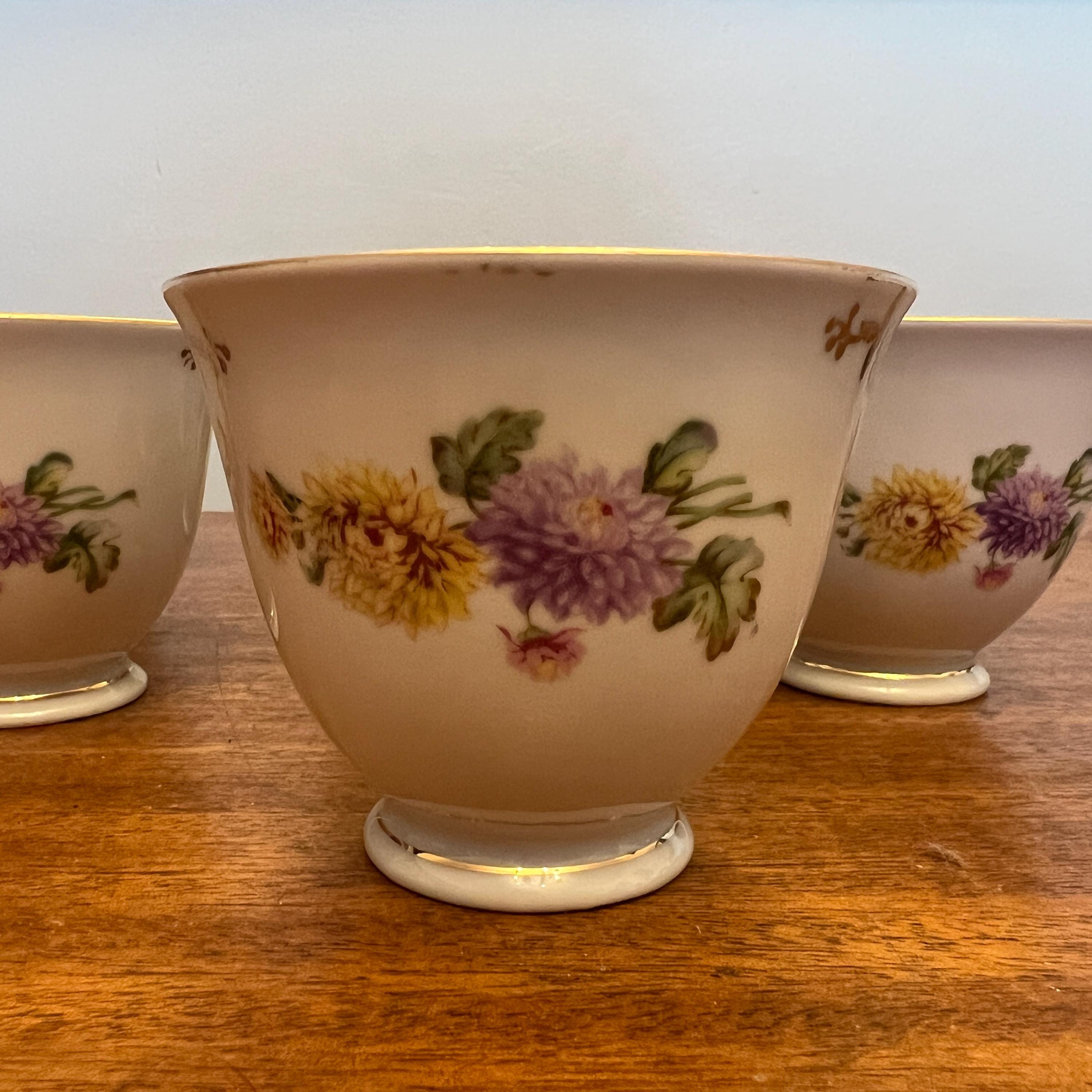 A set of 6 lovely vintage, pedestal footed, china tea cups. These lovely cups do not have their matching saucers but are dainty and elegant to use on their own. They are decorated with a pretty floral transfer design, with golden gilding and are marked 'Foreign' on the base. The maker and age are unknown, although they are thought to date to the mid 20th Century. The cups are all in good condition with no damage or cracks. These are vintage and have been used, so there is some slight wear to the gilding on the rims in places. Please note that one cup has a couple of golden gilding spots inside the cup where the painter had not cleaned up a drip and similarly a few slight miss strokes of gilding around the rim of one or two cups. This can be seen in the photographs.