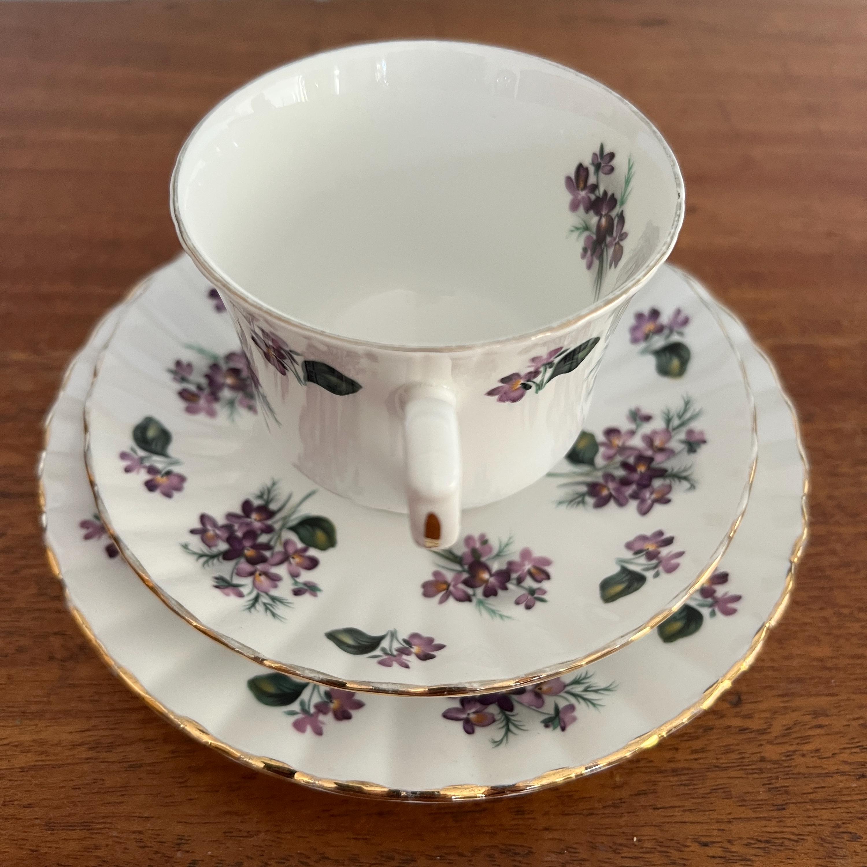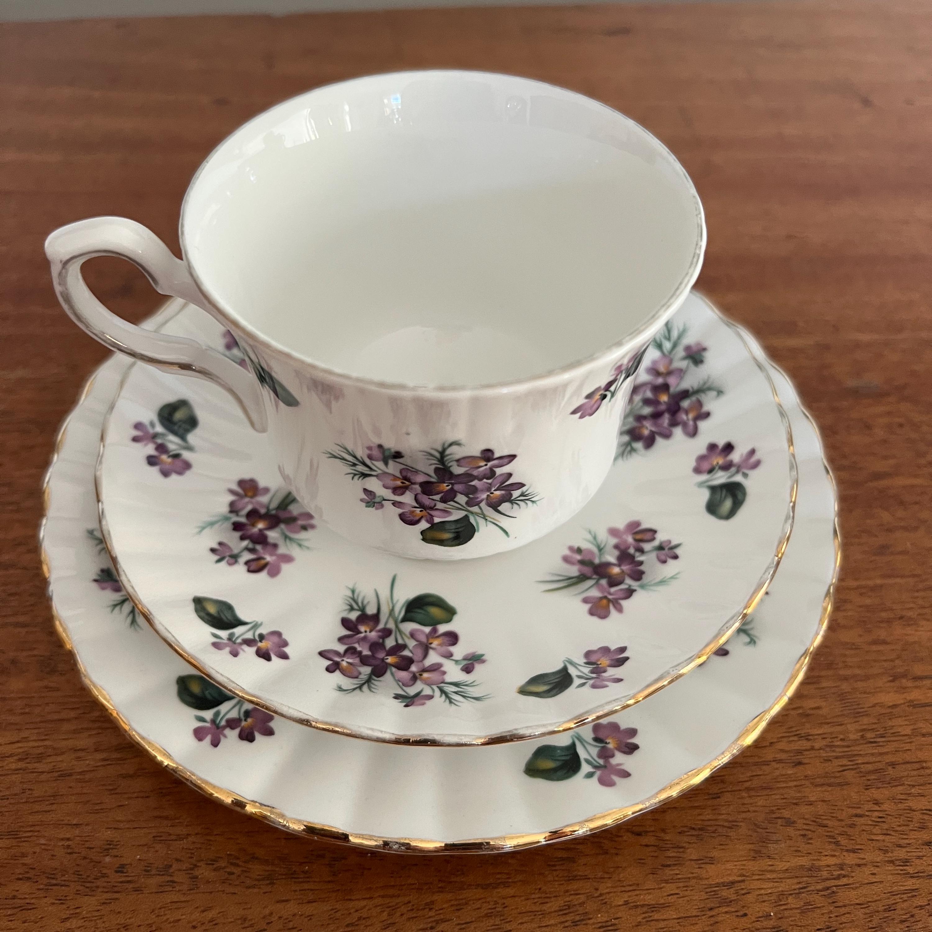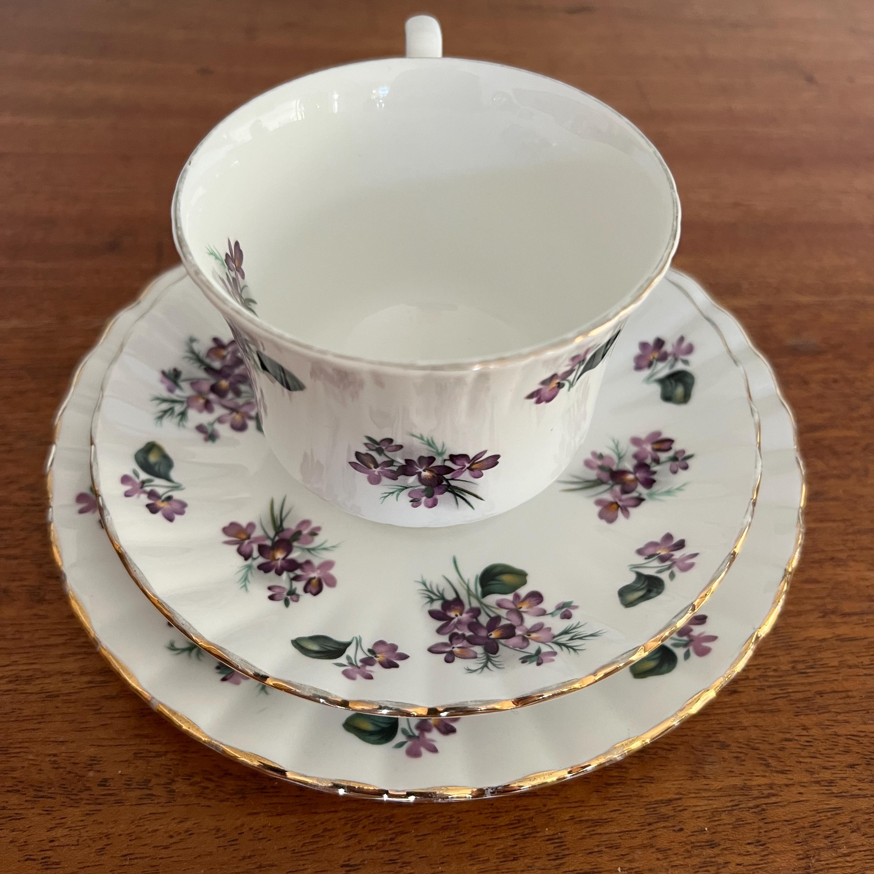 The set is decorated with a pretty violet floral design with golden gilding and have a lovely shape. They are marked with the maker's mark on the base of each item. The cups and saucers are all in good condition with no damage or cracks. These items are vintage and have been used, so there is some wear to the gilding, mainly on the cup rim and handle. The gilding on the saucer and plate are almost like new.