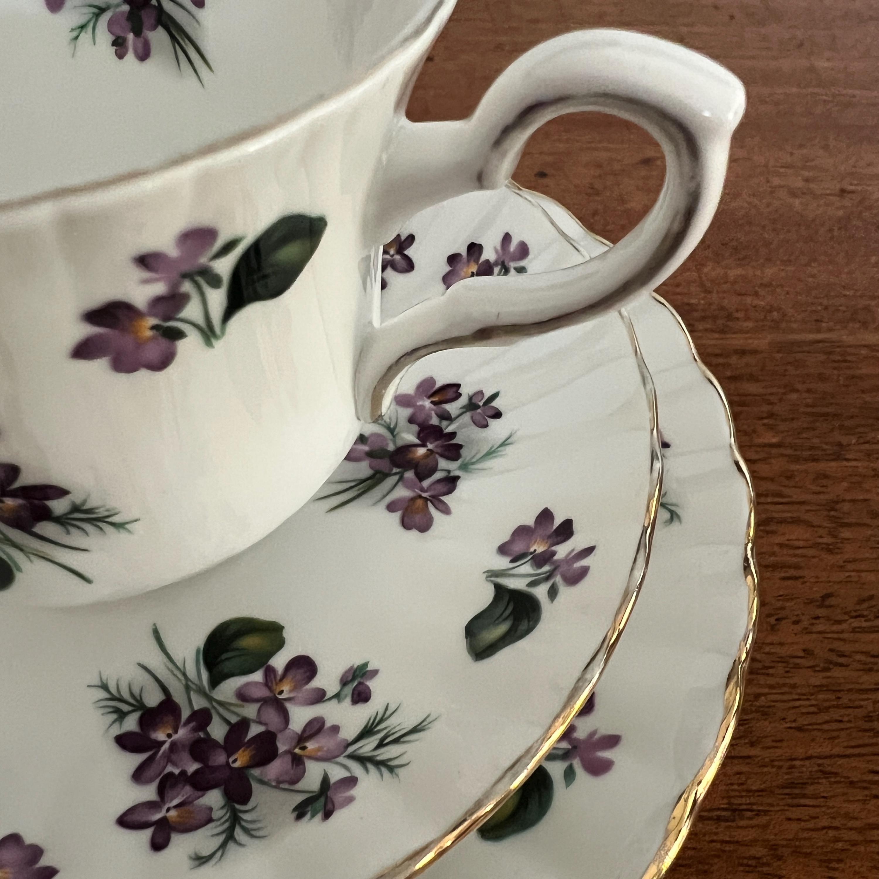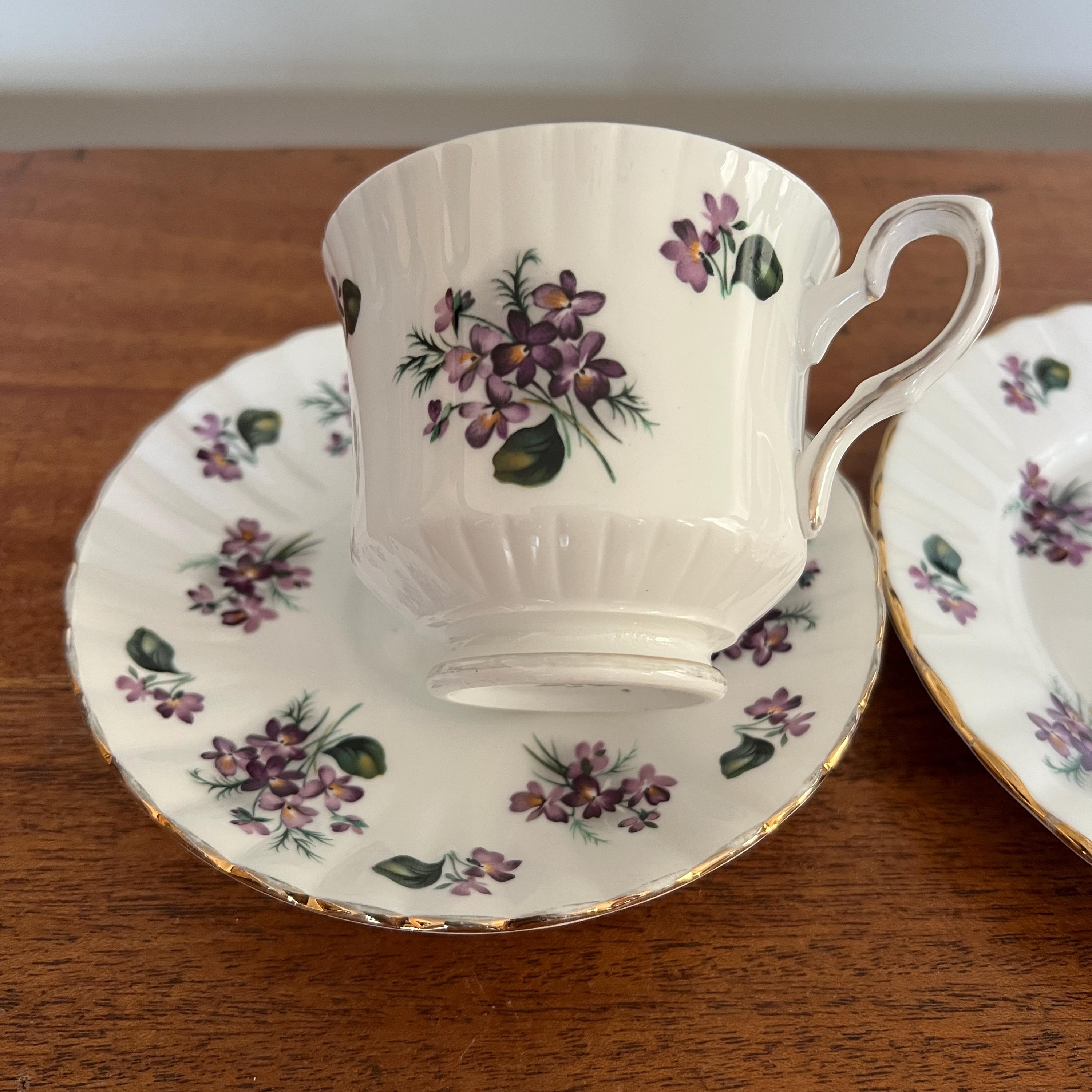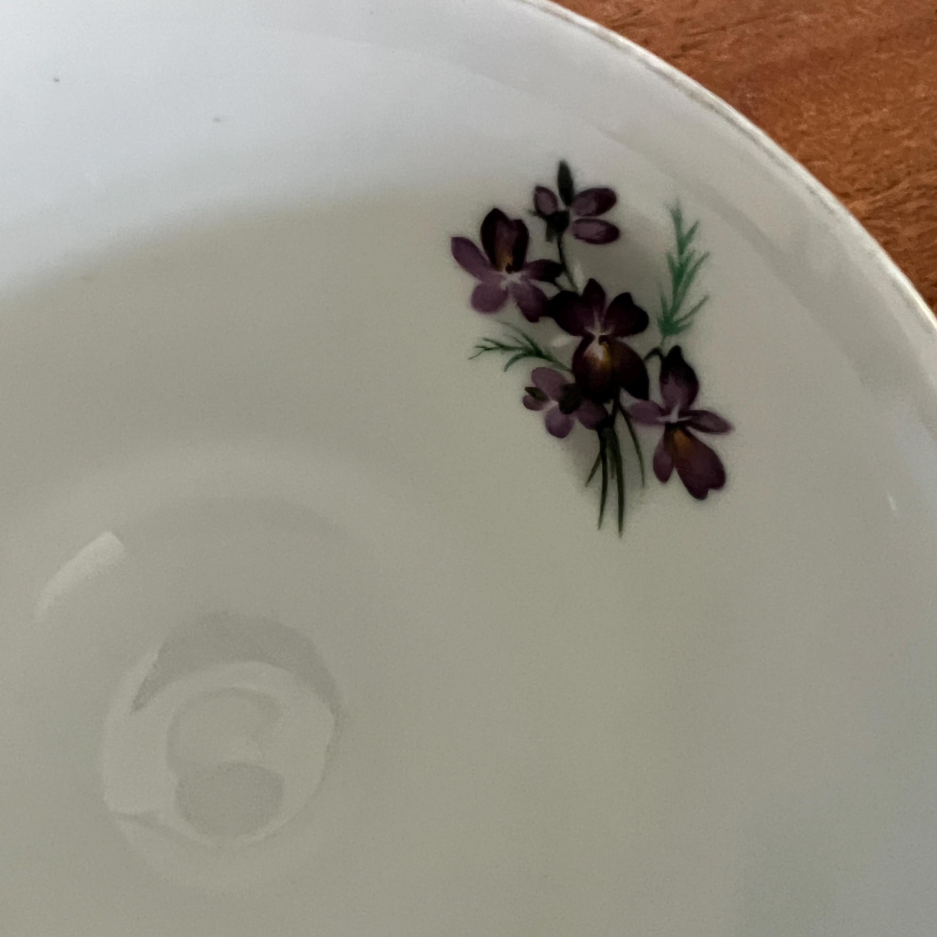 The set is decorated with a pretty violet floral design with golden gilding and have a lovely shape. They are marked with the maker's mark on the base of each item. The cups and saucers are all in good condition with no damage or cracks. These items are vintage and have been used, so there is some wear to the gilding, mainly on the cup rim and handle. The gilding on the saucer and plate are almost like new.