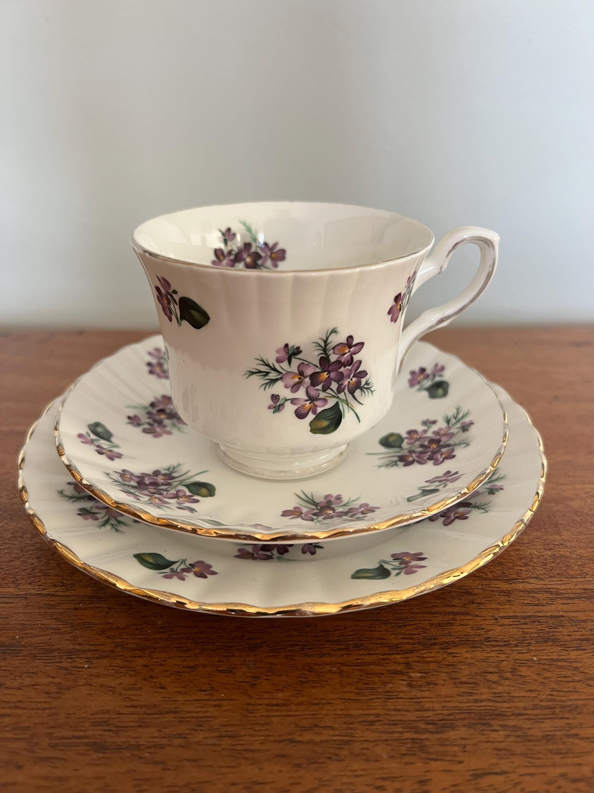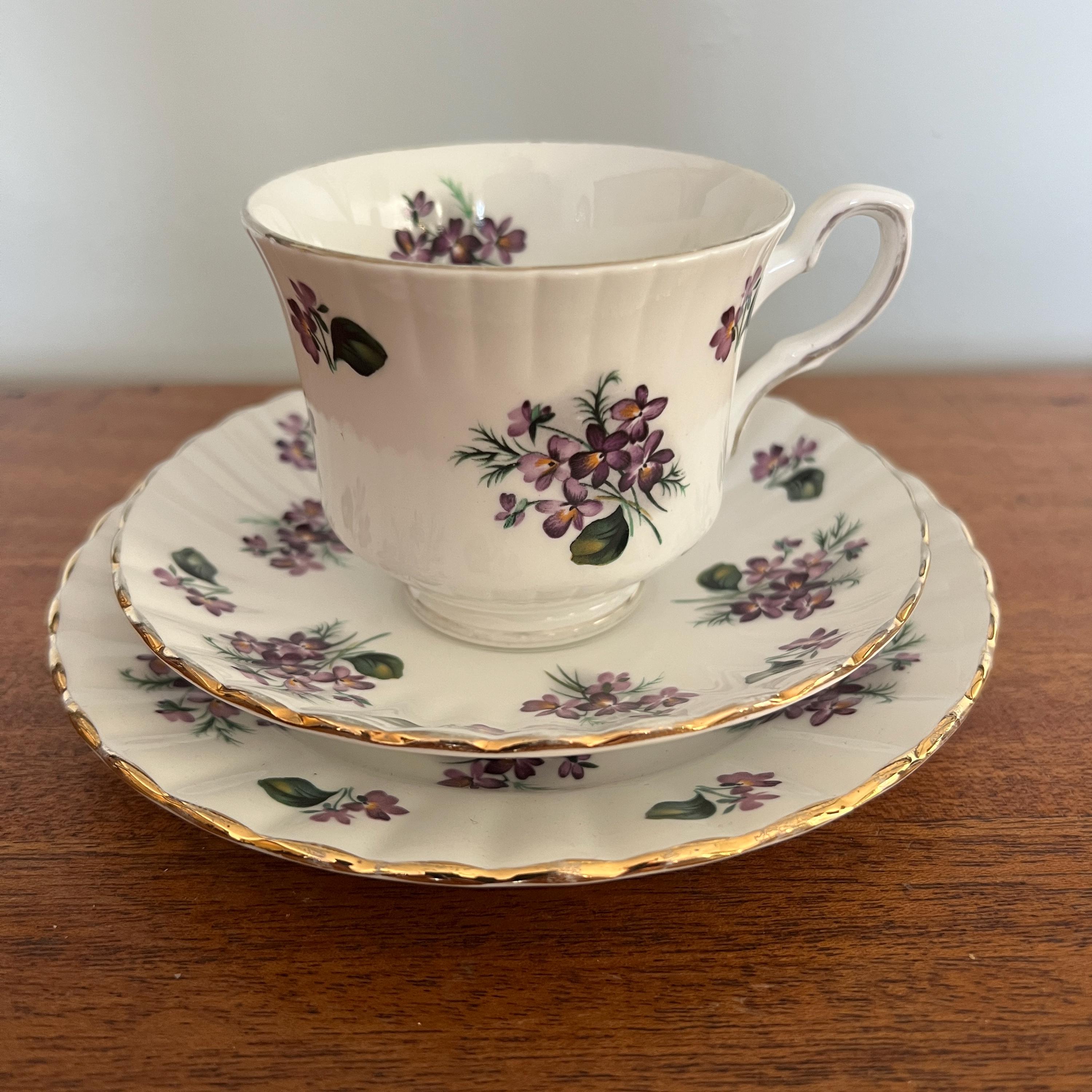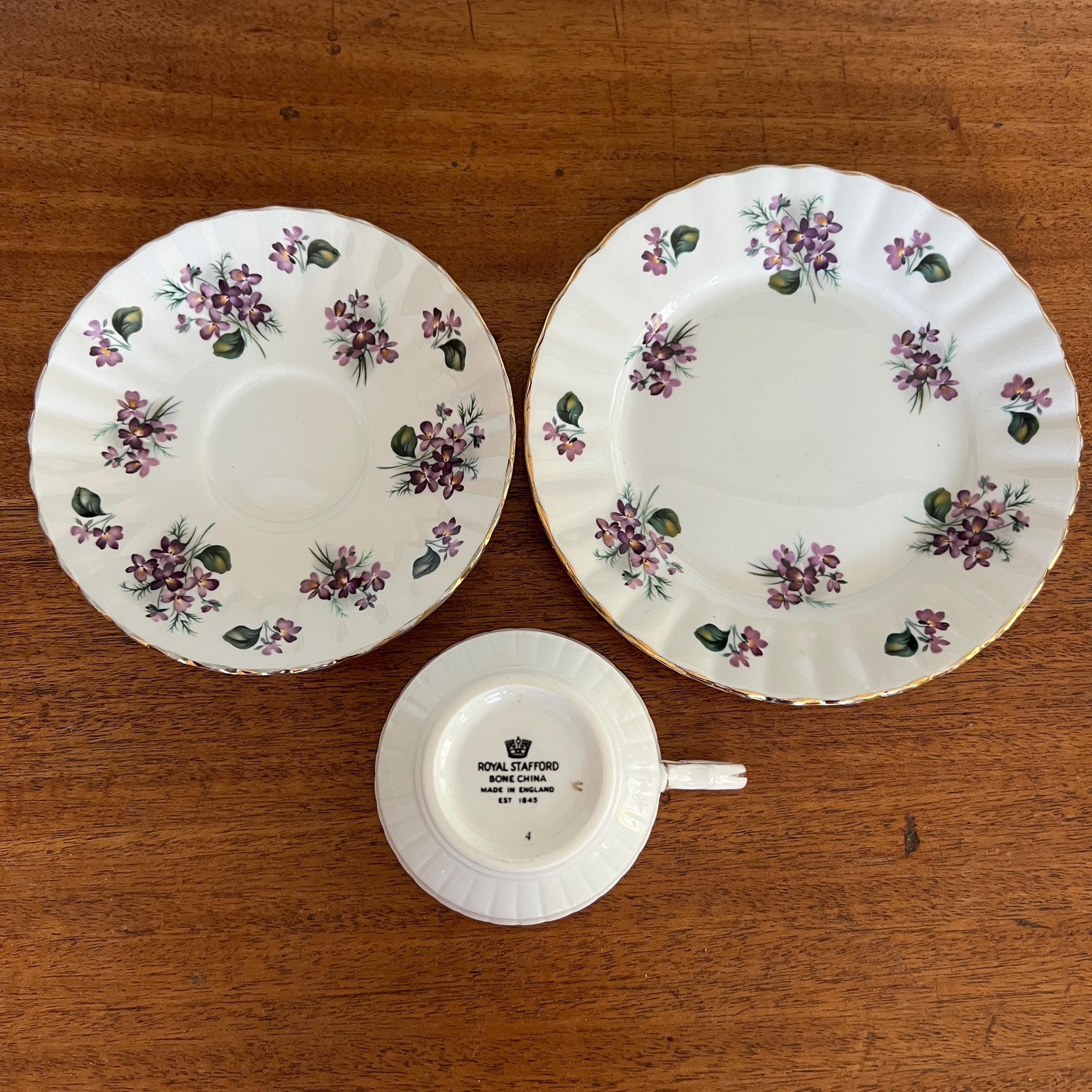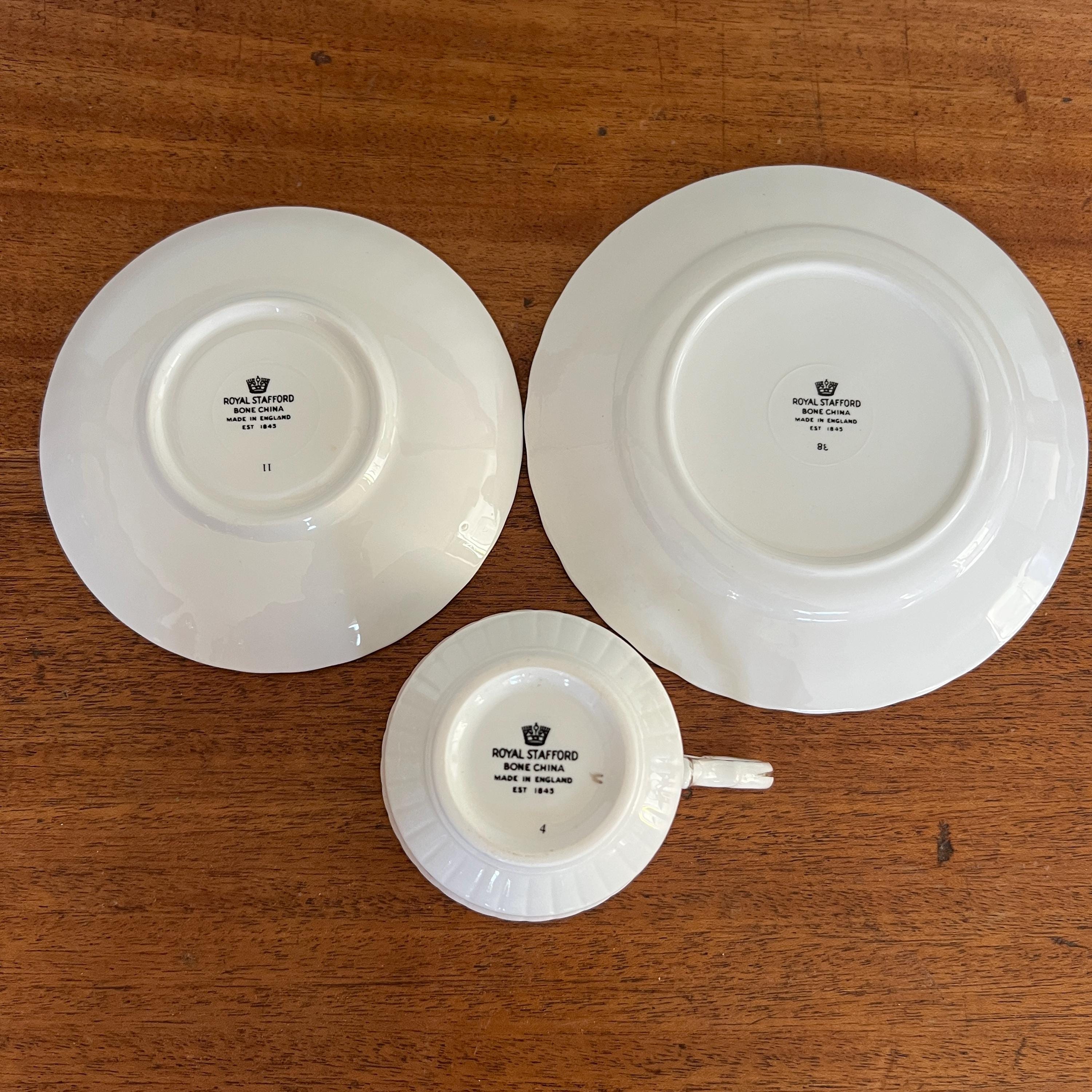 A pretty vintage trio set in English bone china consisting of a pedestal footed teacup, saucer and tea plate by Royal Stafford. Other items in the range can be found on separate listings, where still available.