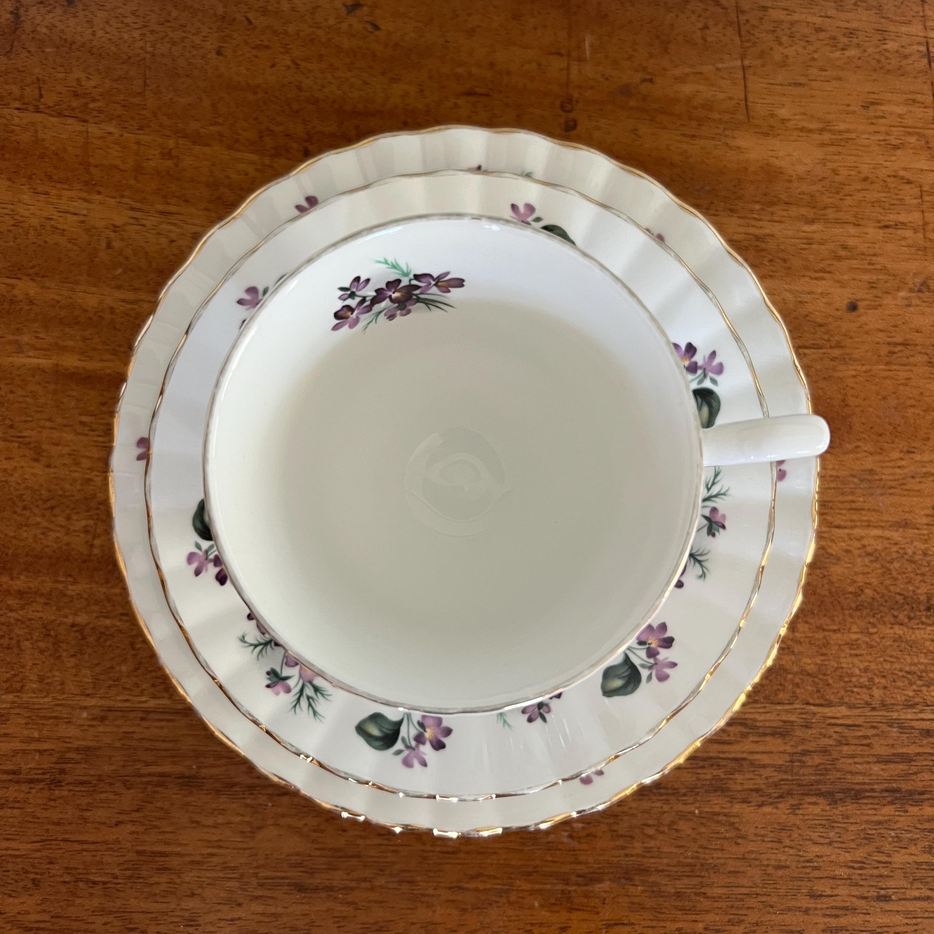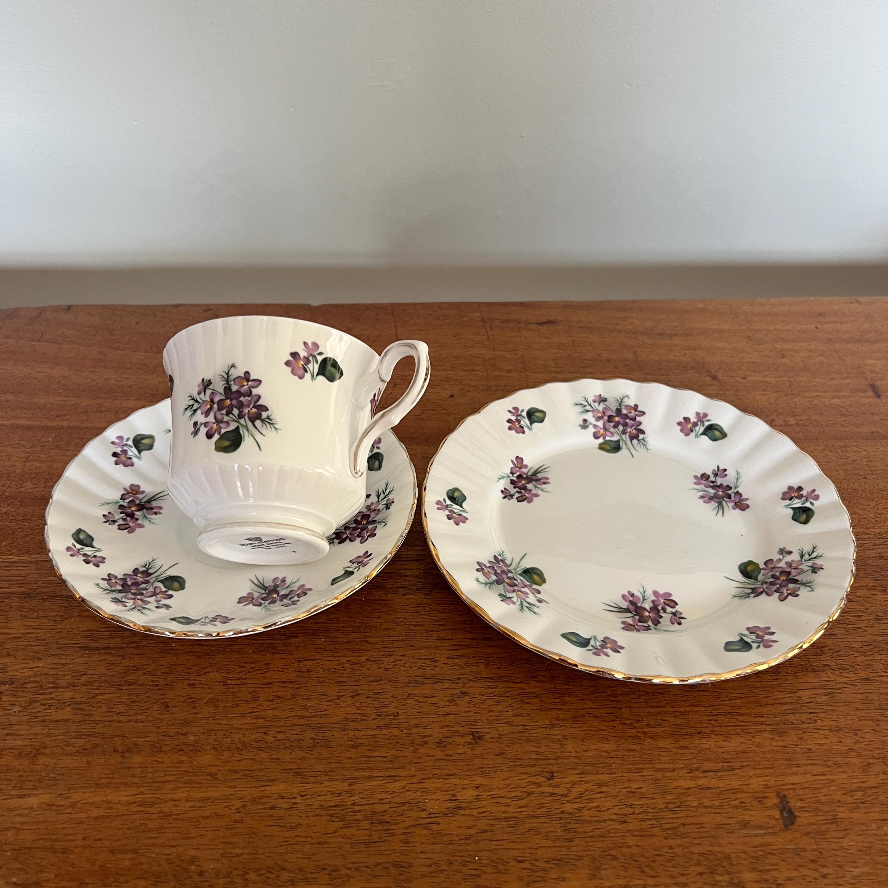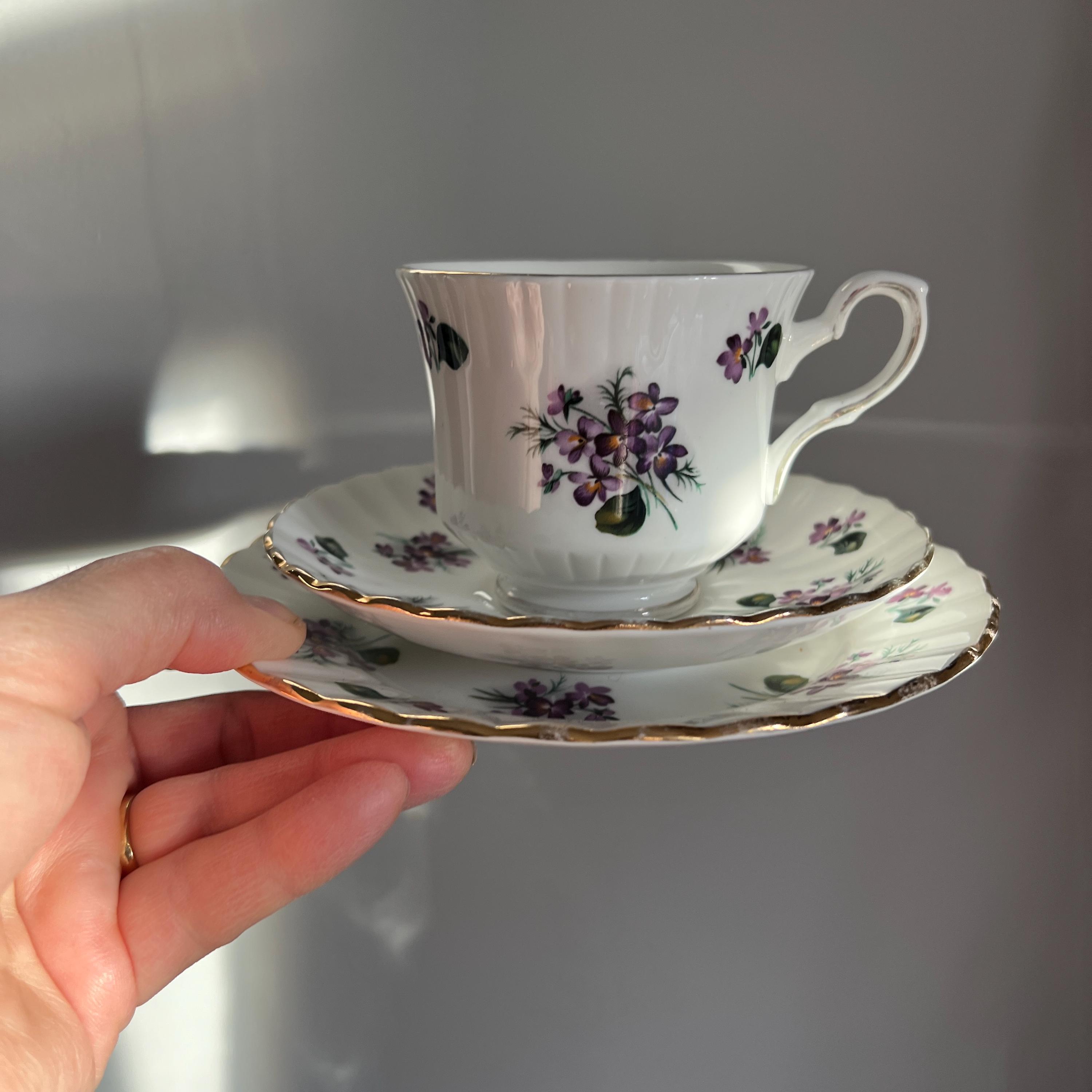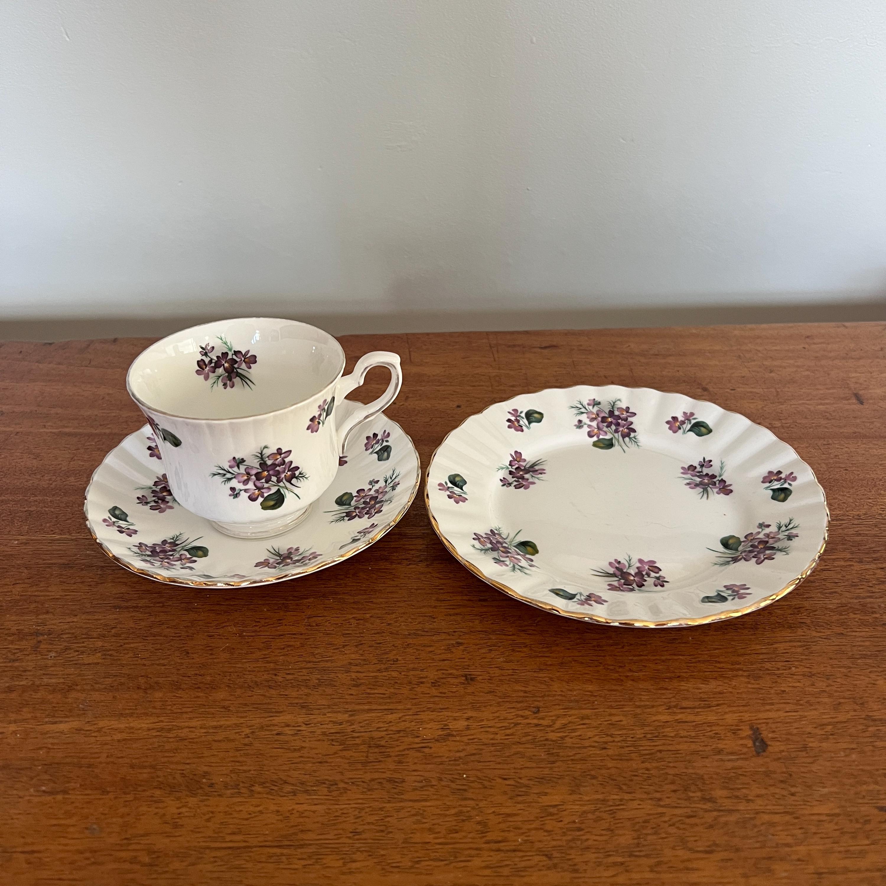 A pretty vintage trio set in English bone china consisting of a pedestal footed teacup, saucer and tea plate by Royal Stafford. Other items in the range can be found on separate listings, where still available.