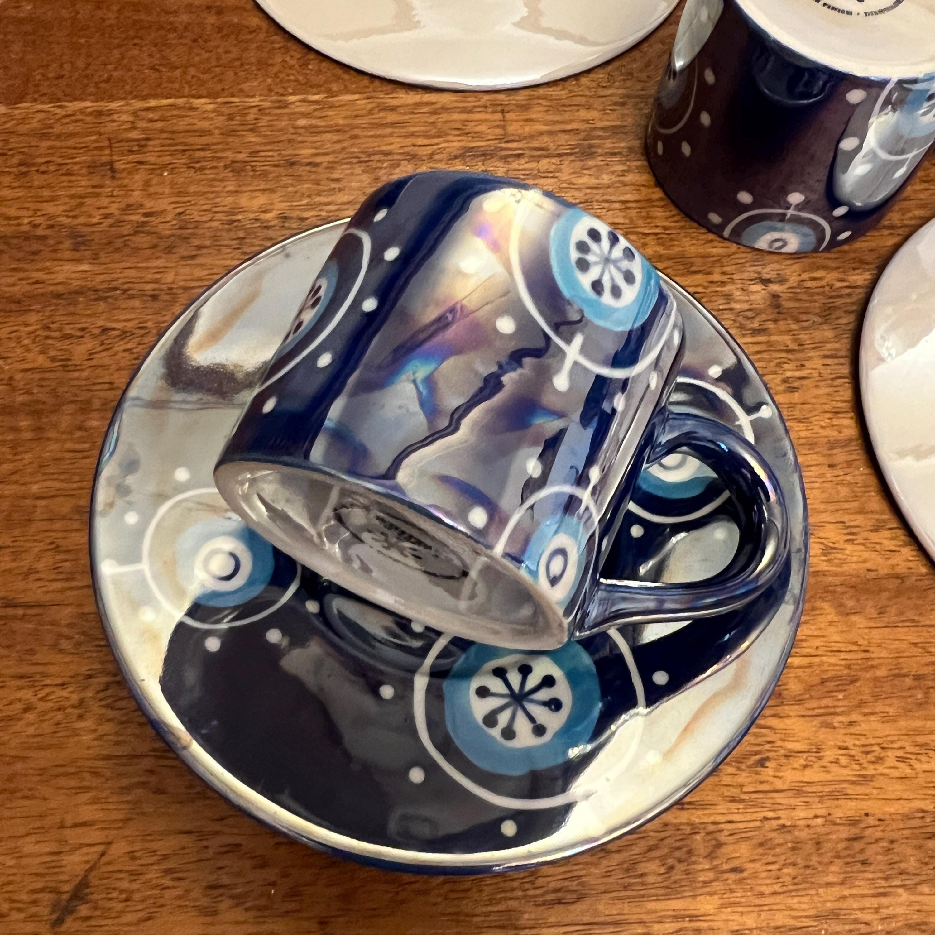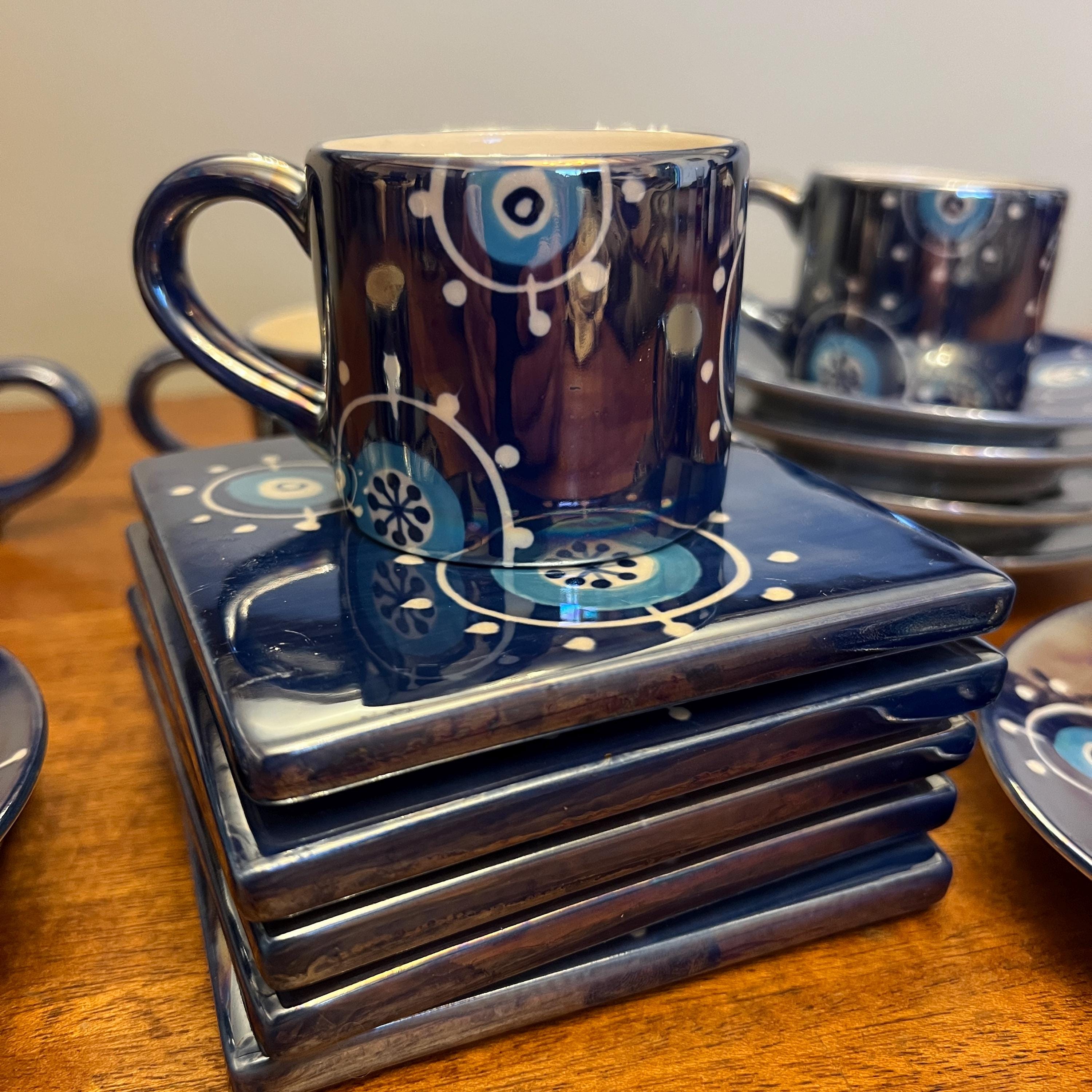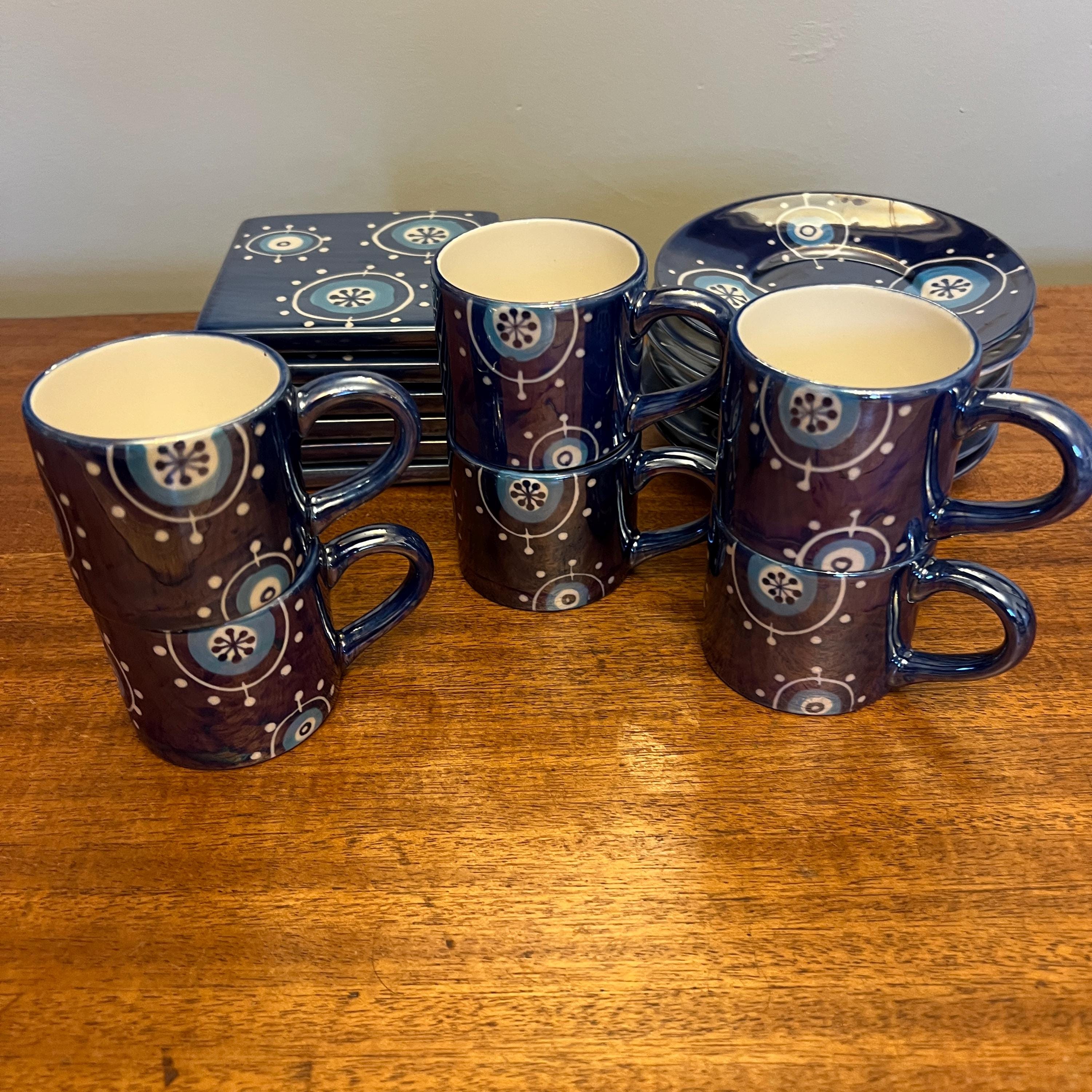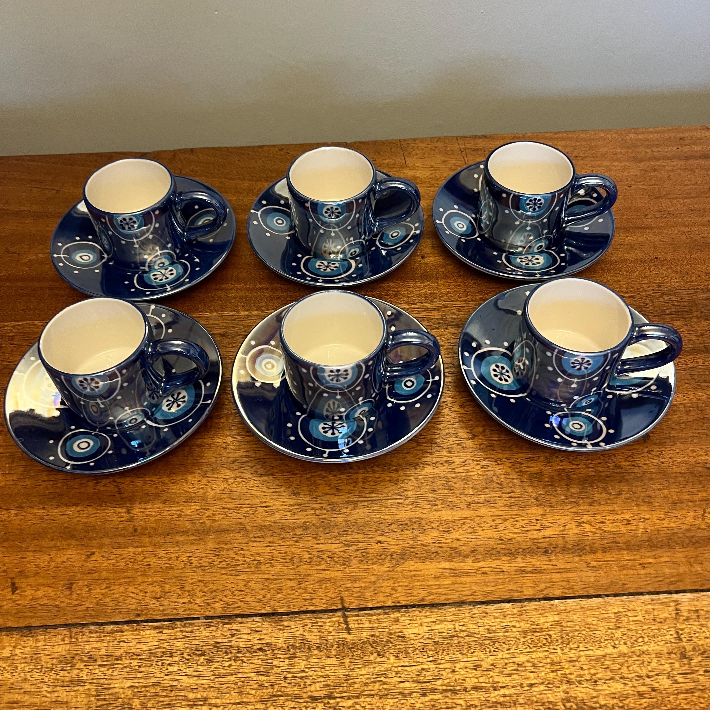 A fabulous set of 6 dark blue, high gloss, pearlescent lustre espresso cups and saucers with matching ceramic coasters, all hand painted in their gorgeous 'Winter Wonderland' design. The set is dishwasher safe and was launched in 2004 and now discontinued.
