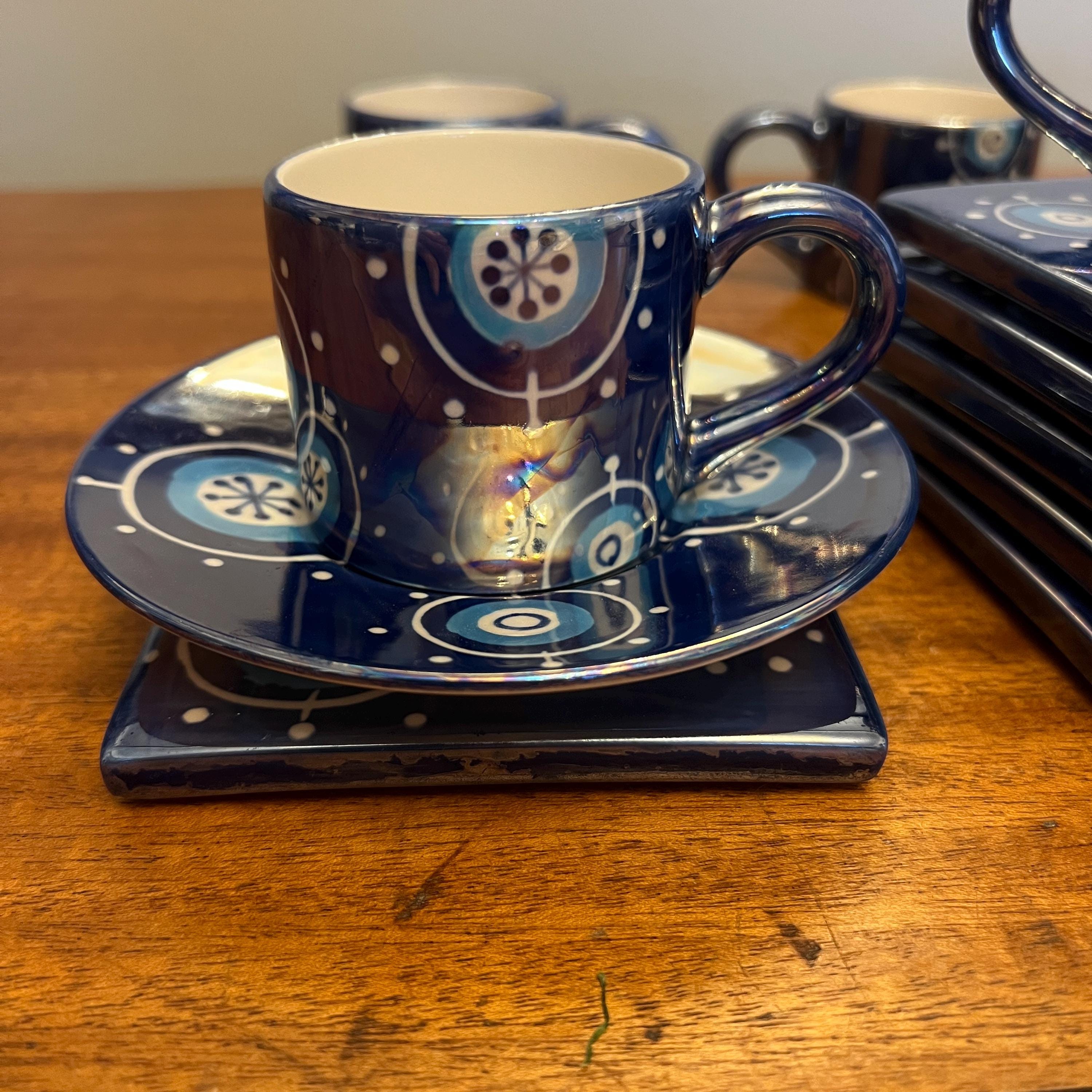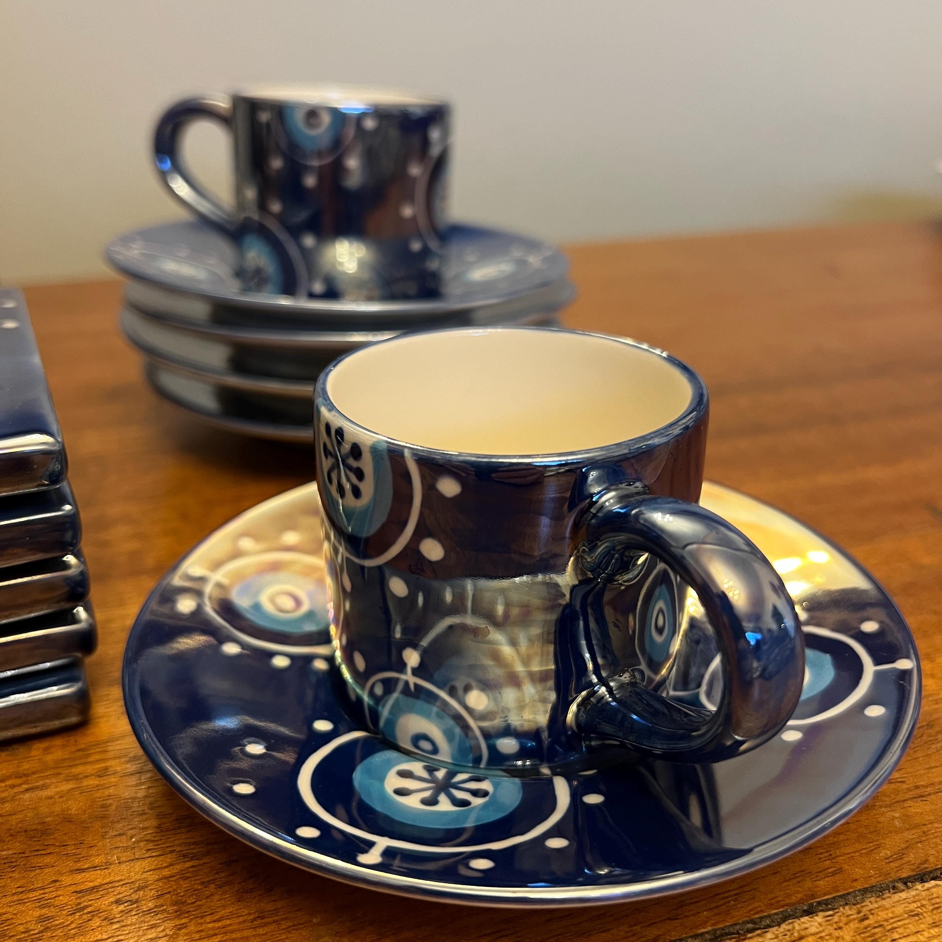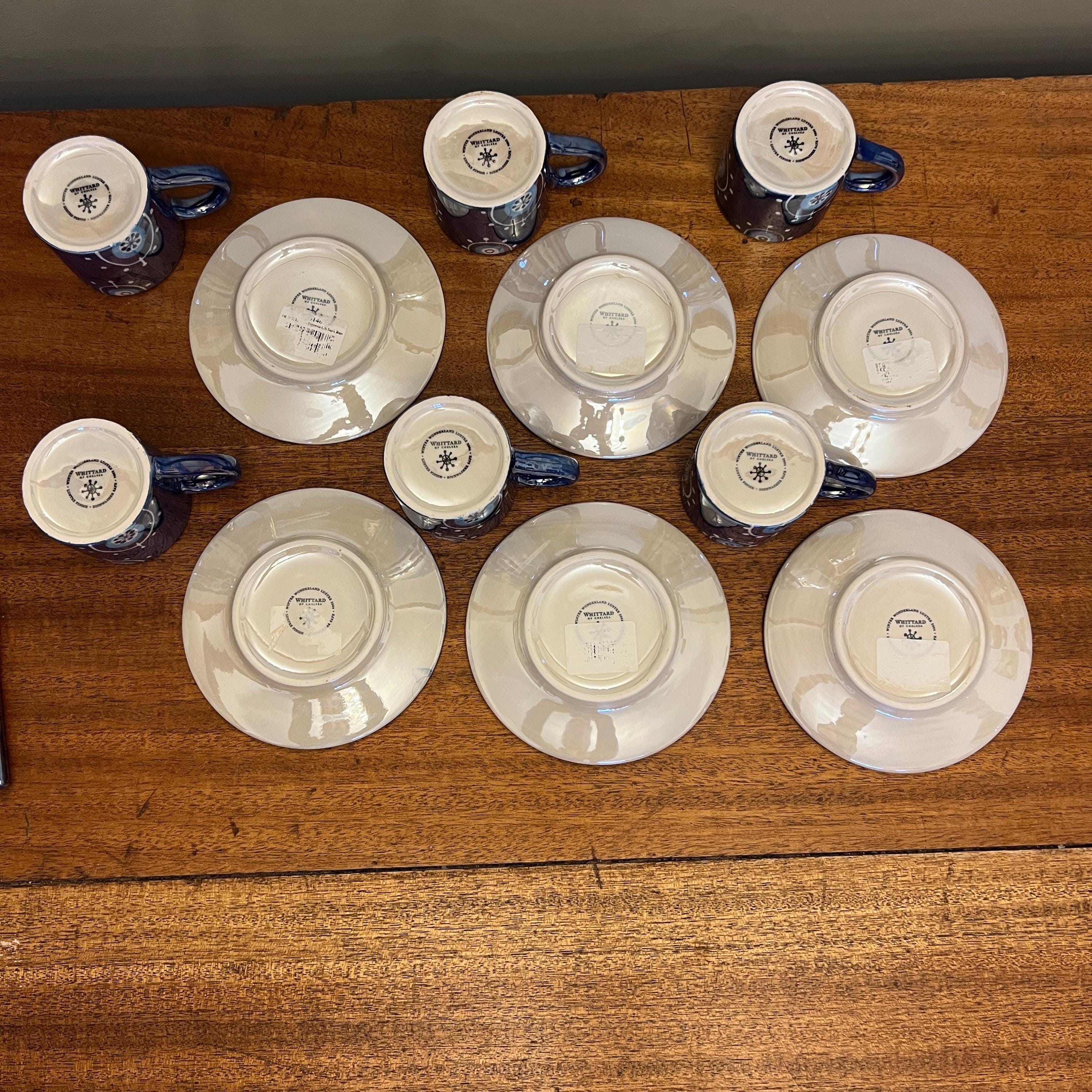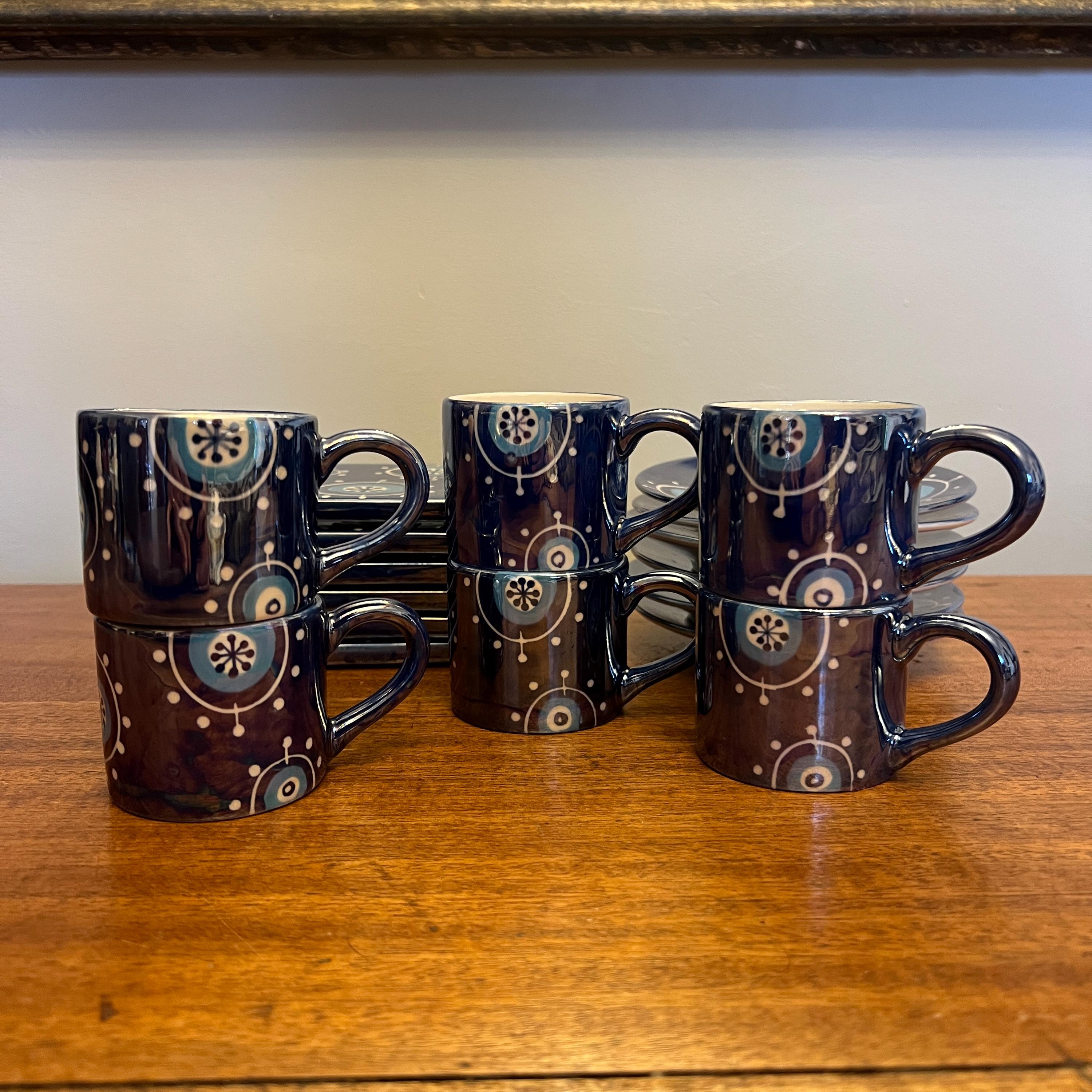 A fabulous set of 6 dark blue, high gloss, pearlescent lustre espresso cups and saucers with matching ceramic coasters, all hand painted in their gorgeous 'Winter Wonderland' design. The set is dishwasher safe and was launched in 2004 and now discontinued.