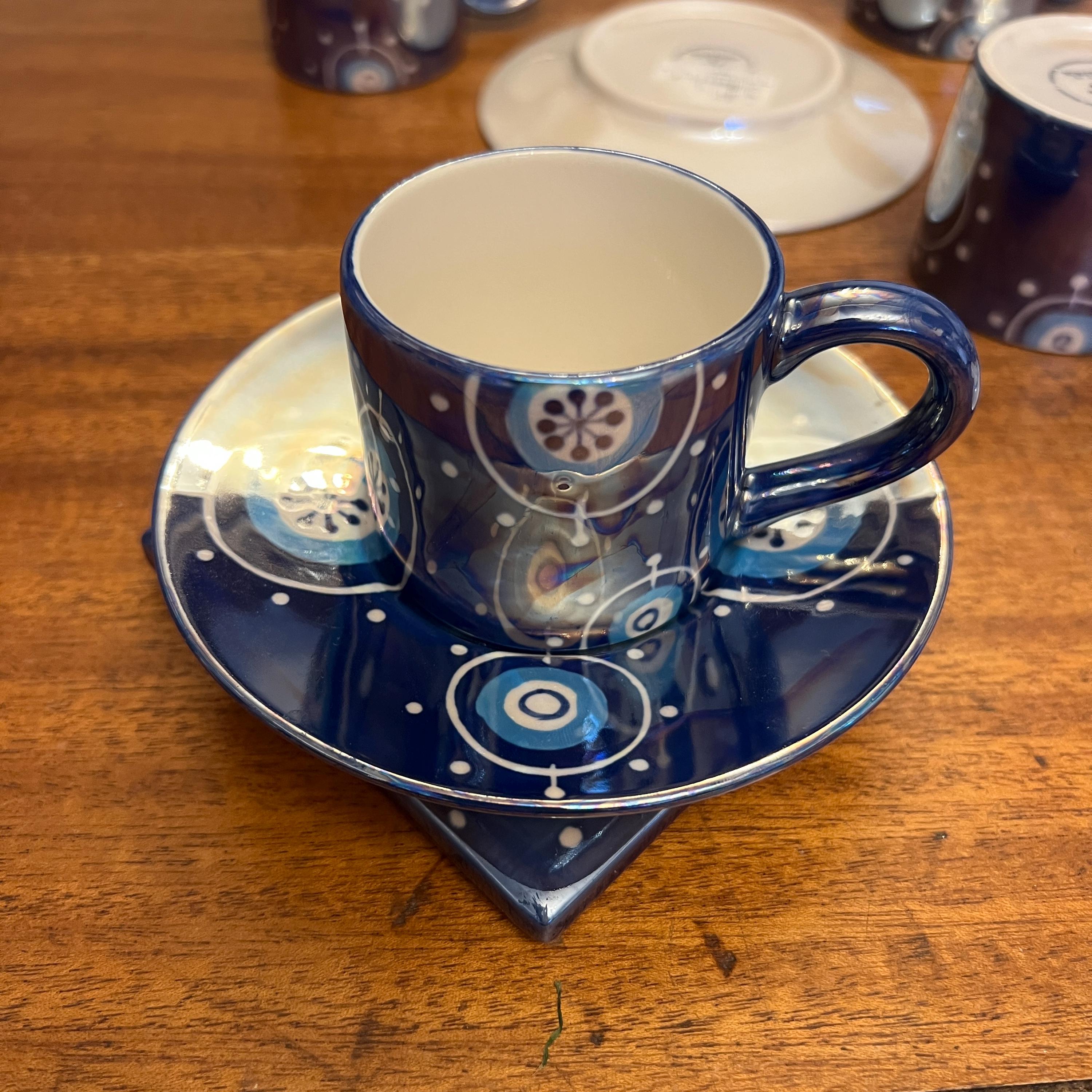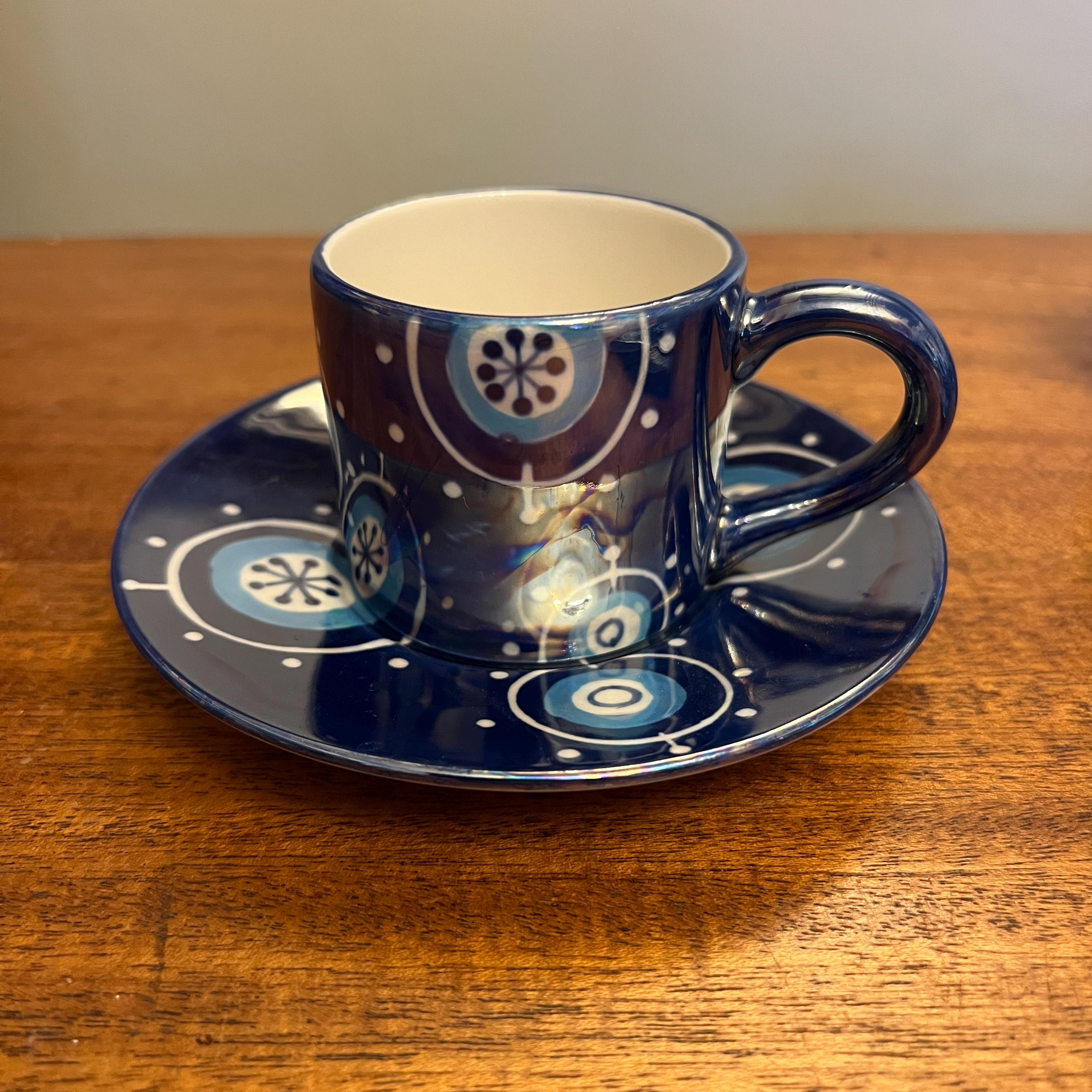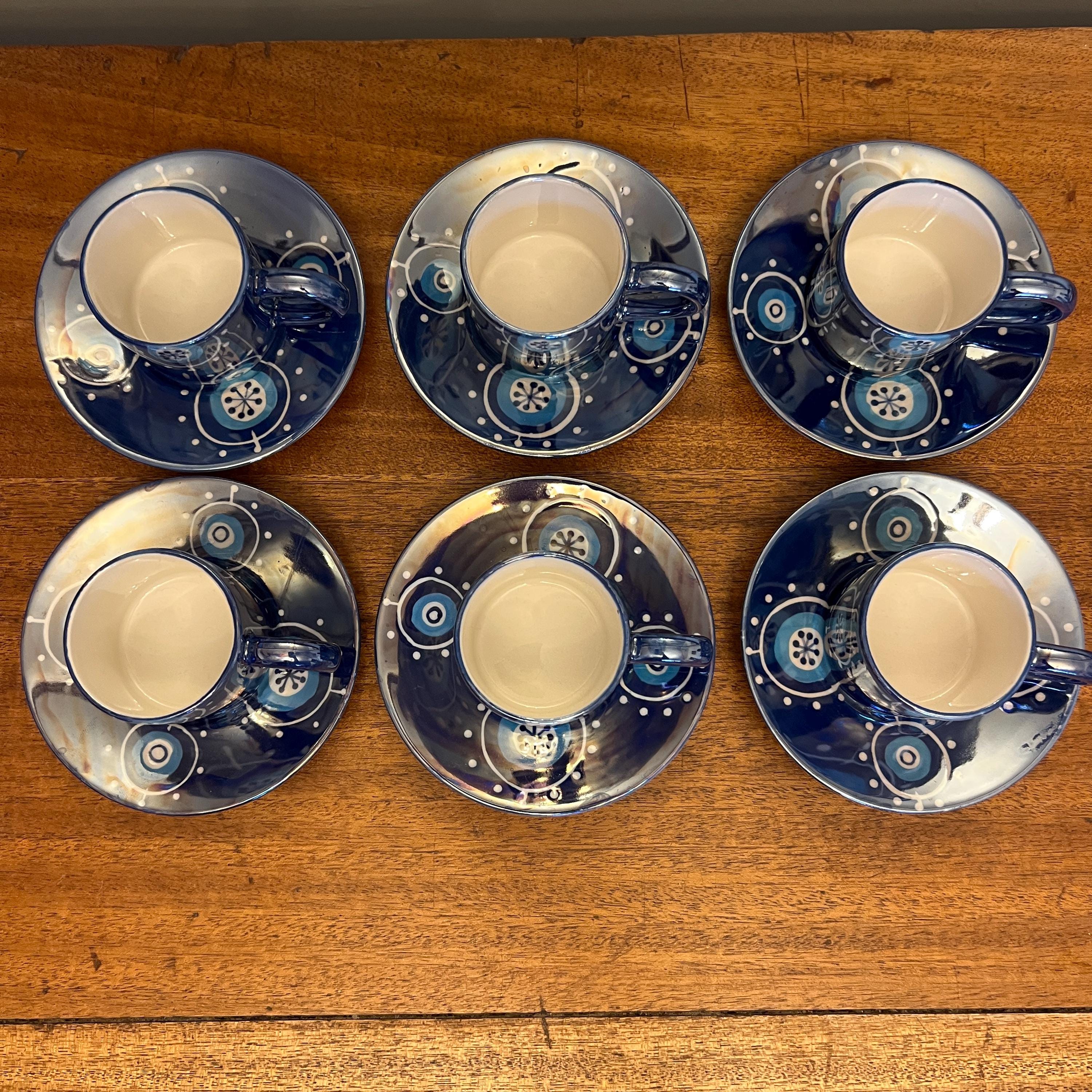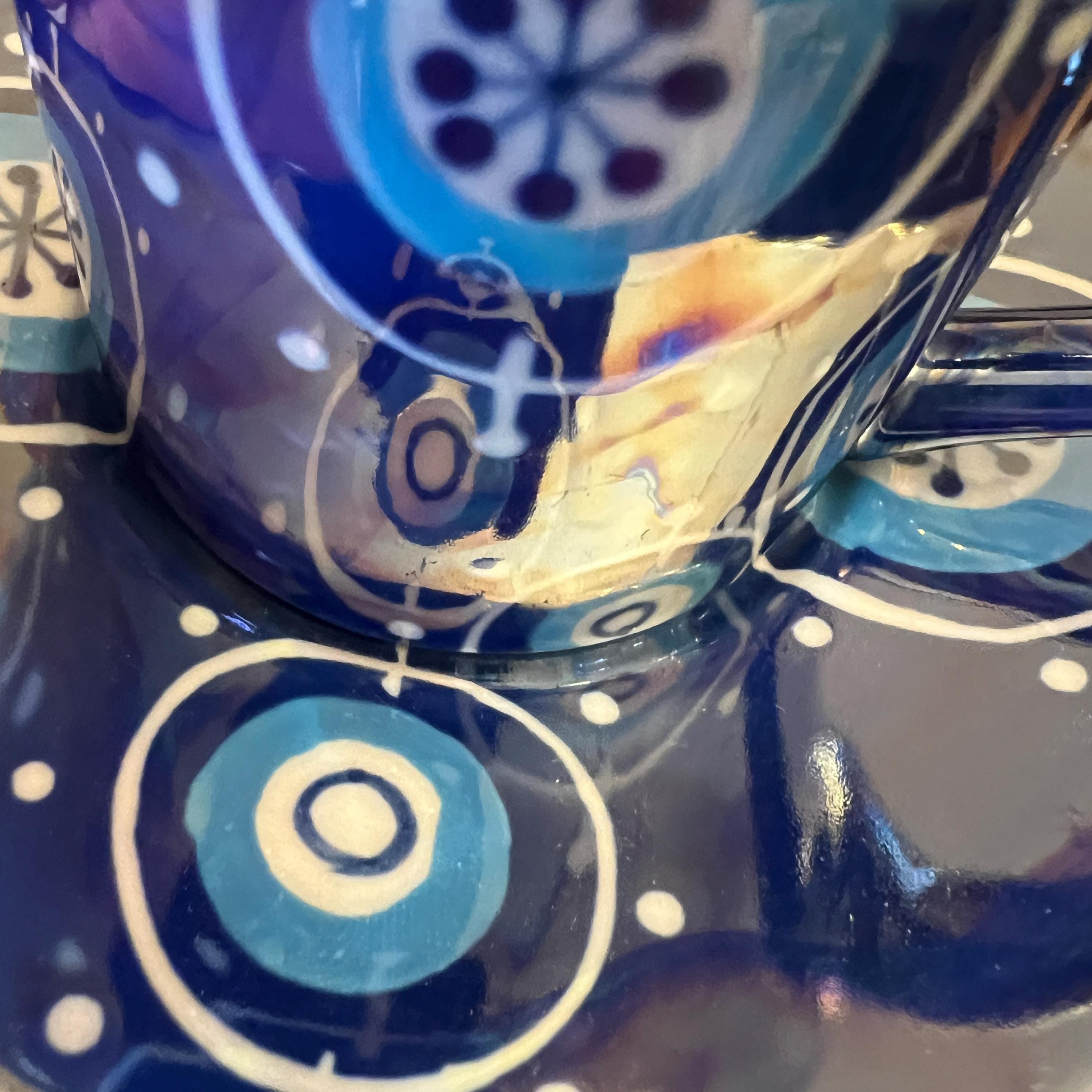 A fabulous set of 6 dark blue, high gloss, pearlescent lustre espresso cups and saucers with matching ceramic coasters, all hand painted in their gorgeous 'Winter Wonderland' design. The set is dishwasher safe and was launched in 2004 and now discontinued.