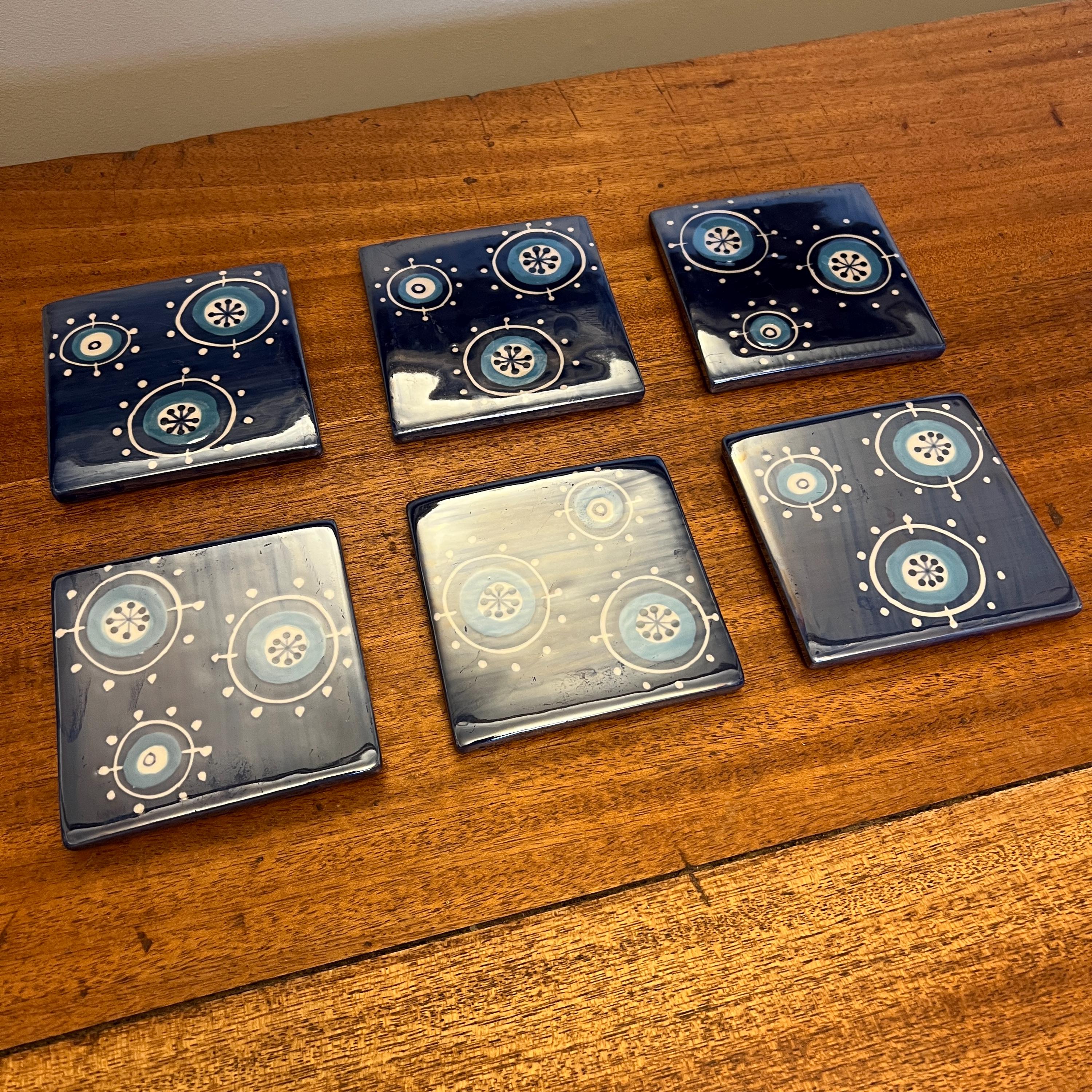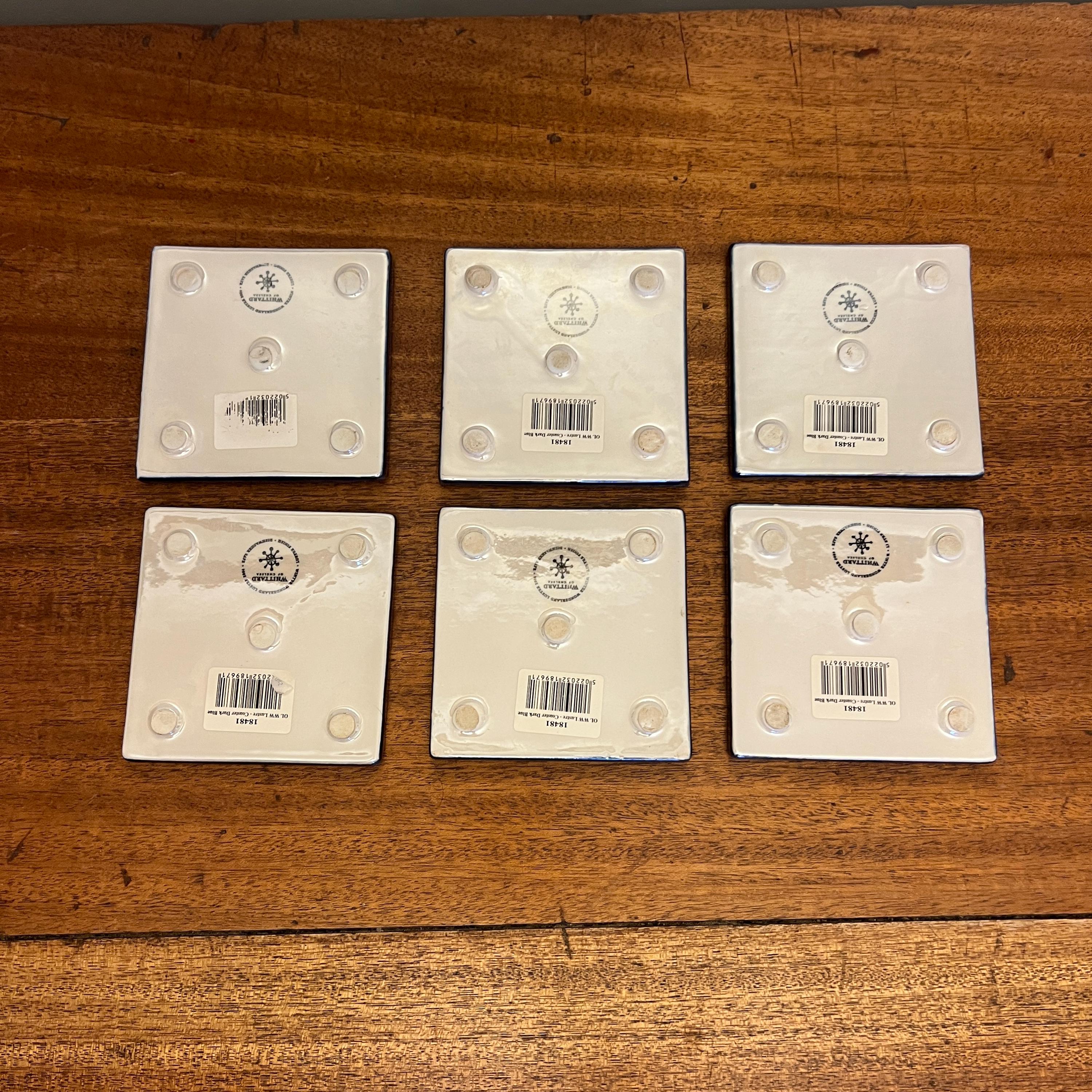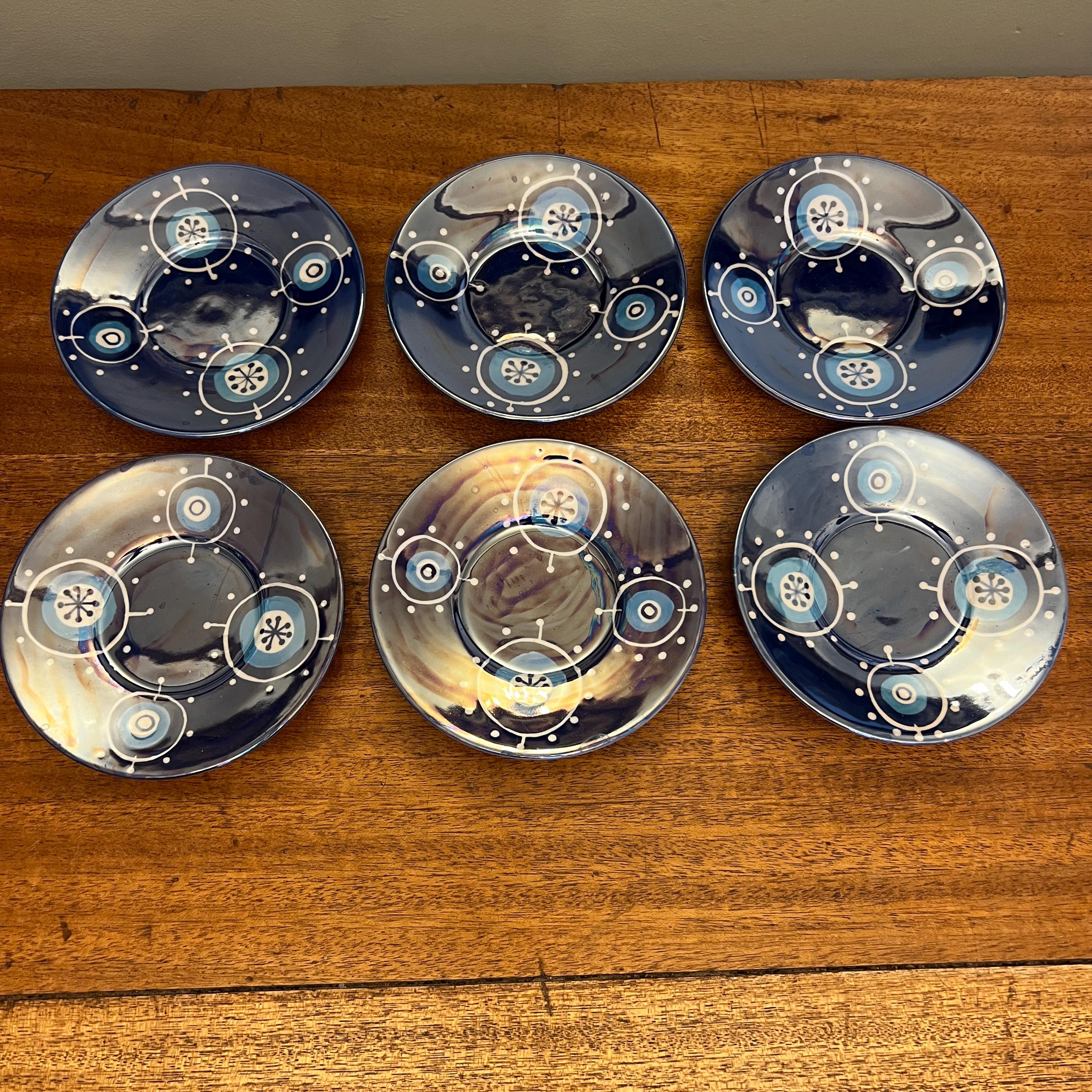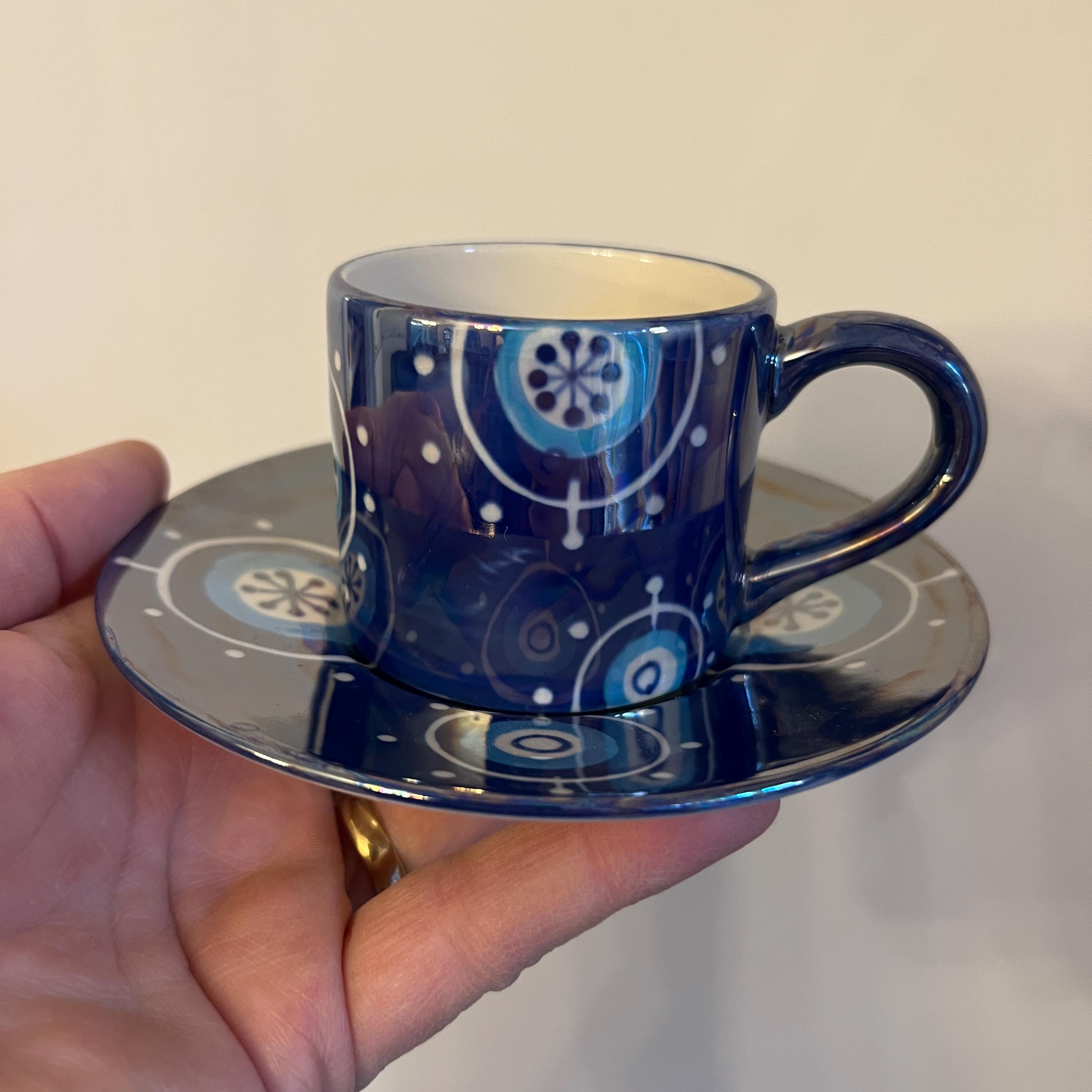 A fabulous set of 6 dark blue, high gloss, pearlescent lustre espresso cups and saucers with matching ceramic coasters, all hand painted in their gorgeous 'Winter Wonderland' design. The set is dishwasher safe and was launched in 2004 and now discontinued.