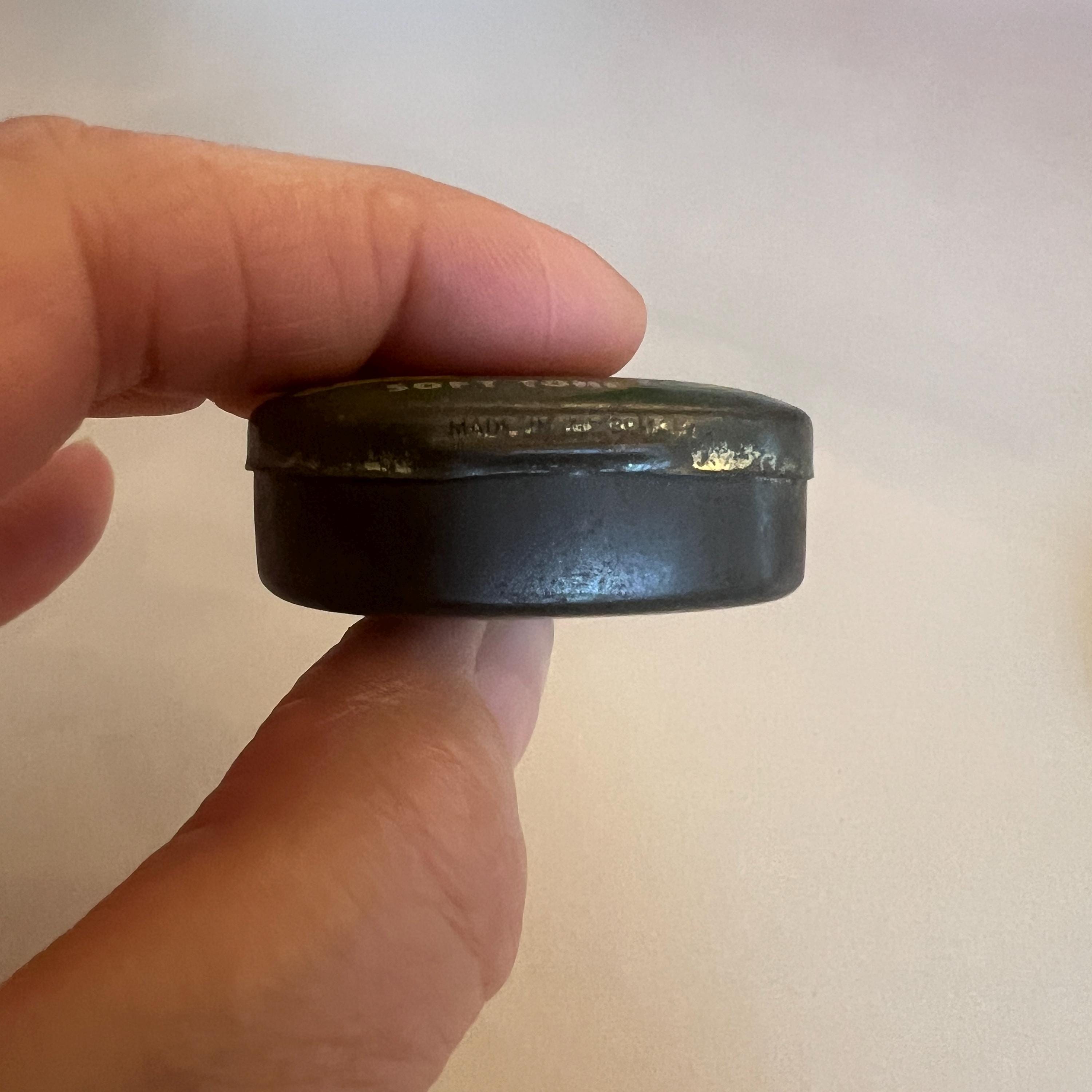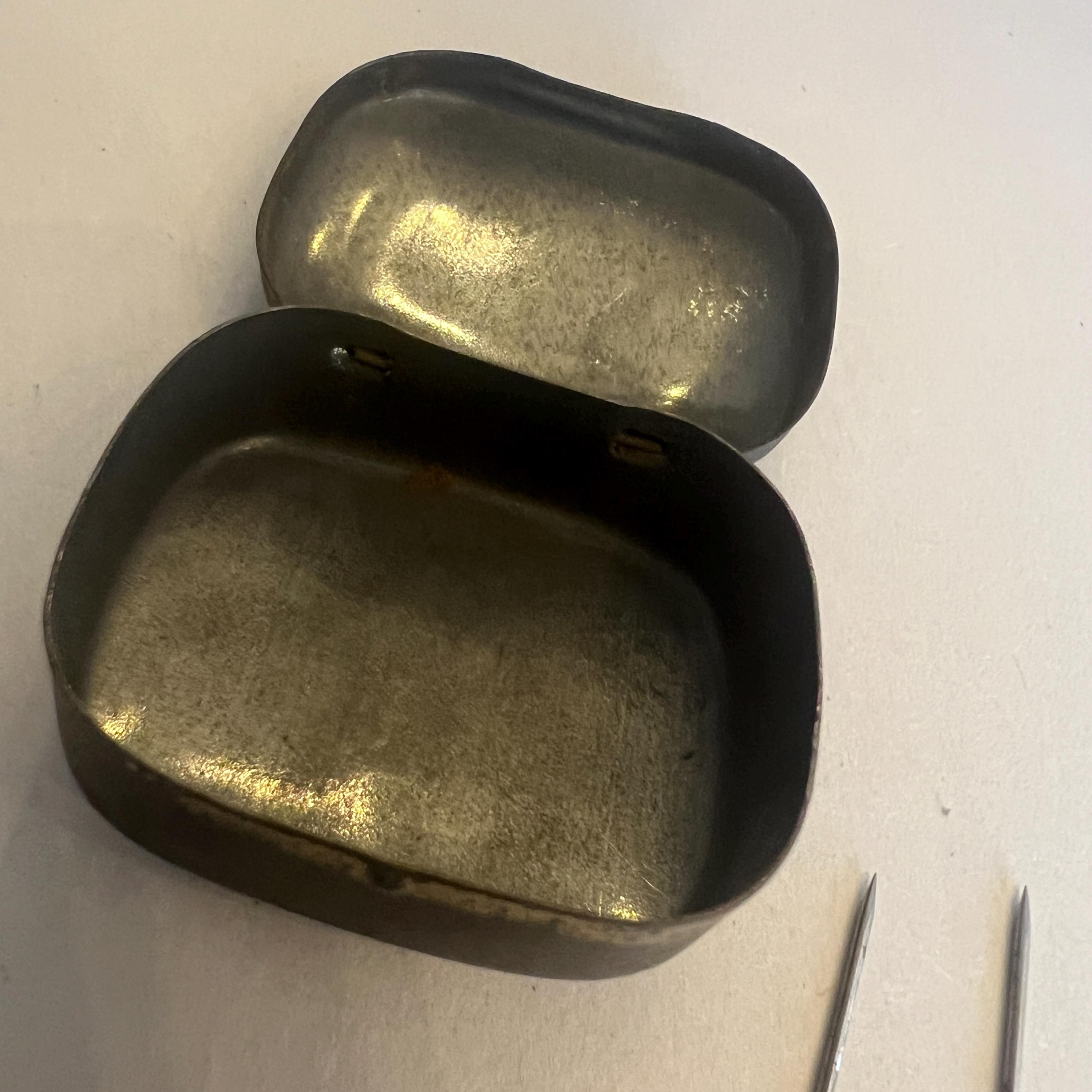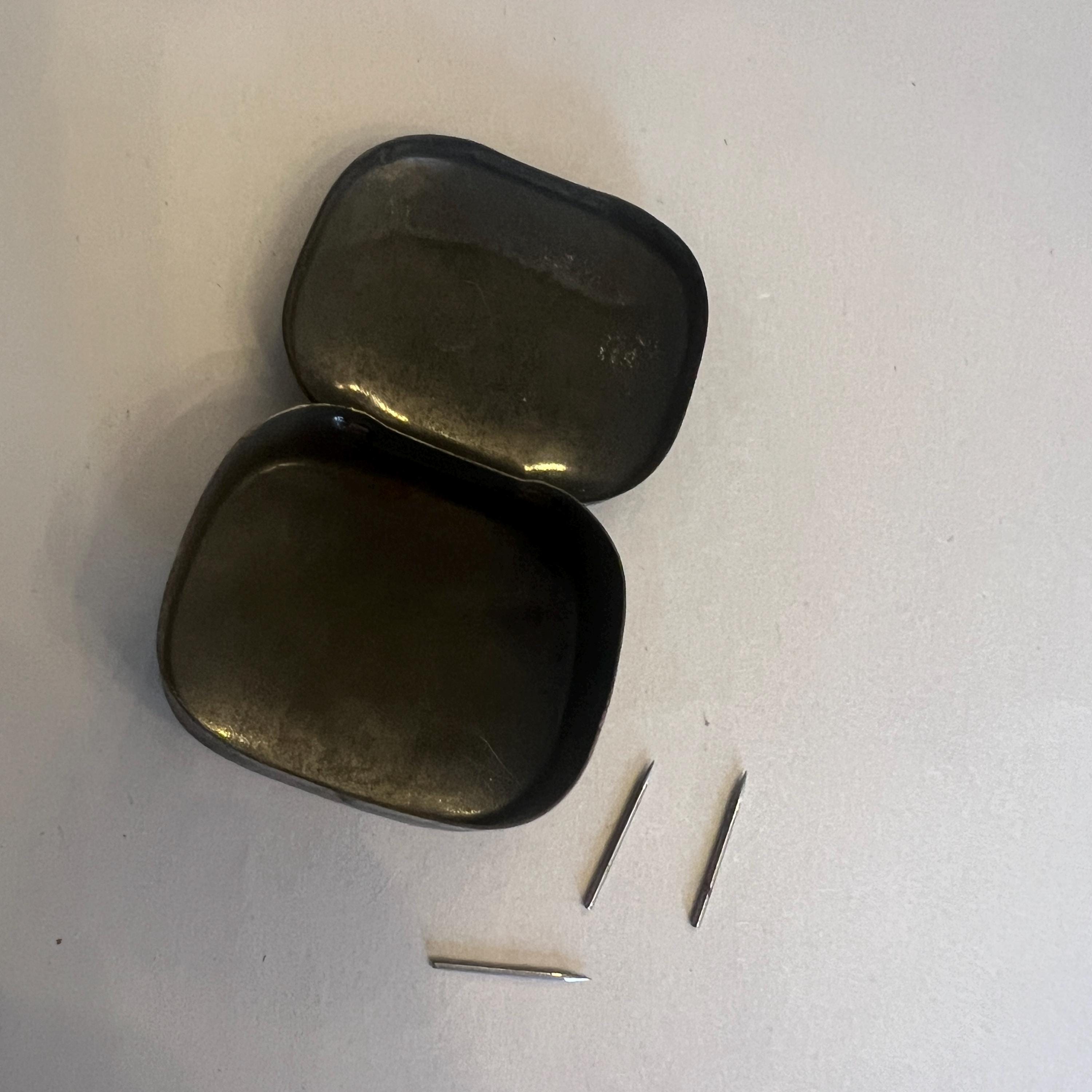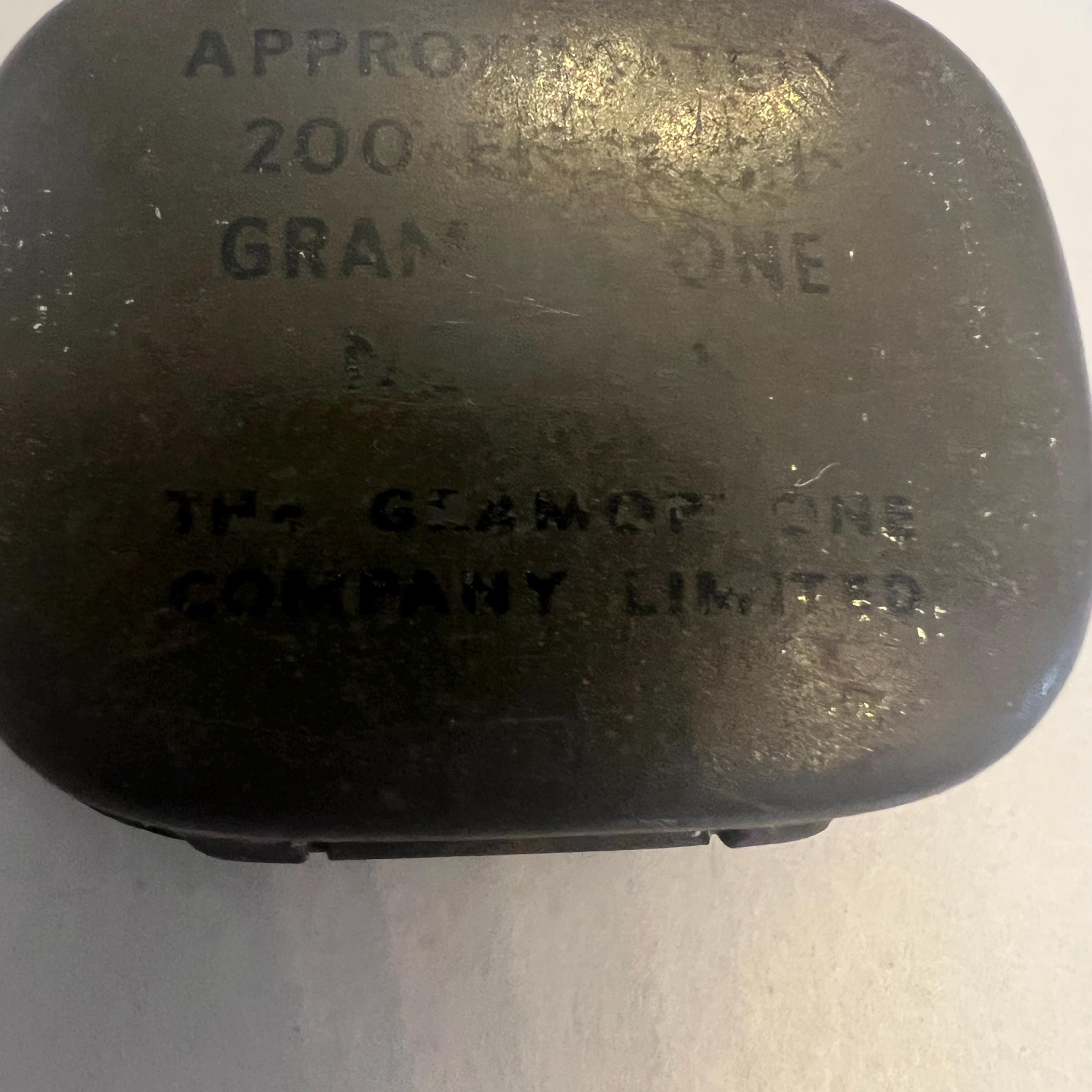 A lovely little gramophone needle tin containing 3 needles, believed to date from the 1930's or thereabouts. A pretty and collectable tin featuring the dog 'Nipper' listening to the recording of his master's voice on the gramophone. Overall it is in good but well used condition with age related patina and deterioration. The lettering on the front is still good, however there is wear on the back and some of the lettering has been worn away. Most of the gold gilding has gone. It has not been cleaned, I have left all restoration for the new owner. There are 3 needles inside. I do not know if these are the original needles for the tin. The tin measures approximately 4cm long, 3cm wide and 1.5cm high.