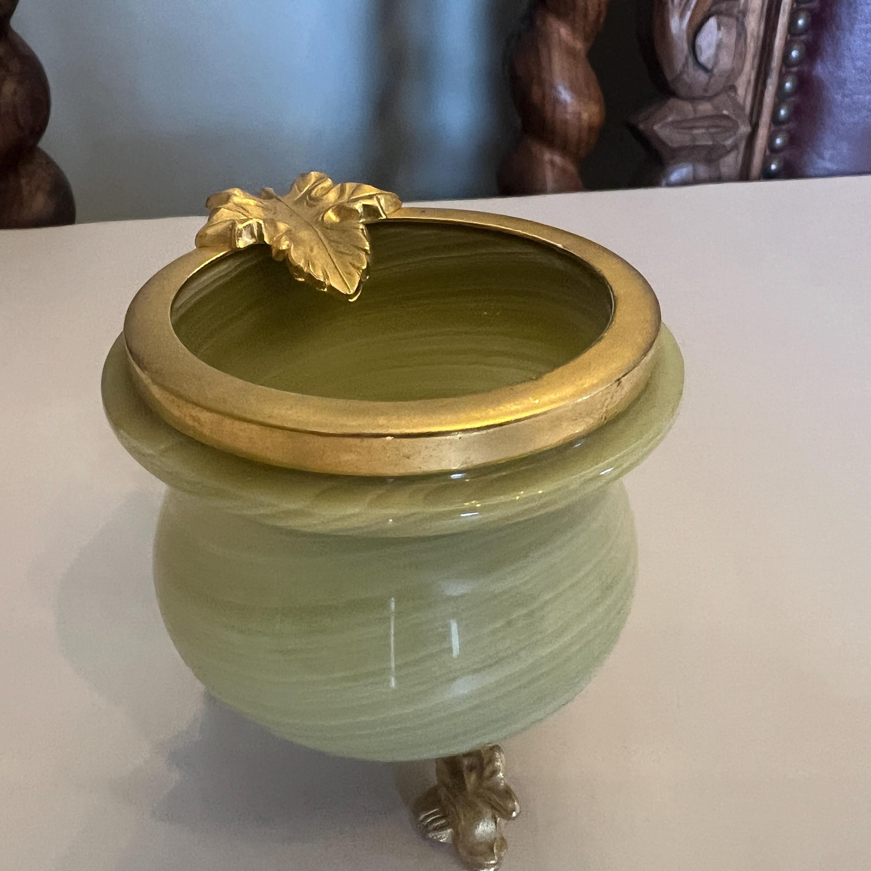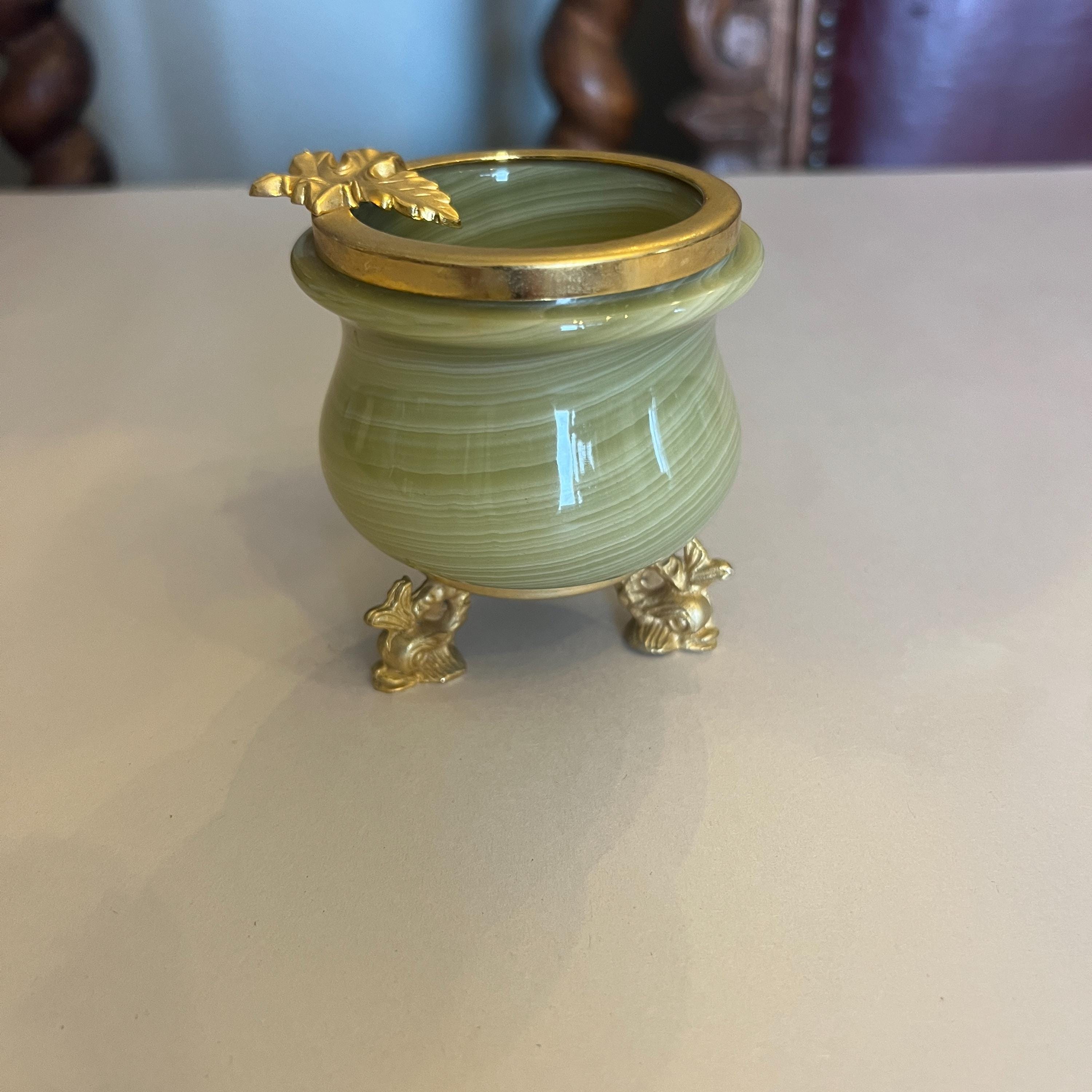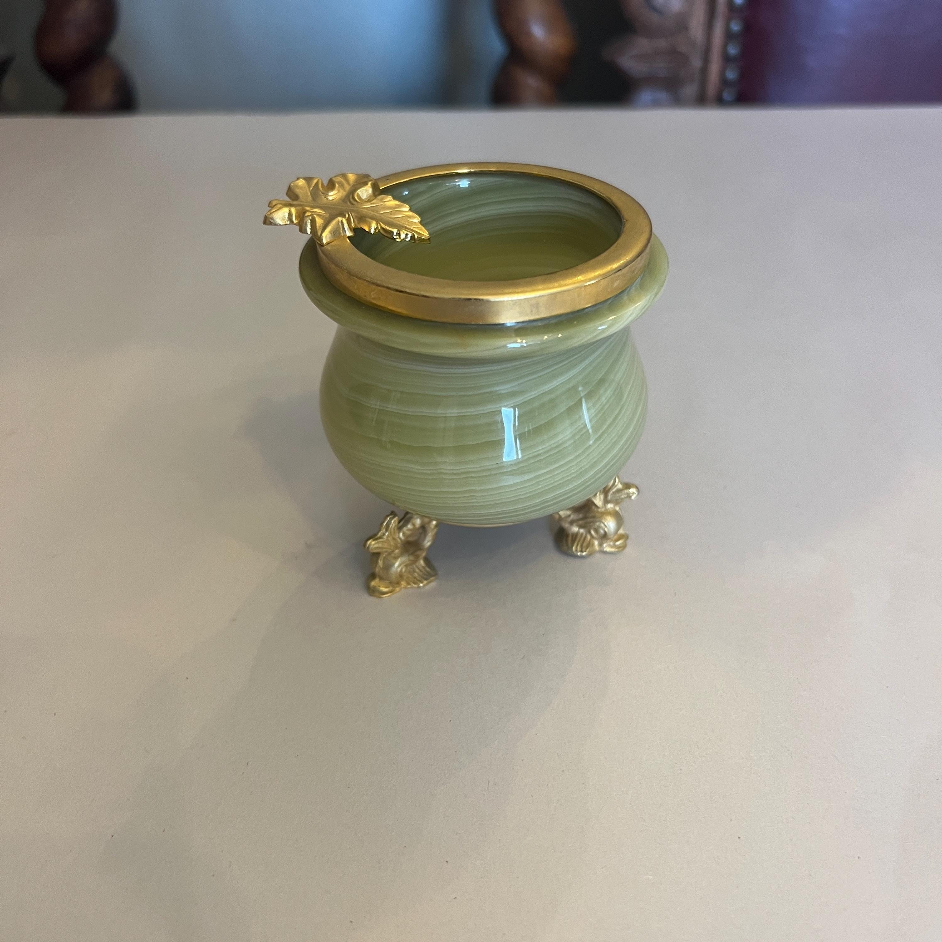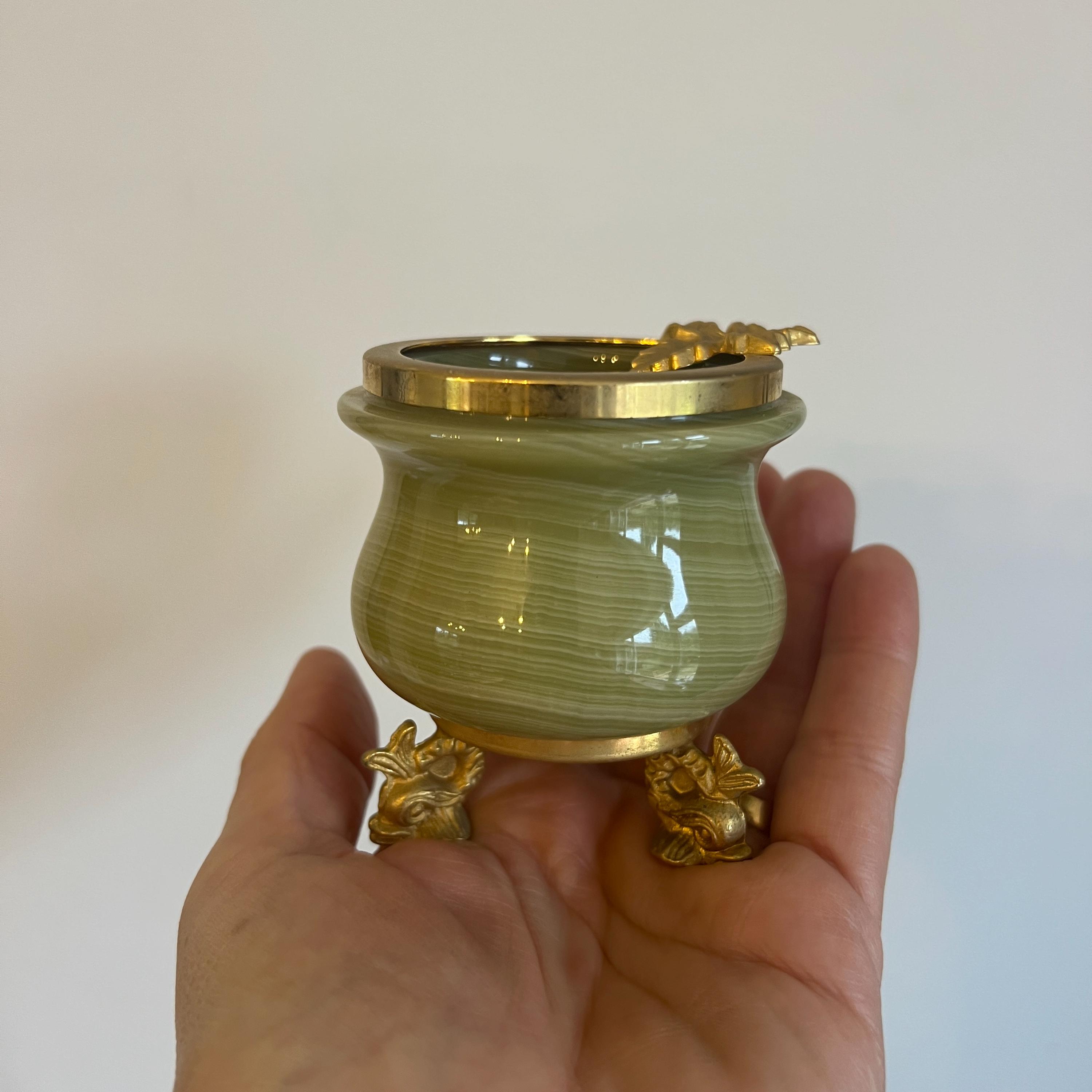 A pretty, vintage onyx style stone ashtray or decorative pot. The pot appears to have been made from a banded green onyx style stone and stands on 3 gilded fish shaped feet. The top has a rim of gilded metal and a leaf shape, perfect for balancing a cigarette, although this could just be used as a decorative item. The item appears to be unused and is in excellent condition, although there is a minor amount of dulling to the gilding in places. Elegant and interesting.