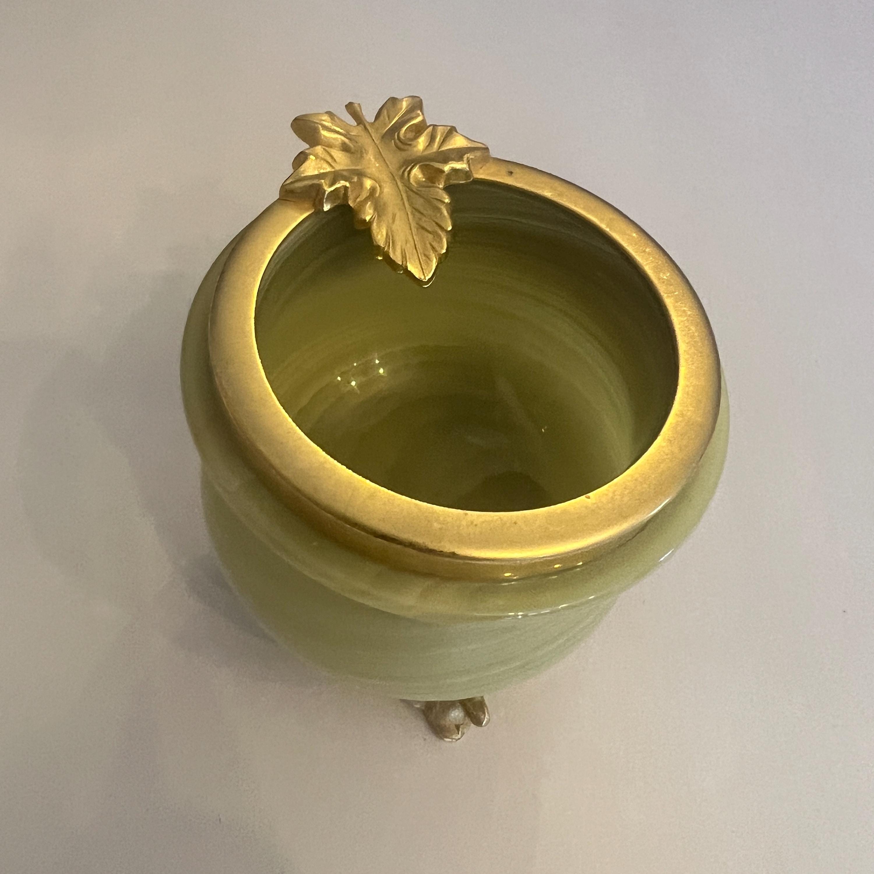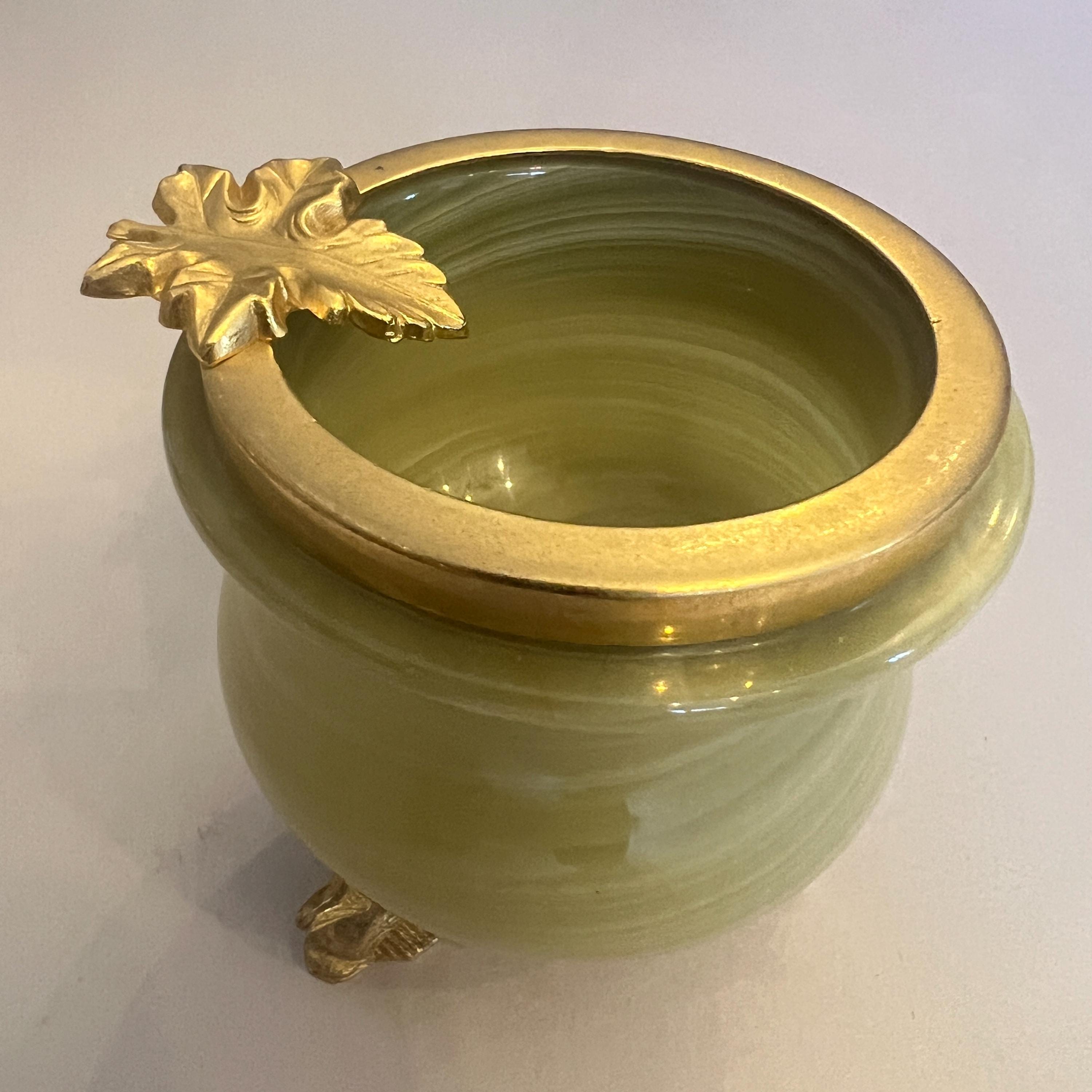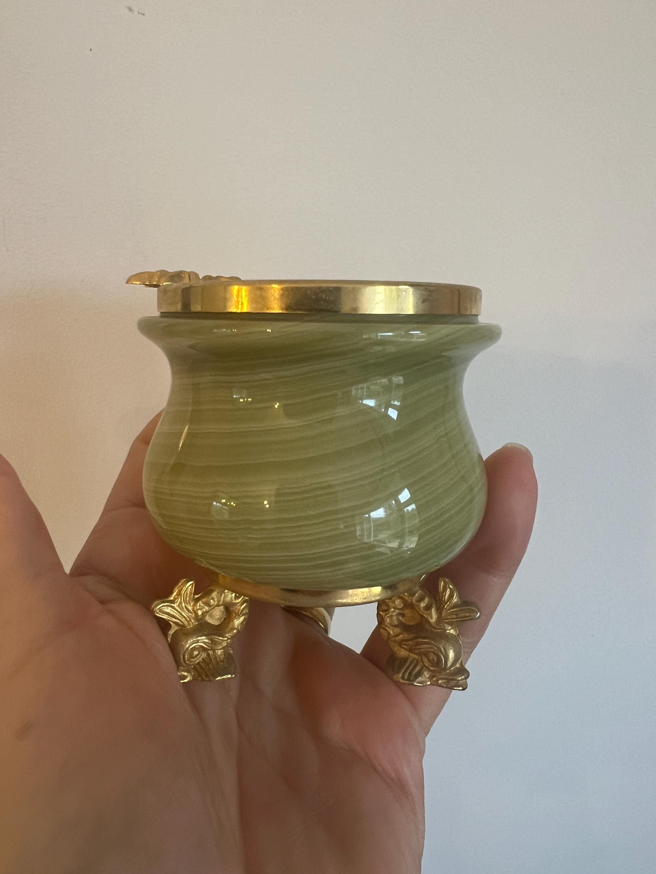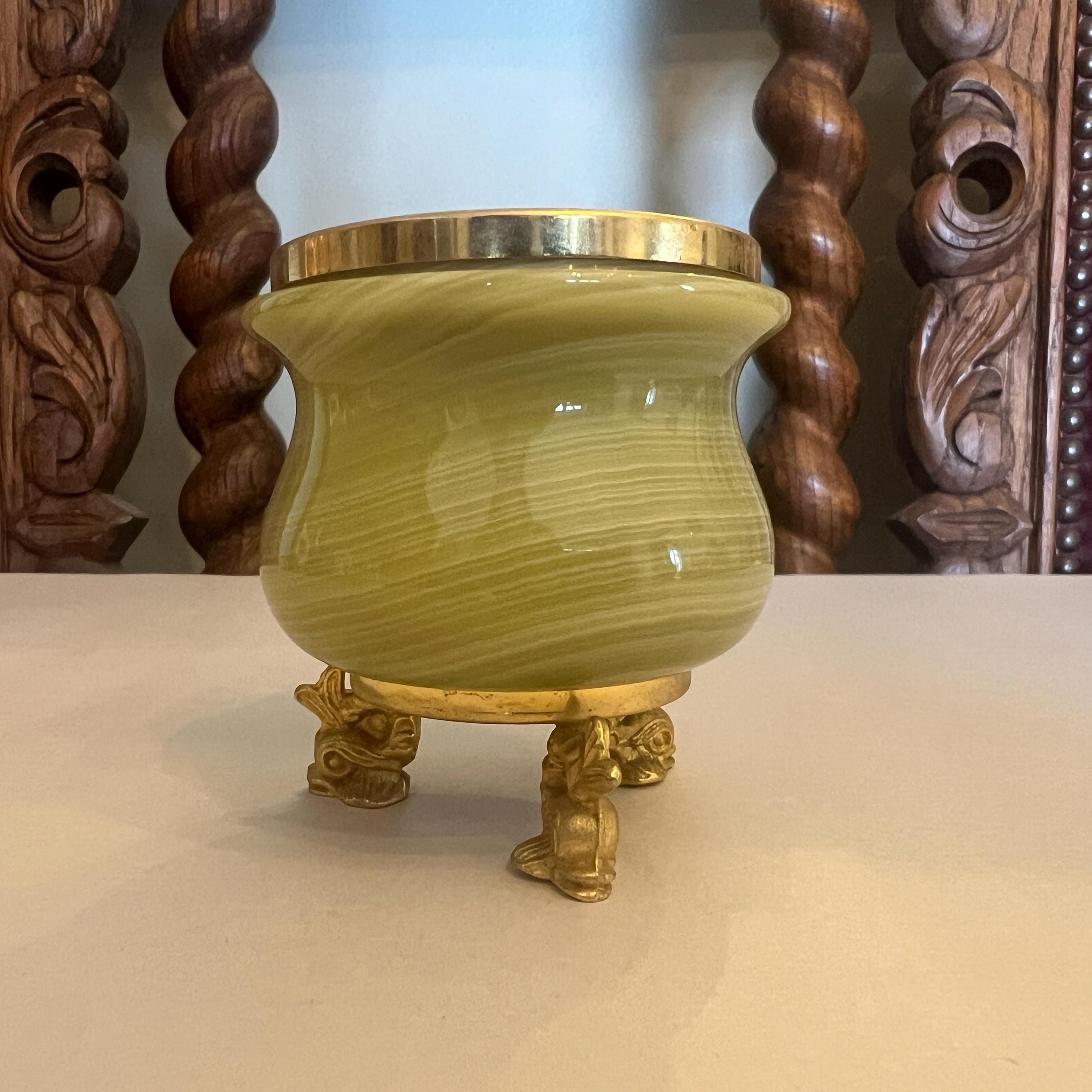 A pretty, vintage onyx style stone ashtray or decorative pot. The pot appears to have been made from a banded green onyx style stone and stands on 3 gilded fish shaped feet. The top has a rim of gilded metal and a leaf shape, perfect for balancing a cigarette, although this could just be used as a decorative item. The item appears to be unused and is in excellent condition, although there is a minor amount of dulling to the gilding in places. Elegant and interesting.