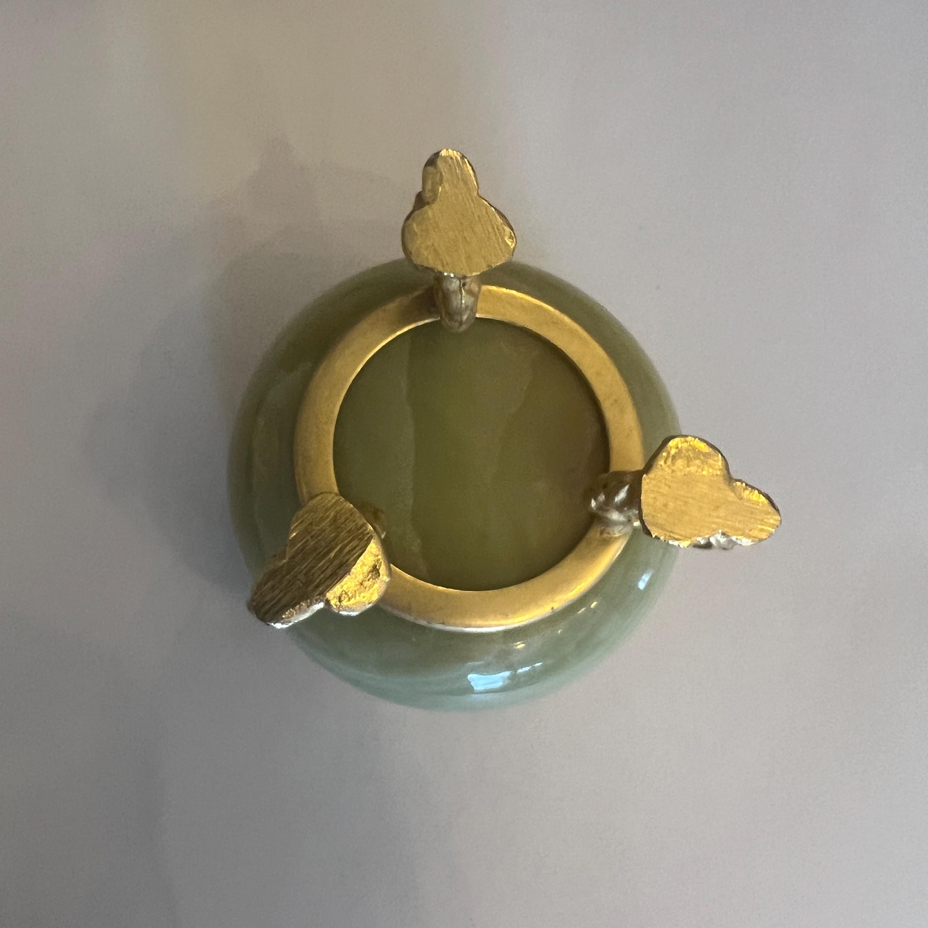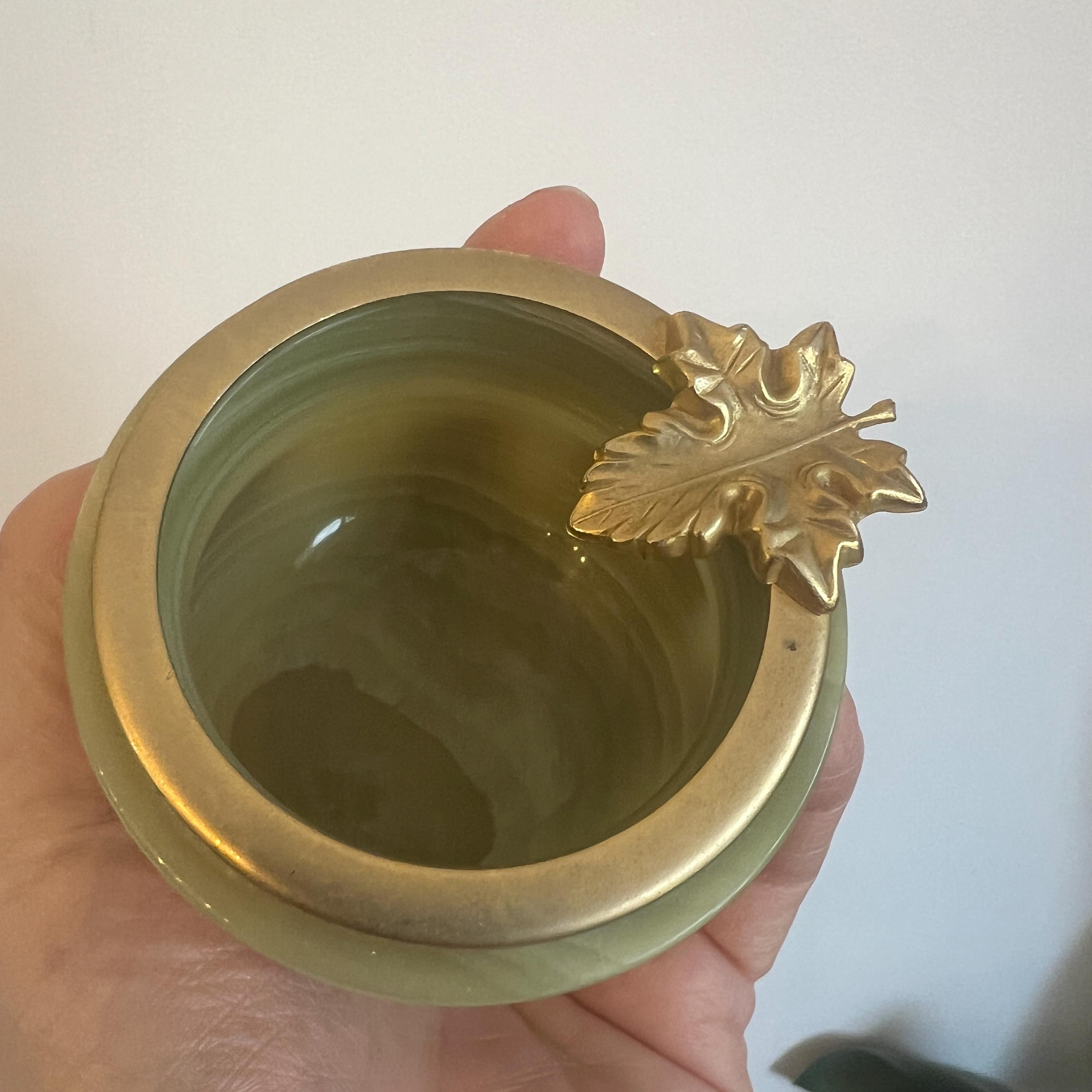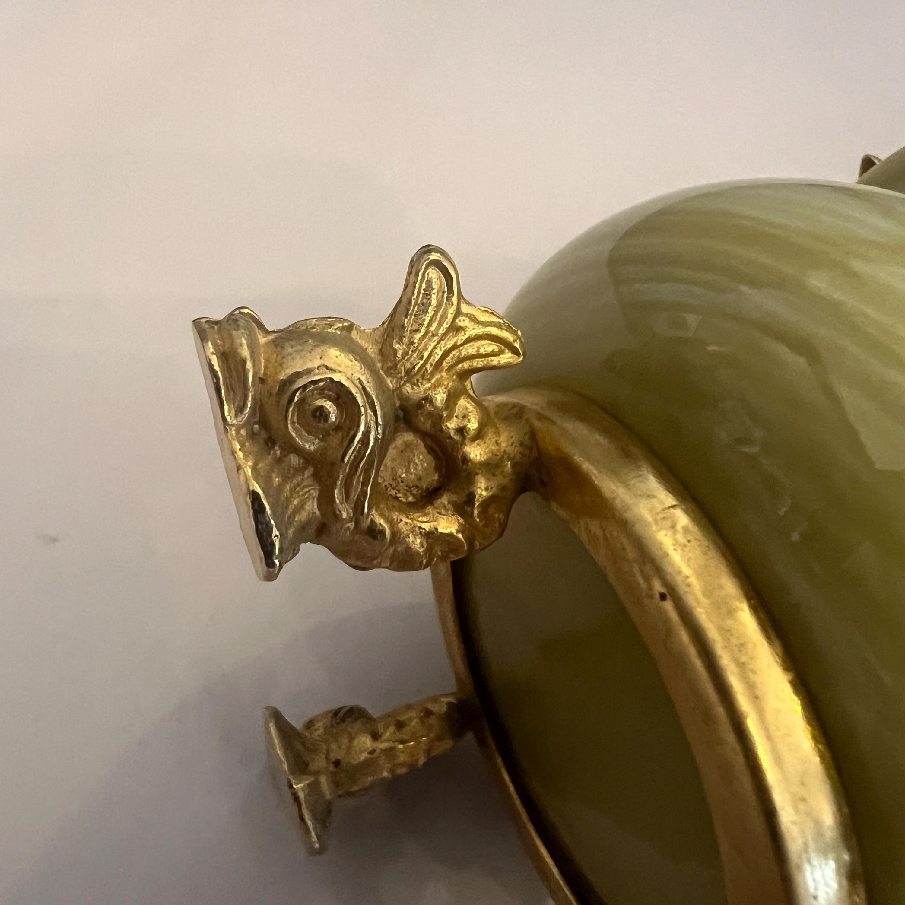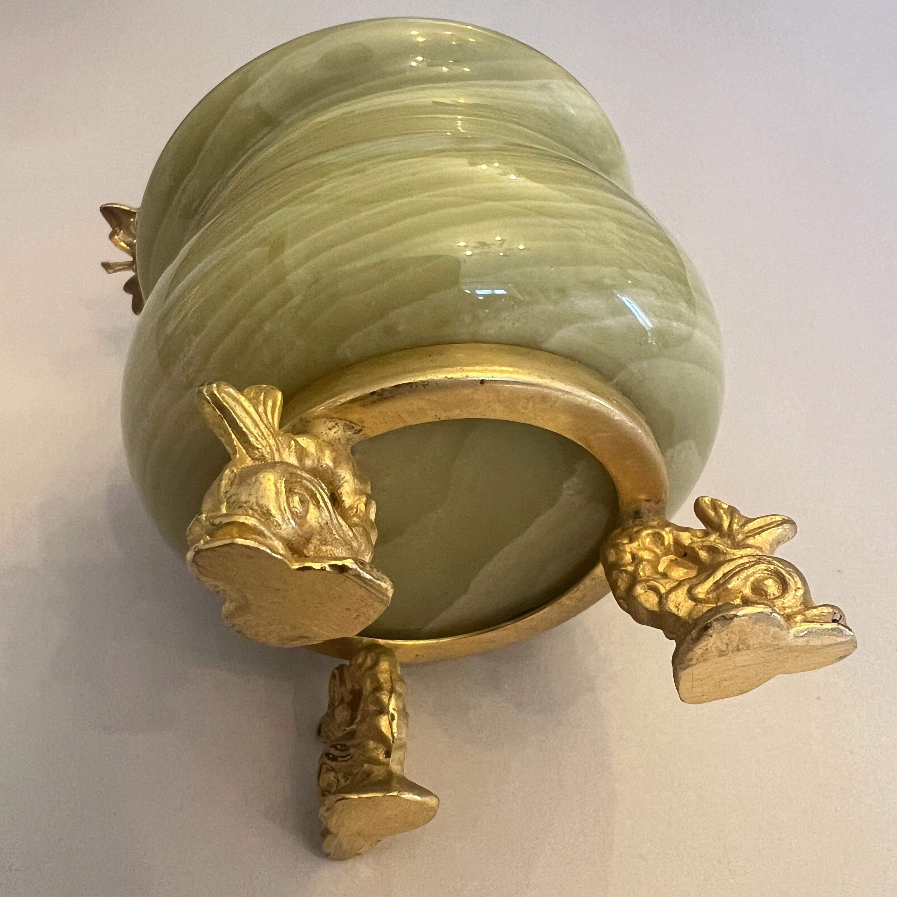 A pretty, vintage onyx style stone ashtray or decorative pot. The pot appears to have been made from a banded green onyx style stone and stands on 3 gilded fish shaped feet. The top has a rim of gilded metal and a leaf shape, perfect for balancing a cigarette, although this could just be used as a decorative item. The item appears to be unused and is in excellent condition, although there is a minor amount of dulling to the gilding in places. Elegant and interesting.