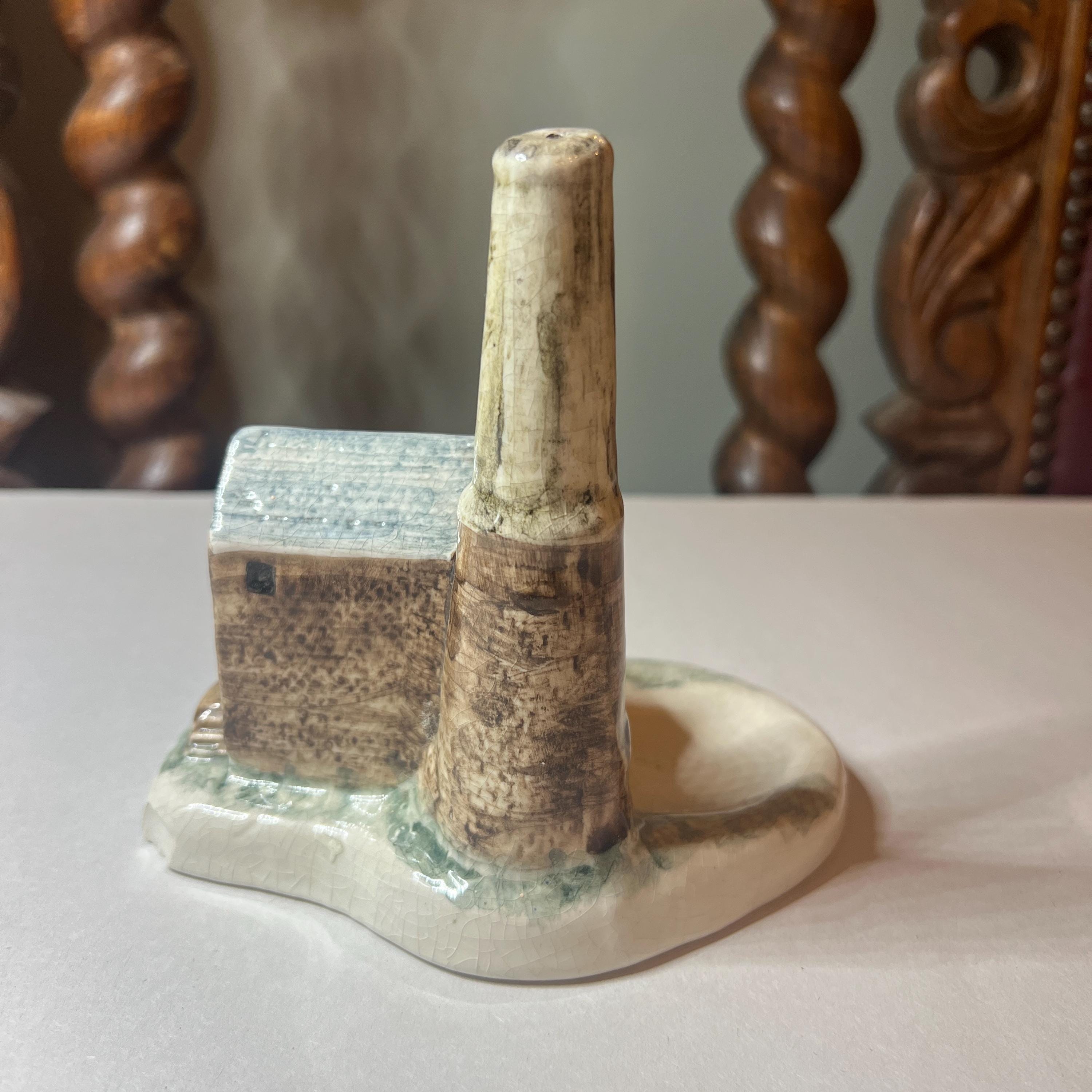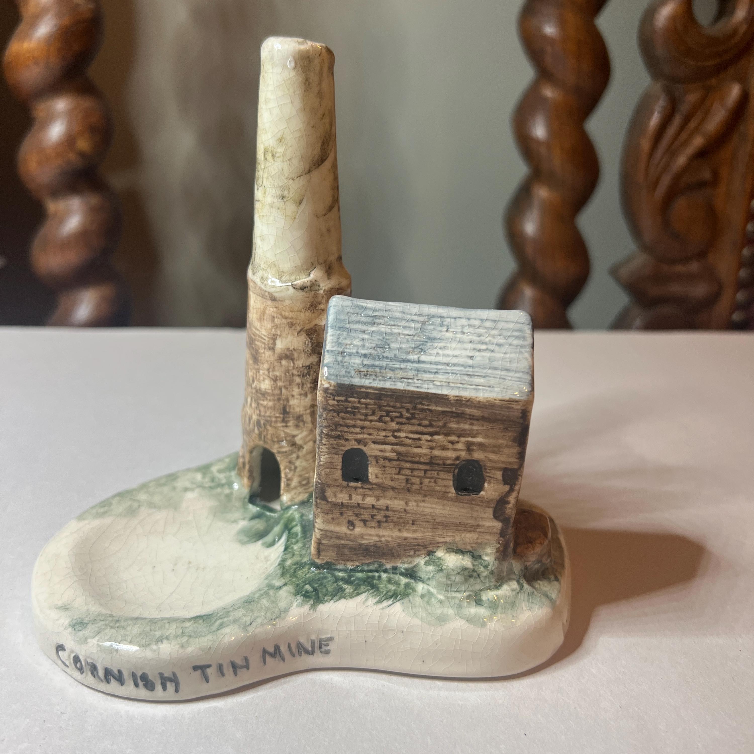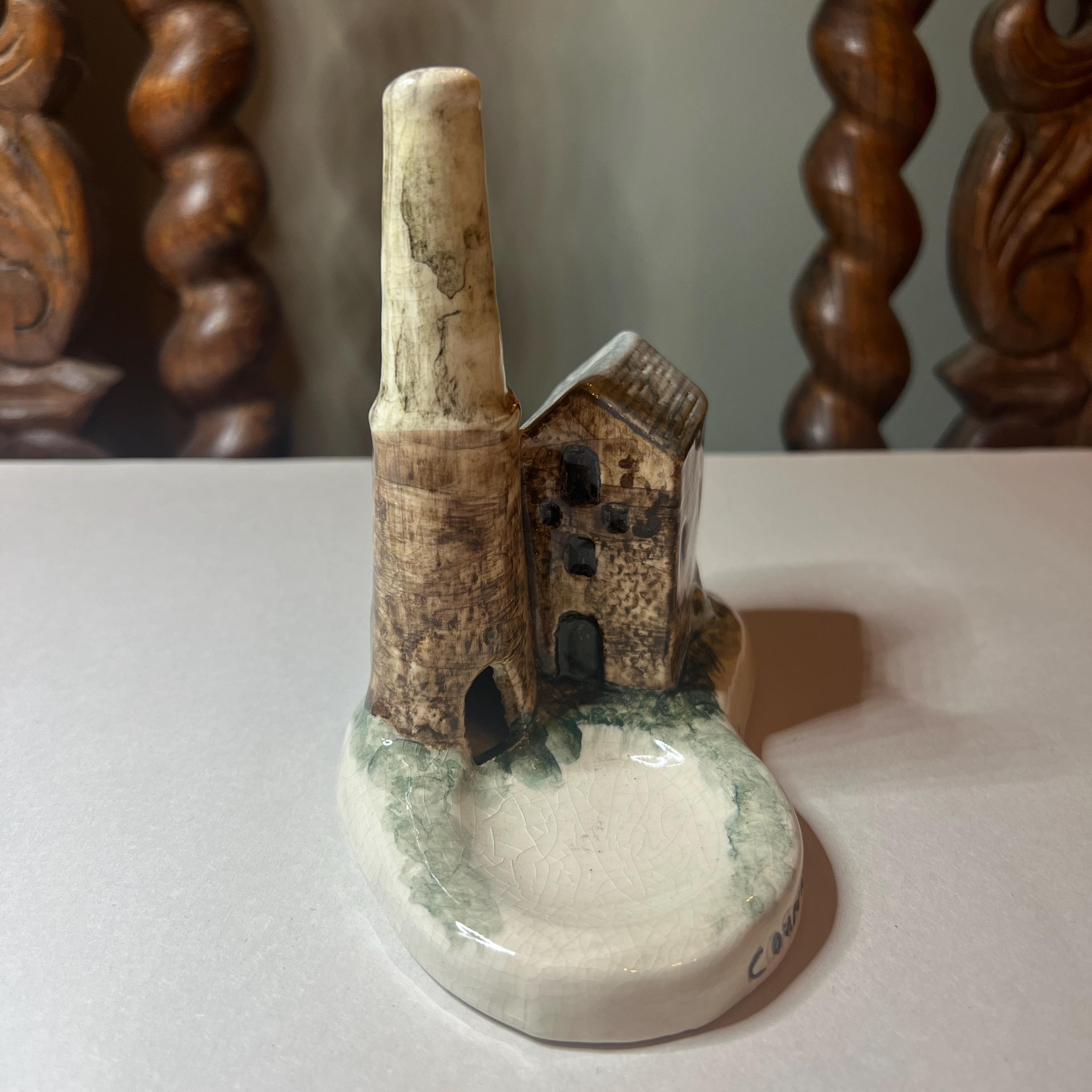 A quirky piece of souvenir hand painted pottery from Cornwall celebrating the heritage of the Cornish tin mine. It doesn't have a maker's mark, however other similar items were made by Duchy Pottery and carried a maker's sticker. I'm not sure of its purpose. I wonder if the idea is to place the lit end of the cigarette near the open door of the chimney so that the smoke is drawn upwards and out of the hole in the chimney top? It could also be used as a trinket dish, with rings placed on the chimney.