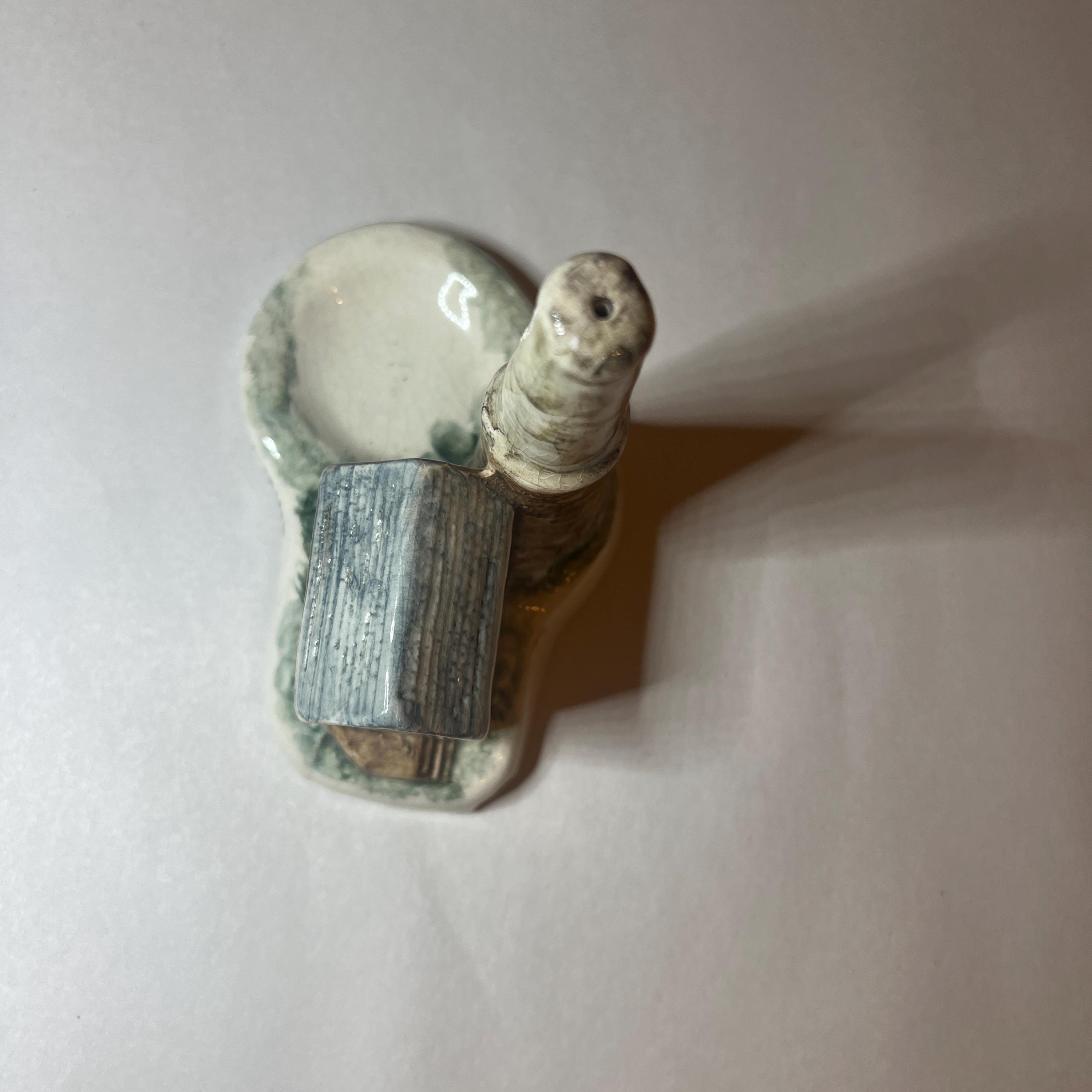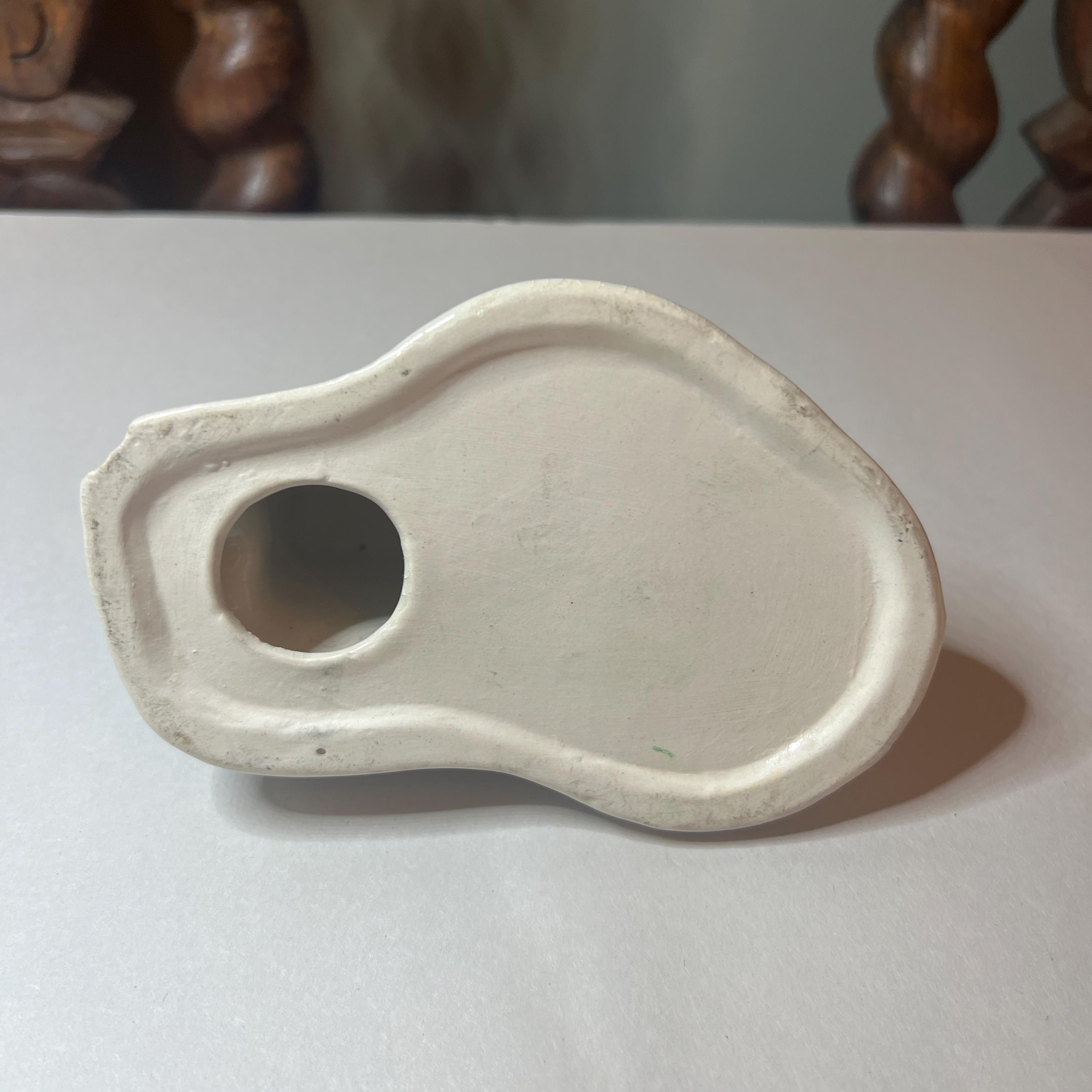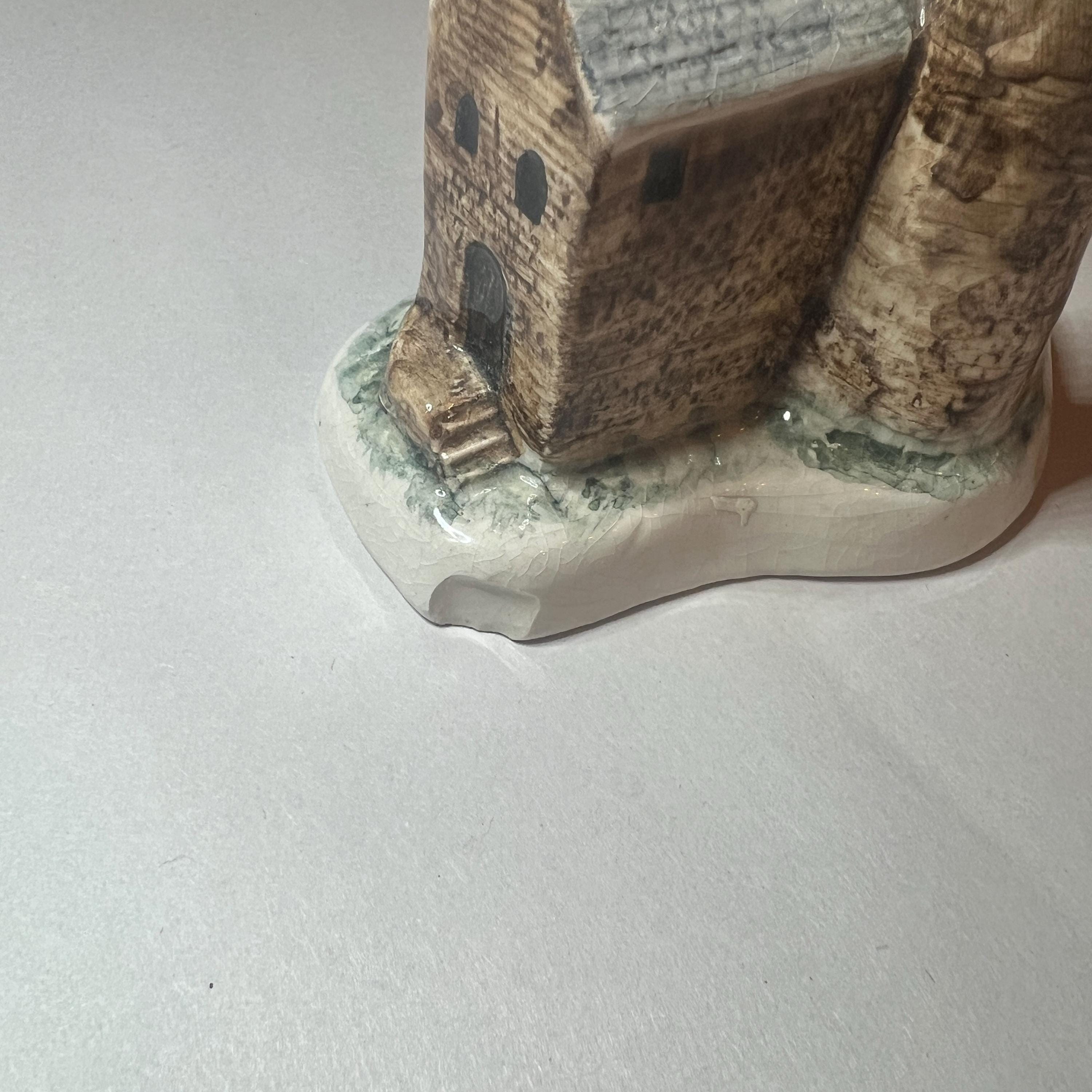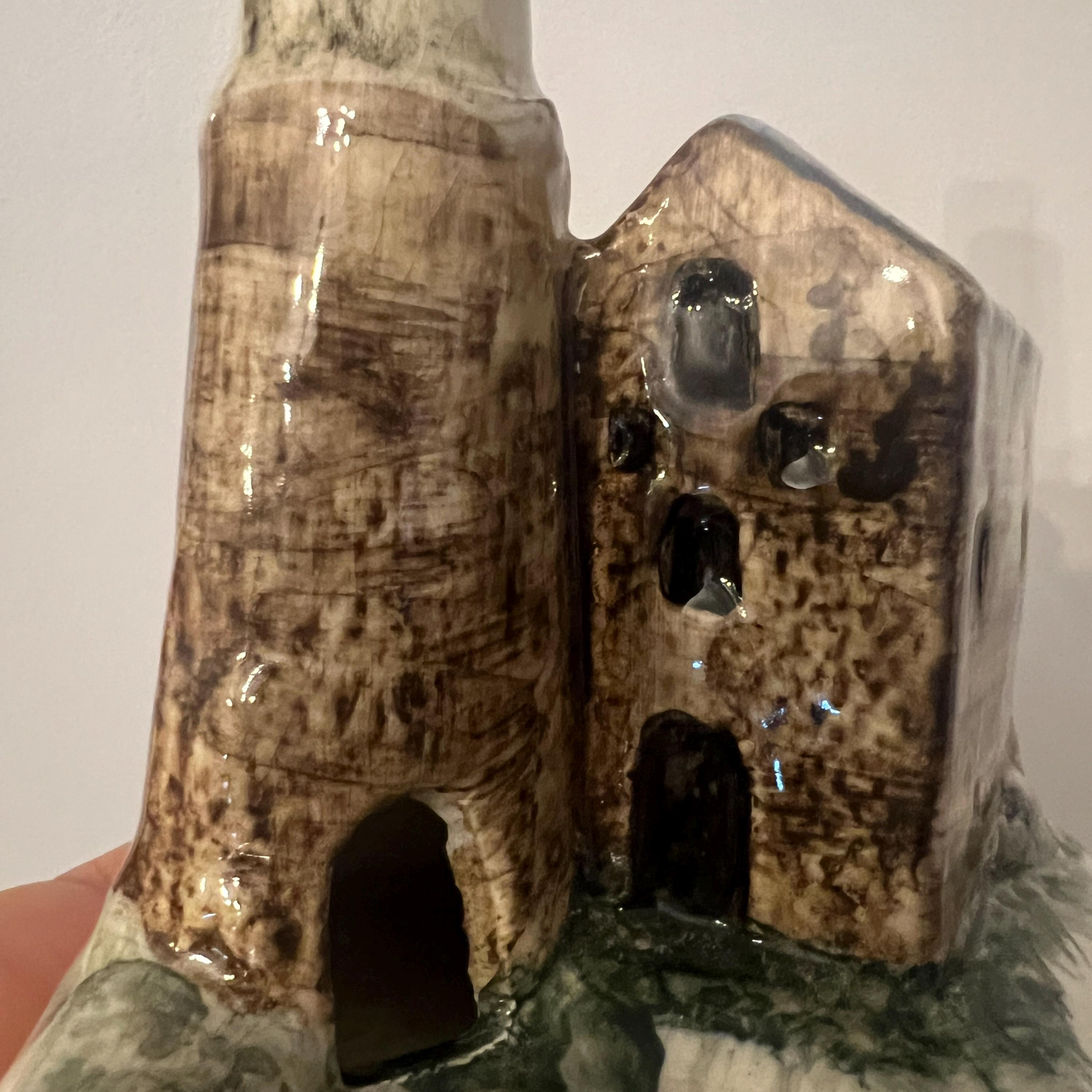 A quirky piece of souvenir hand painted pottery from Cornwall celebrating the heritage of the Cornish tin mine. It doesn't have a maker's mark, however other similar items were made by Duchy Pottery and carried a maker's sticker. I'm not sure of its purpose. I wonder if the idea is to place the lit end of the cigarette near the open door of the chimney so that the smoke is drawn upwards and out of the hole in the chimney top? It could also be used as a trinket dish, with rings placed on the chimney.