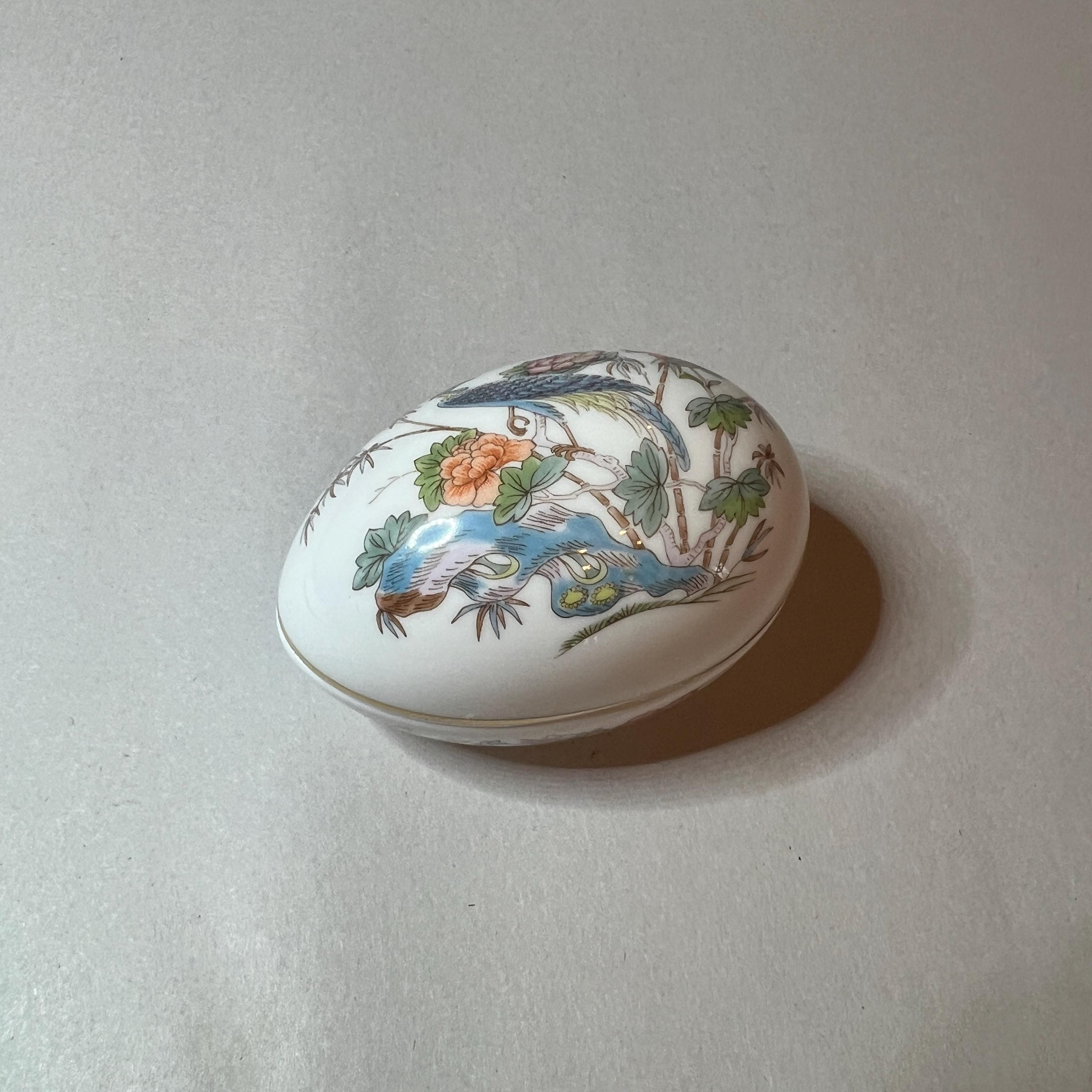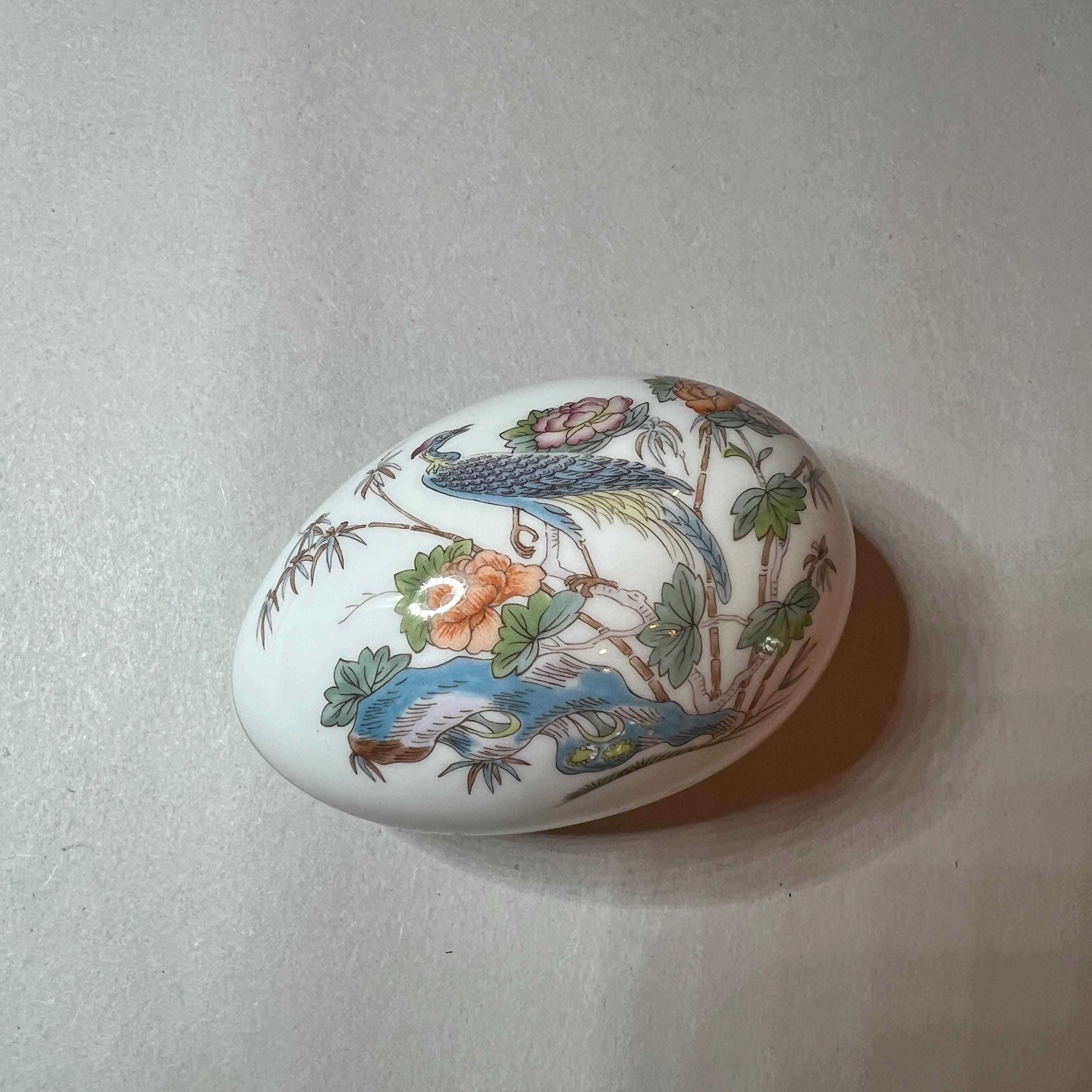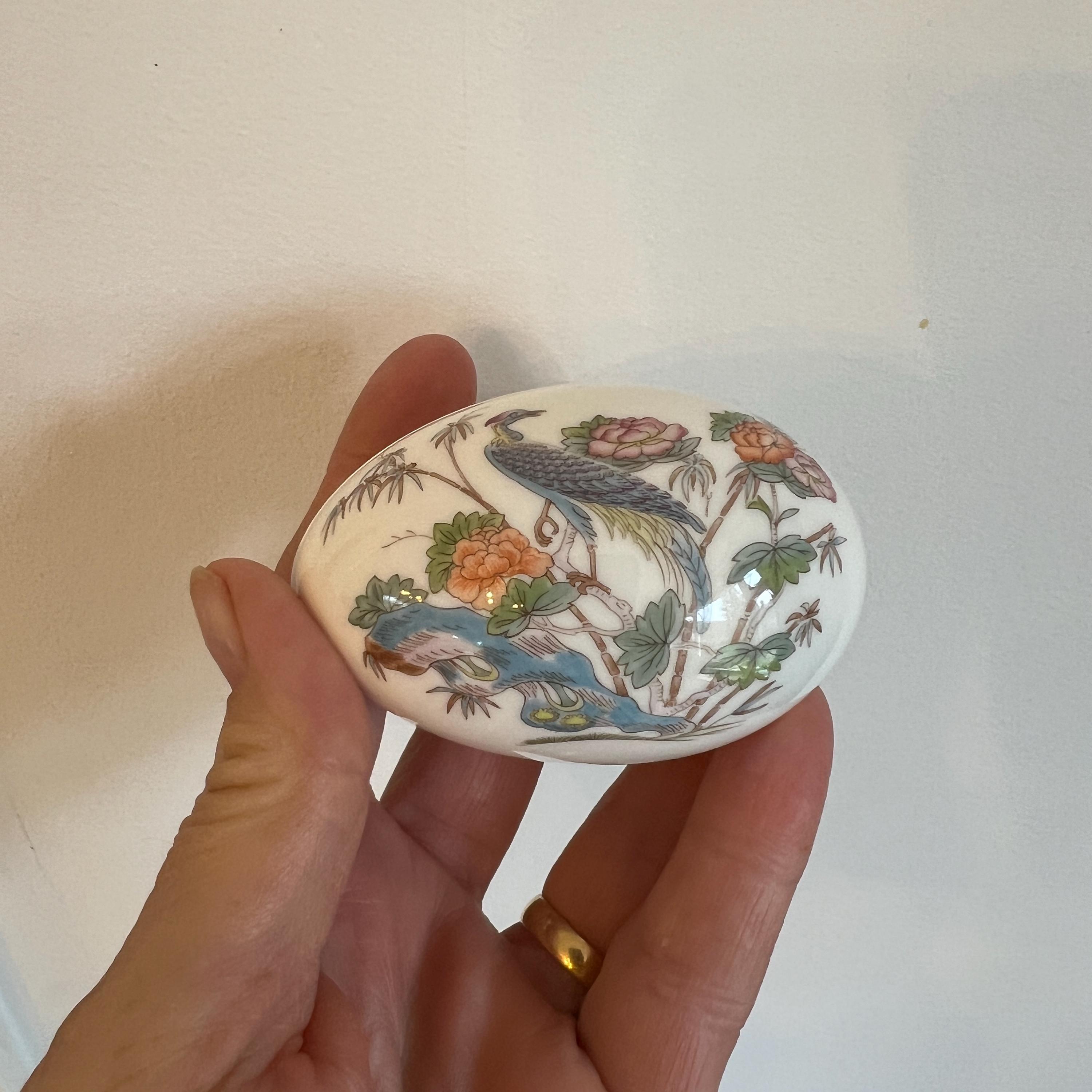 The Kutani Crane design was produced by Wedgwood between the early 1970's and late 1990's and is now discontinued. This lovely little bone china egg shaped trinket box is about the same size as a large hen's egg and in excellent condition. It has golden gilding around the rim of the lid and an intricate pattern design on both the top and bottom halves. It is stamped with the maker's mark on the base.