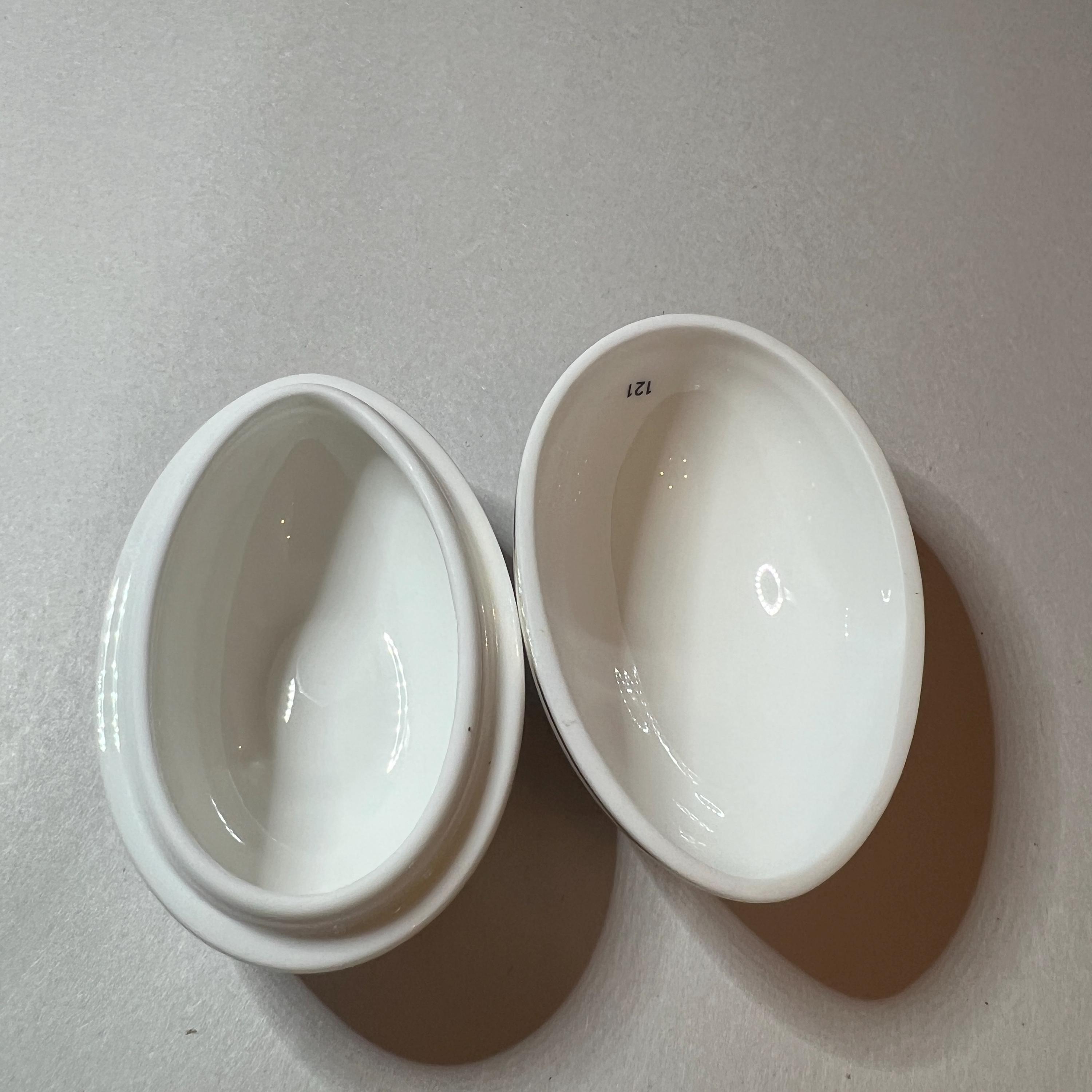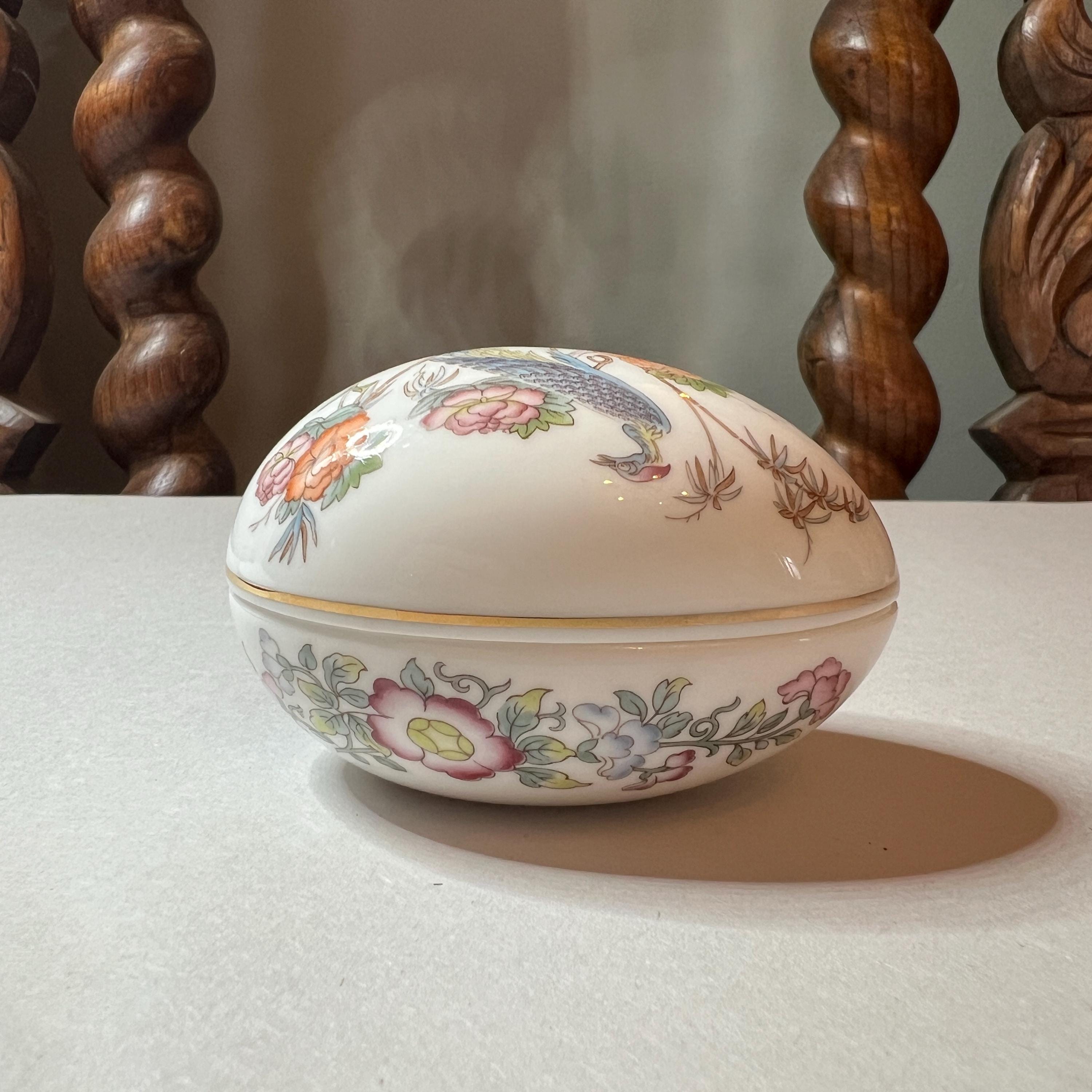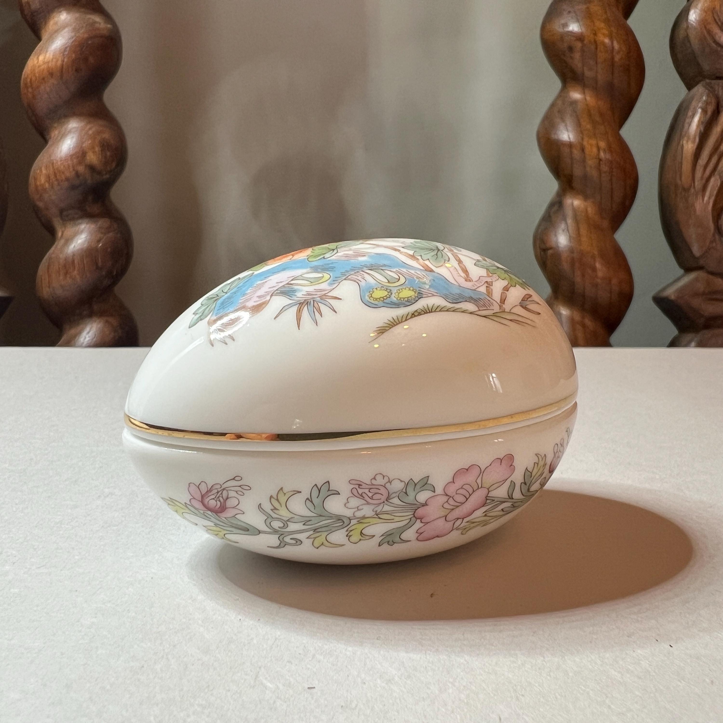 The Kutani Crane design was produced by Wedgwood between the early 1970's and late 1990's and is now discontinued. This lovely little bone china egg shaped trinket box is about the same size as a large hen's egg and in excellent condition. It has golden gilding around the rim of the lid and an intricate pattern design on both the top and bottom halves. It is stamped with the maker's mark on the base.
