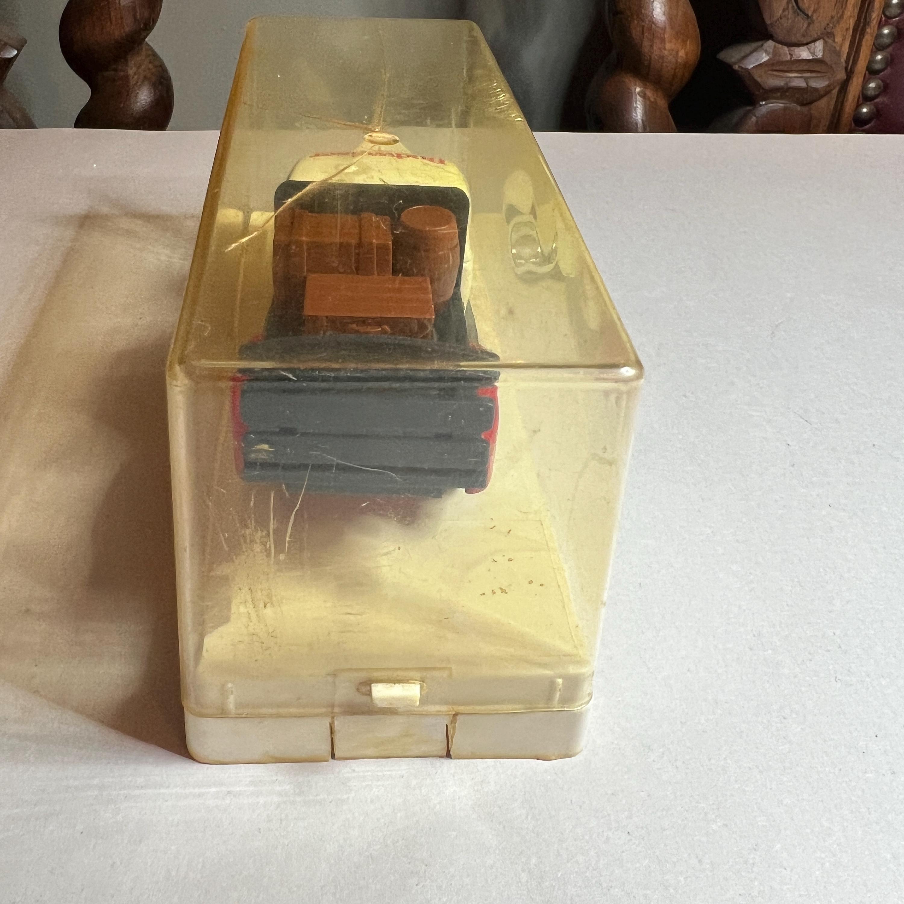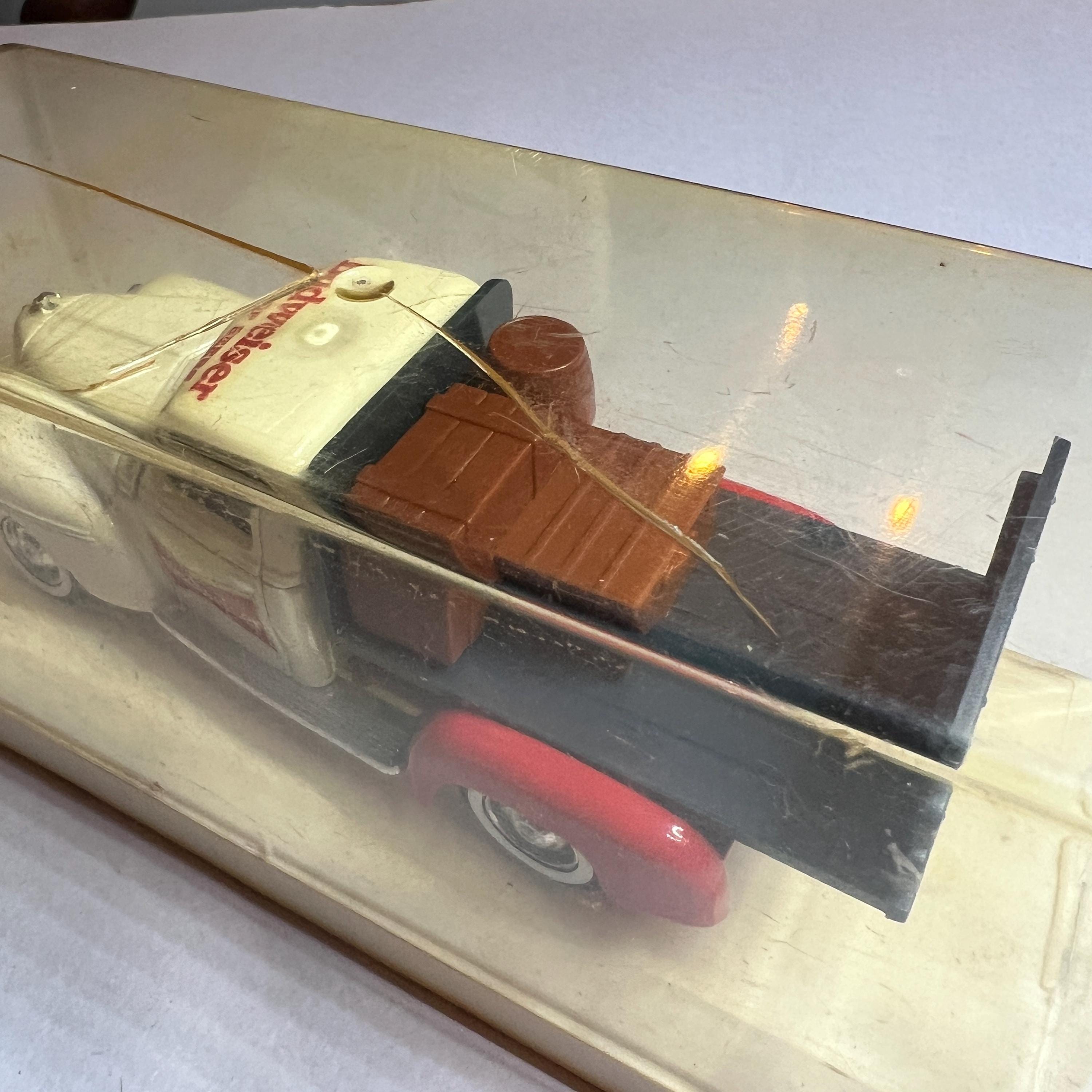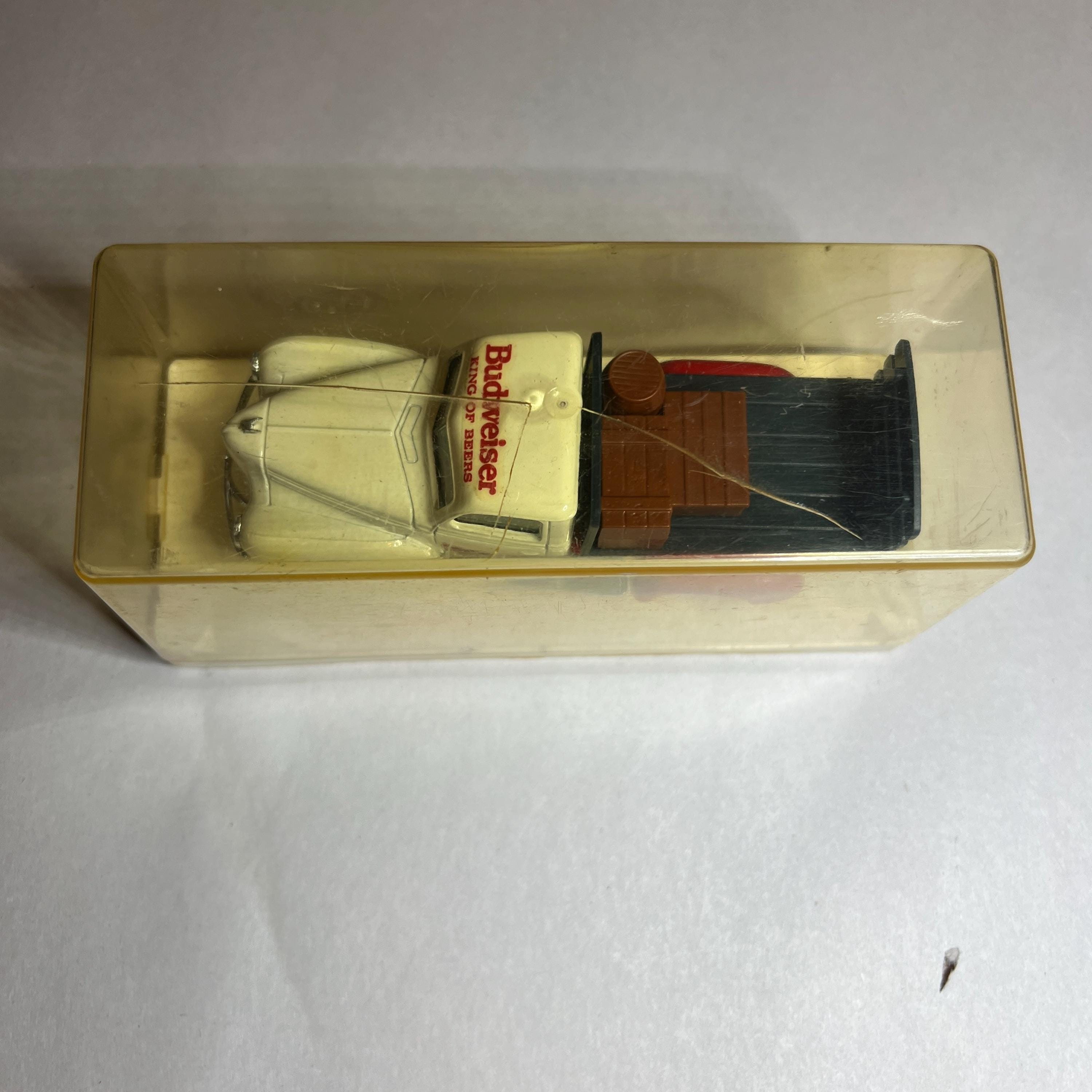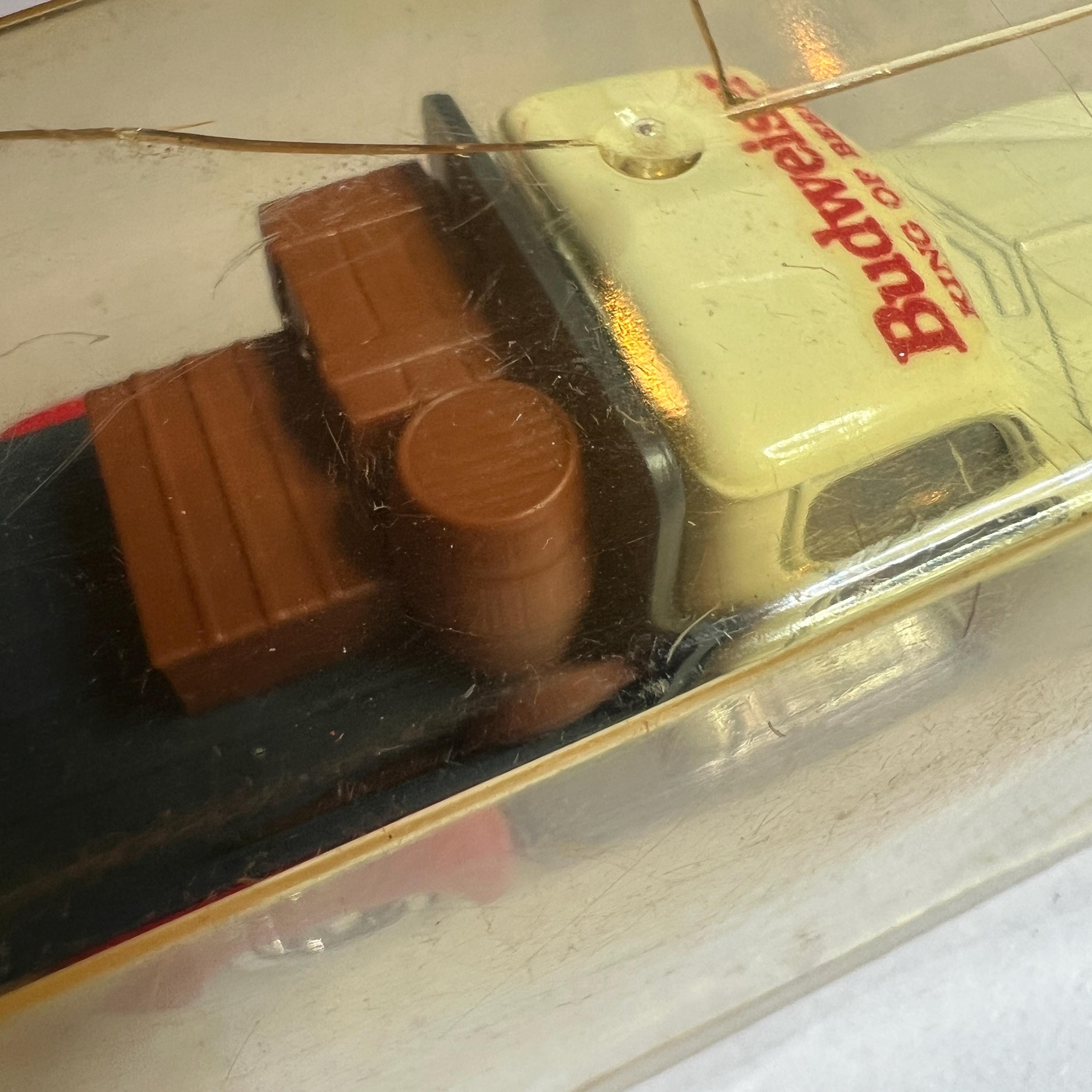 A lovely die cast model by Solido, France. This model is number 9181, a 1:43 scale Dodge pick up Budweiser delivery truck. The truck inside appears to be in excellent condition and is screwed into place, however the plastic case has discoloured and become yellowed and there is some damage to the plastic lid. This can be seen in the photographs. The plastic case measures approximately 15cm long, 7cm tall and 6cm wide.
