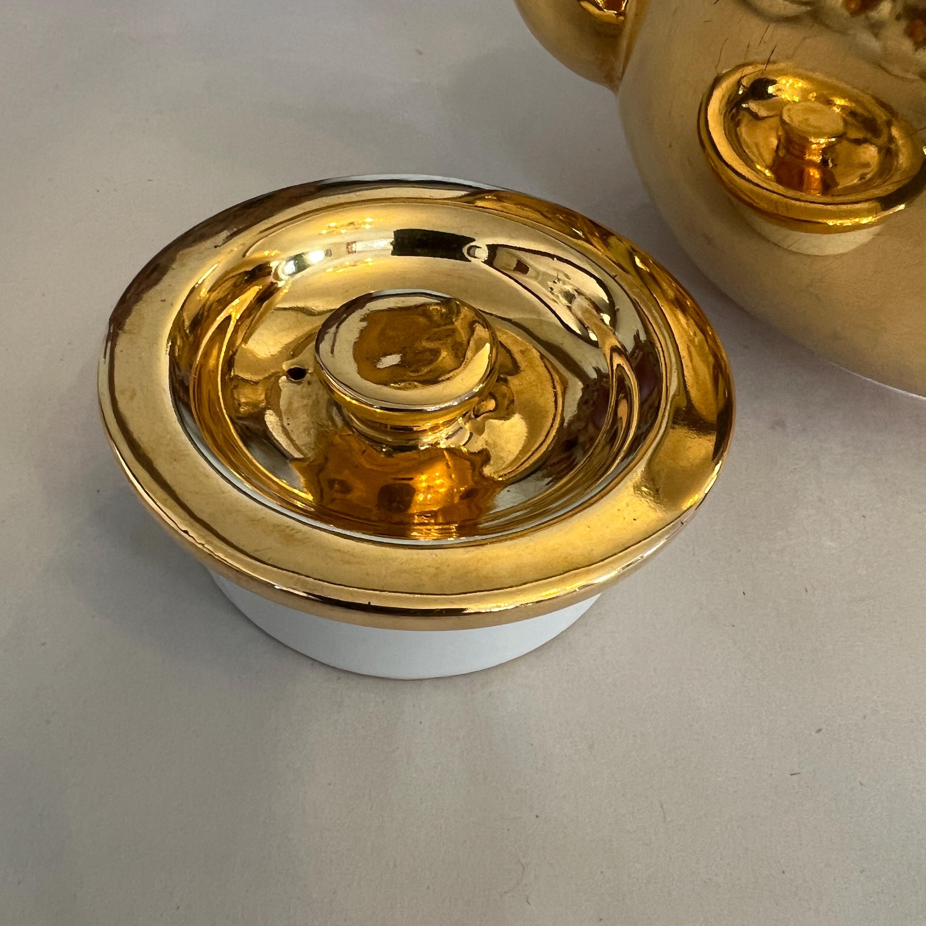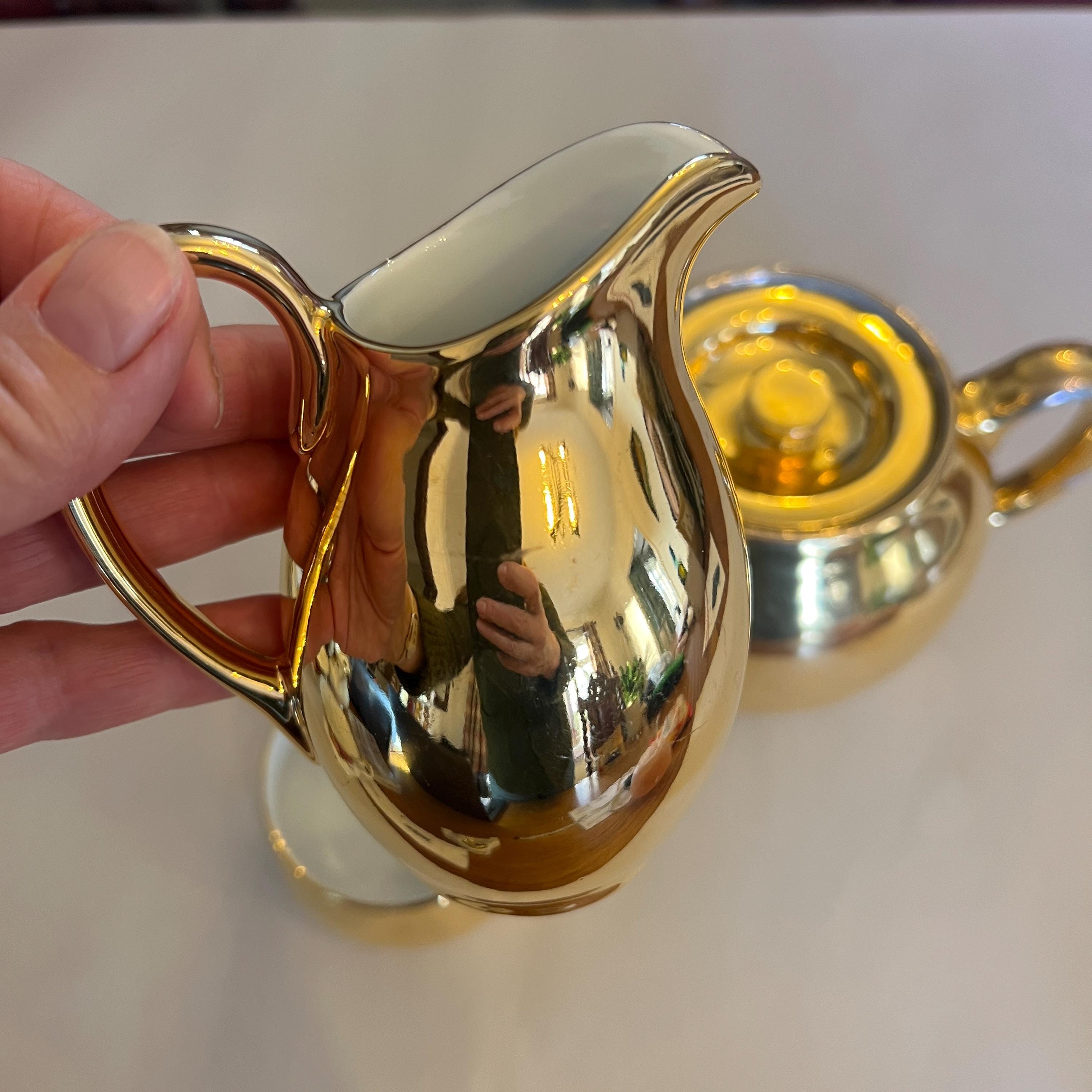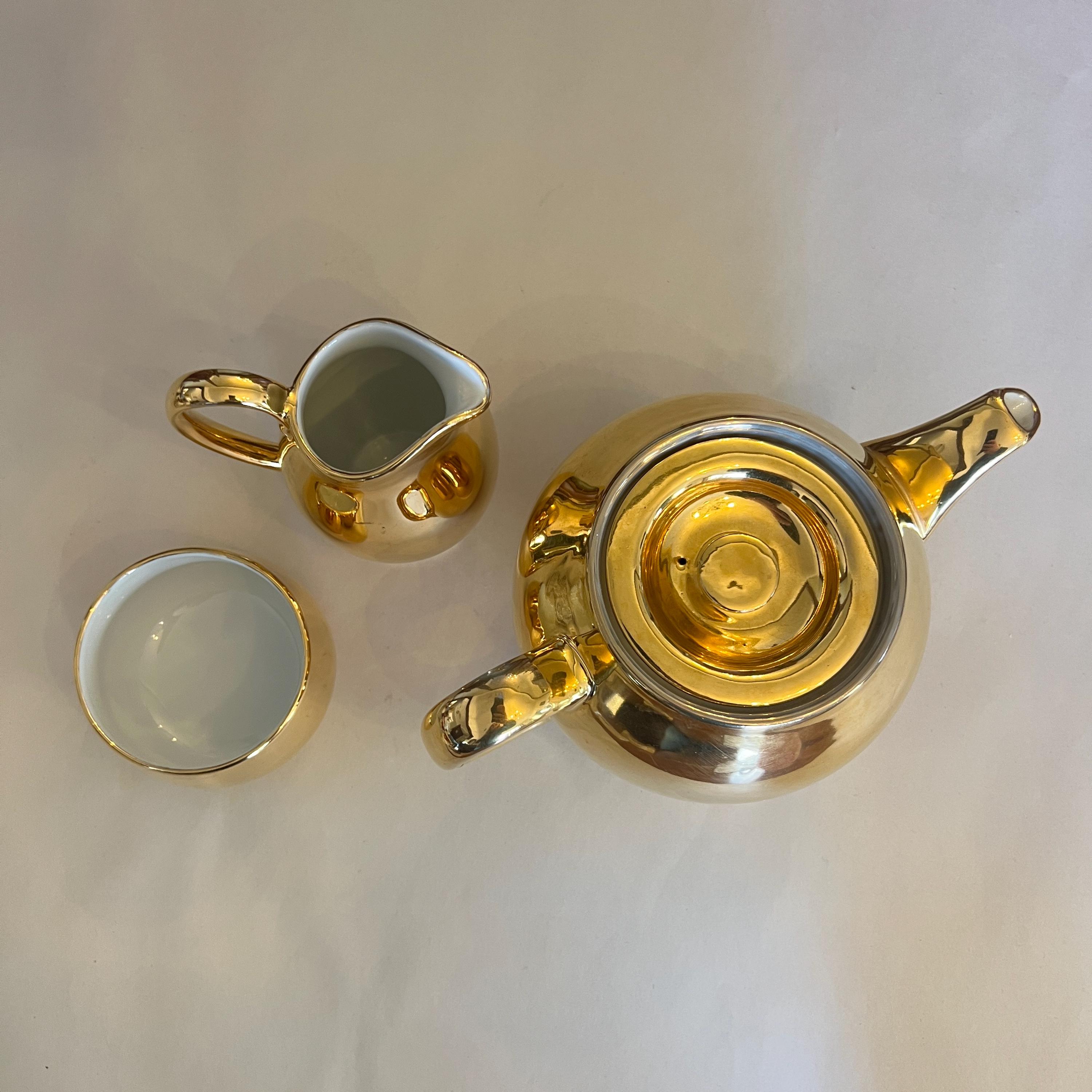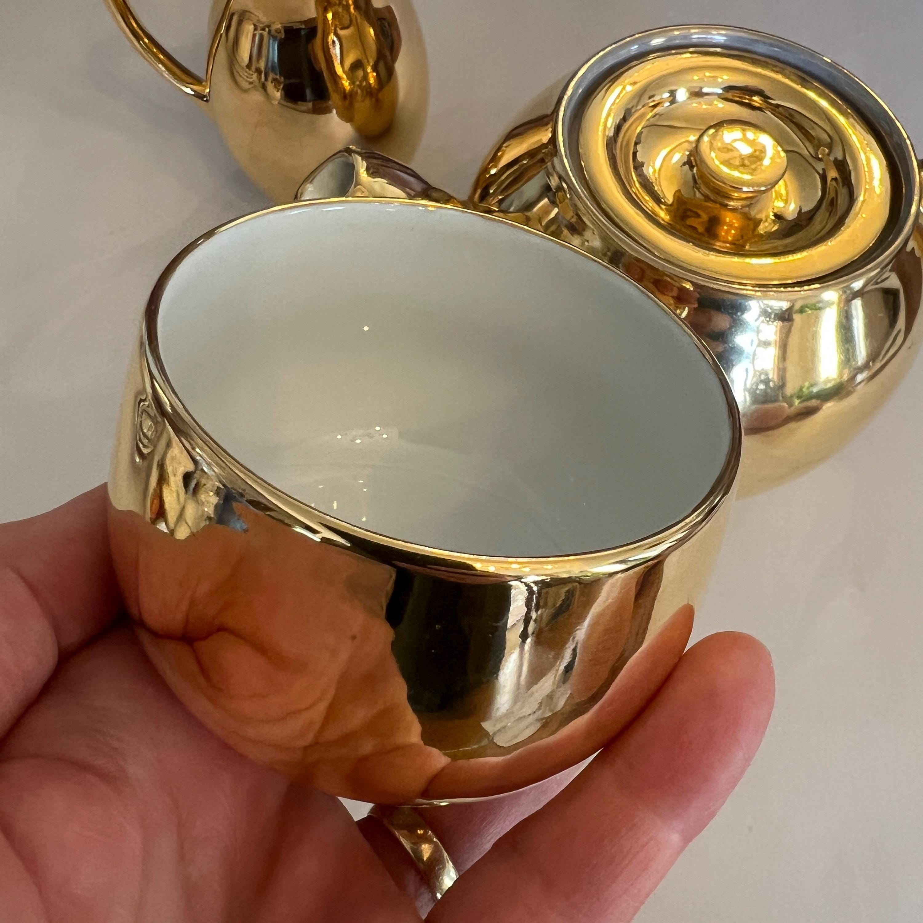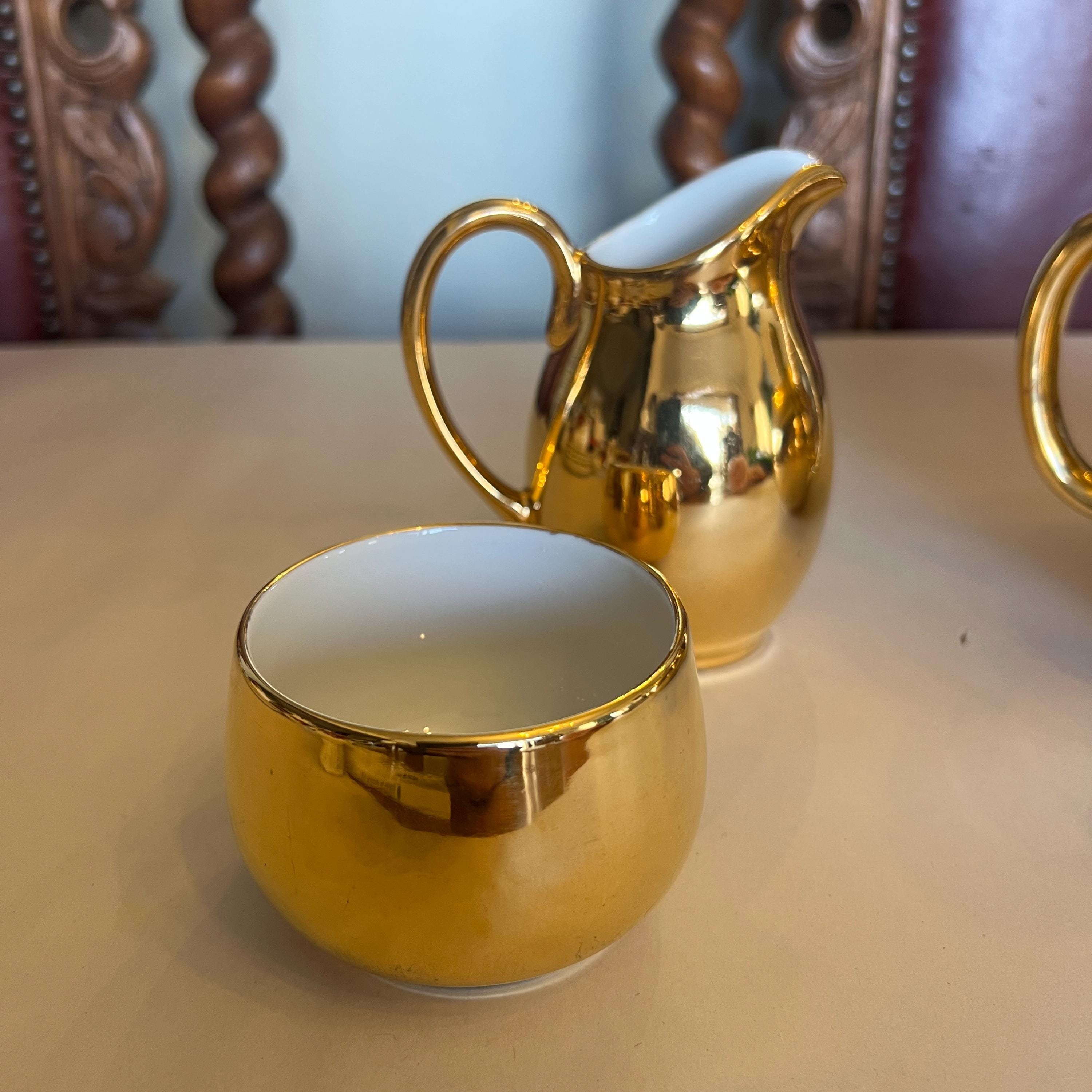 The milk jug and sugar bowl show minor signs of wear and use on the gold. All items show some signs of use on the bottom surface from standing.