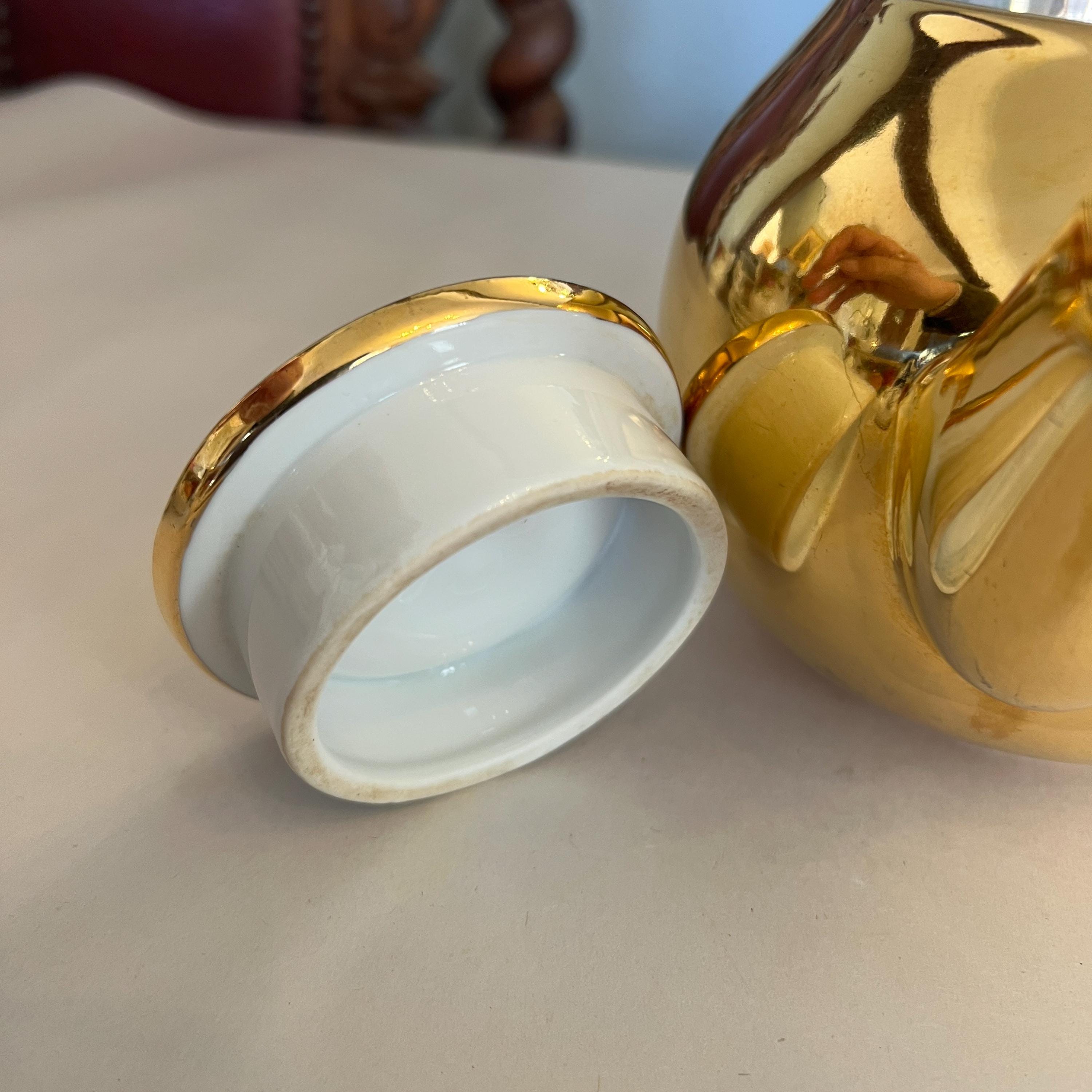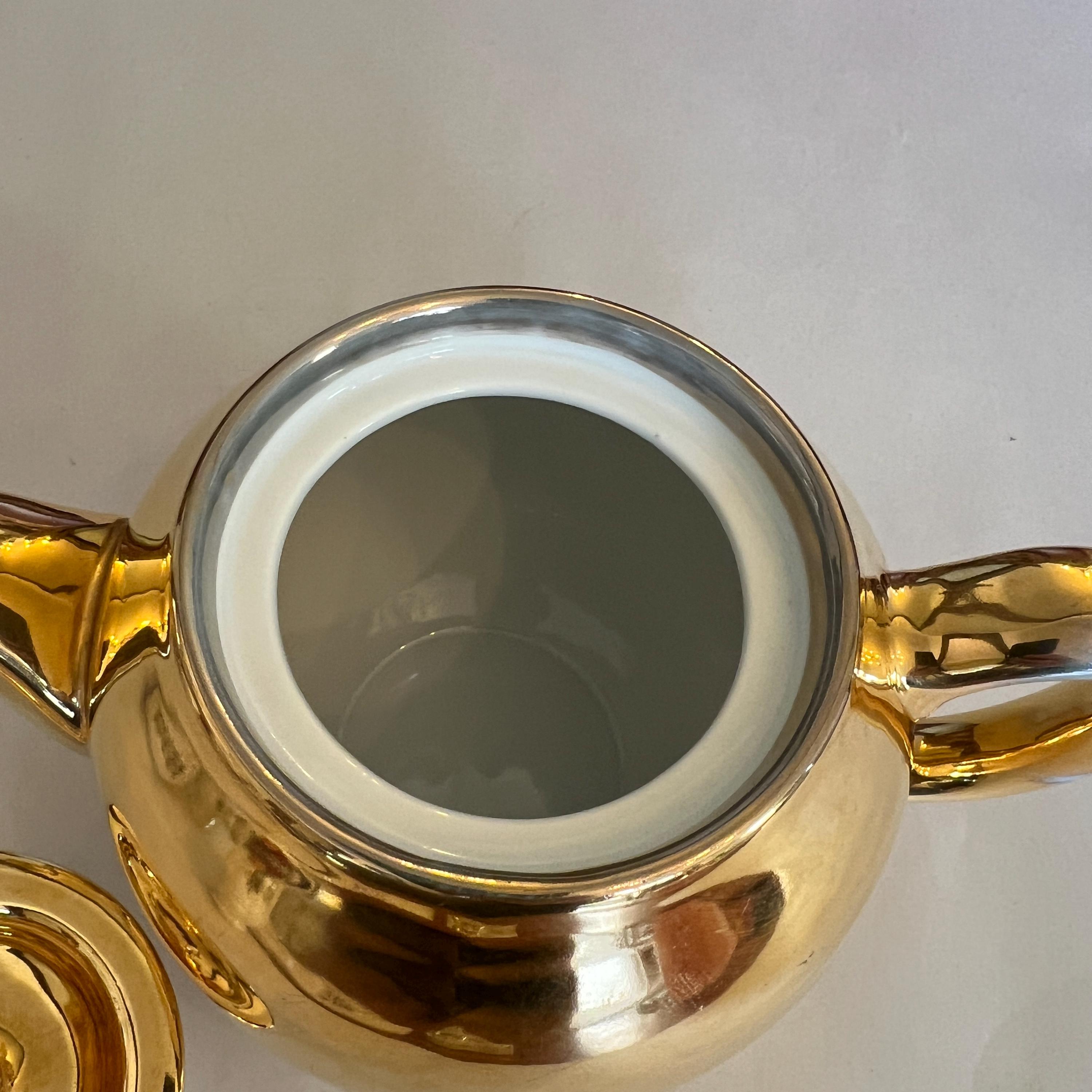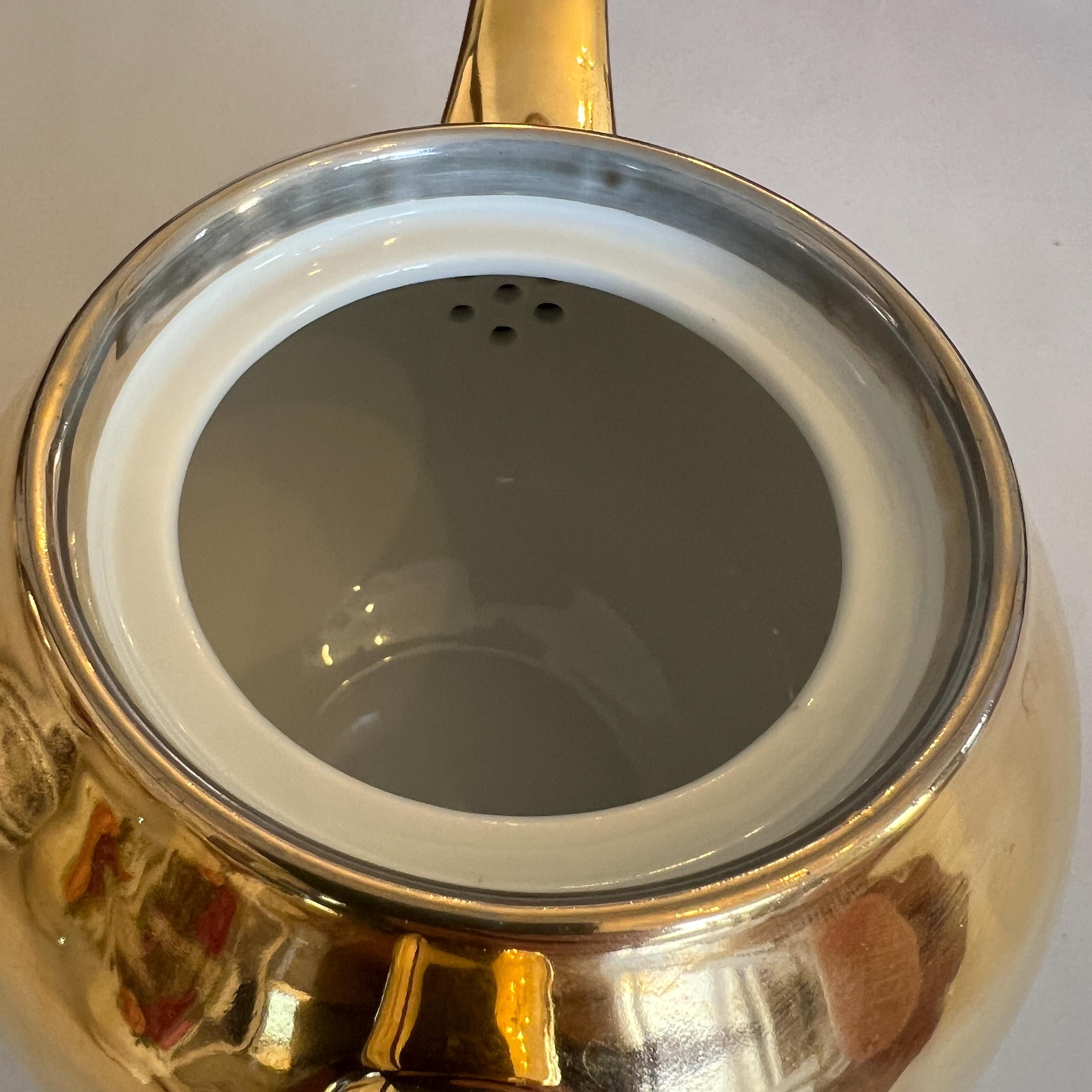 All items carry the maker's mark on the base. The teapot is stamped as shape 6 and size 6 on the base. It has a recessed lid with an air hole to aid pouring and has strainer holes between the body and spout. It pours very well with no drips but it does have a deep throat on the lid, so it should not be overfilled to prevent tea escaping the lid. The gilding on the pot has some minor wear on the handle and there are superficial scratches and other minor signs of use. Around the lid seat the gold lustre has worn on the inner rim surface. These areas can be seen in the photographs.