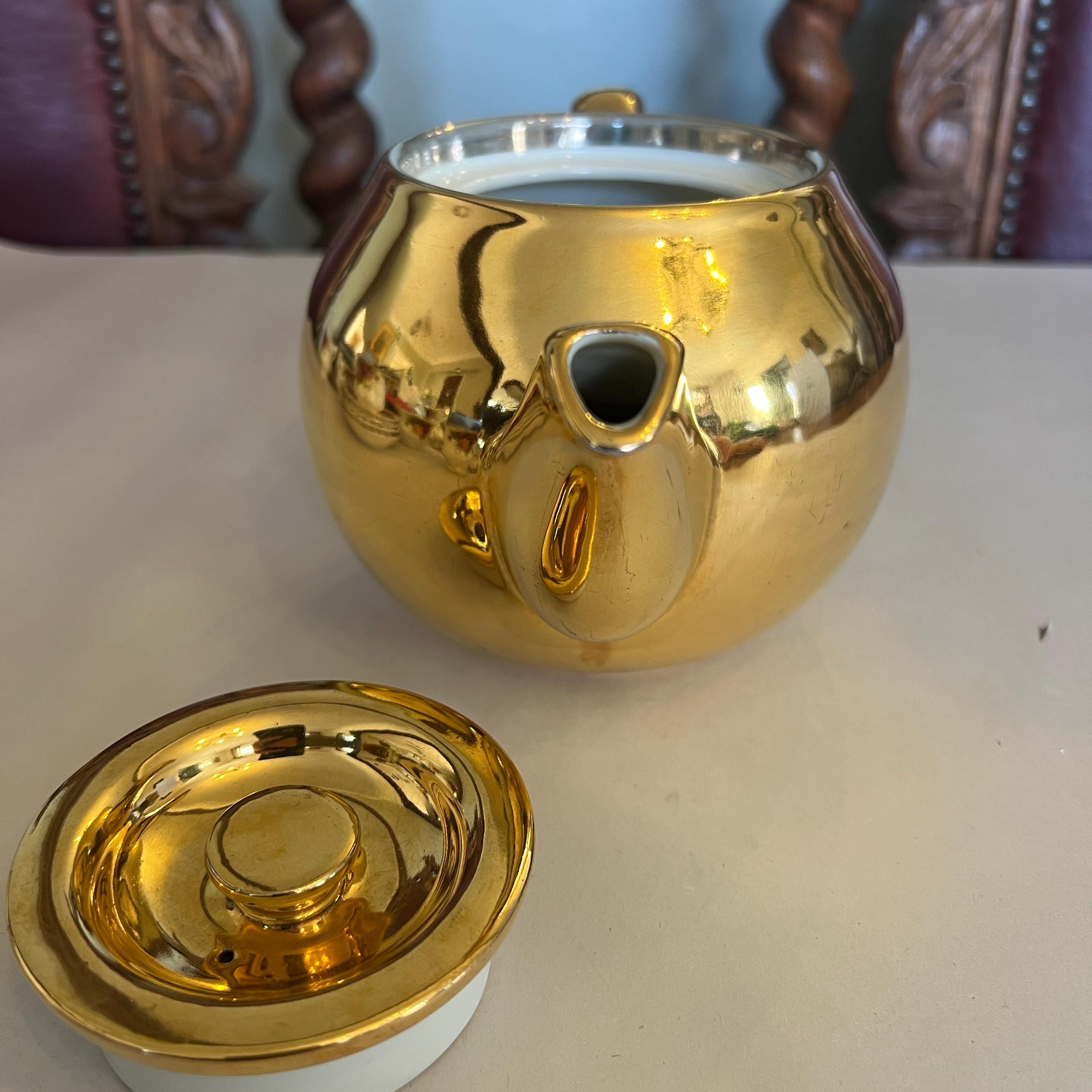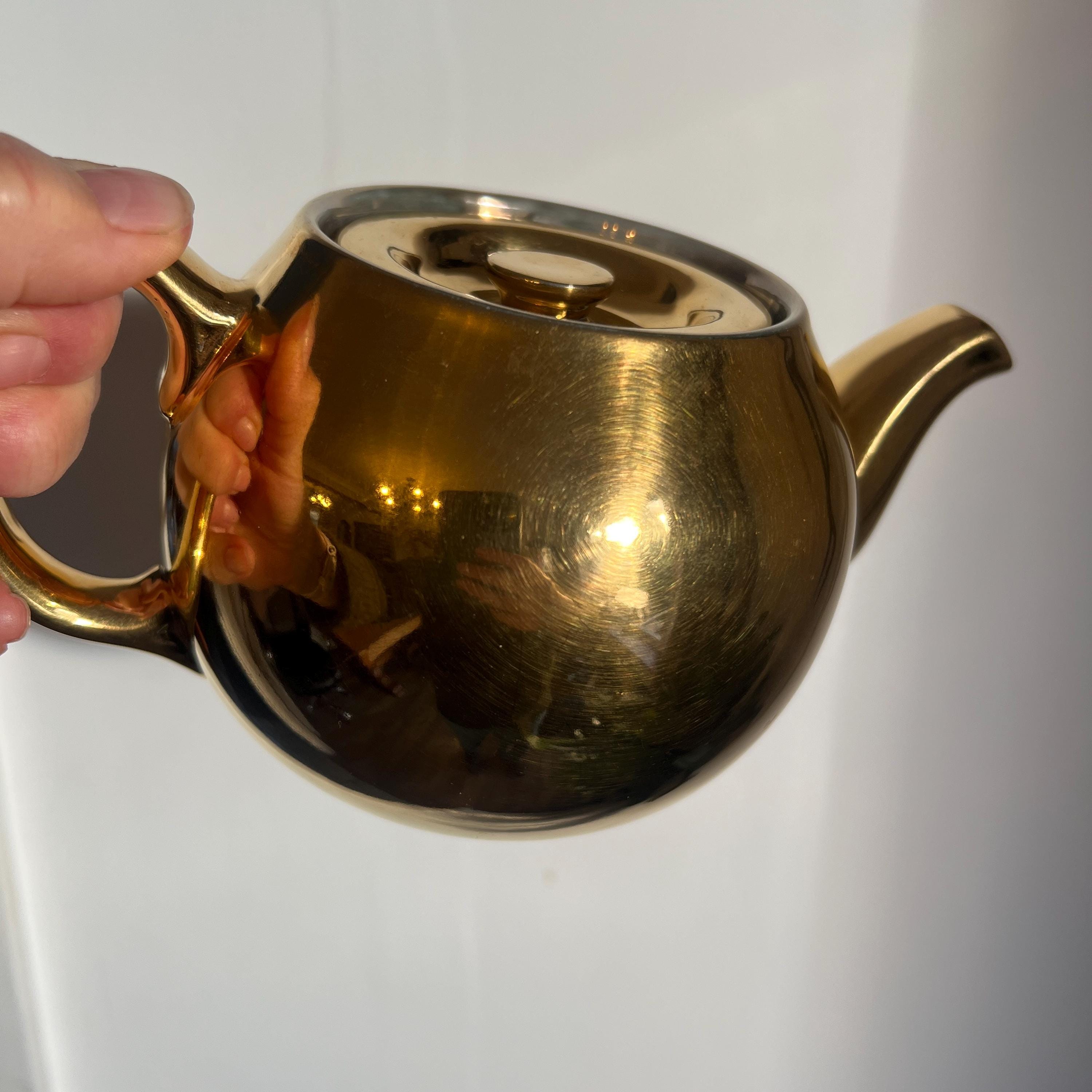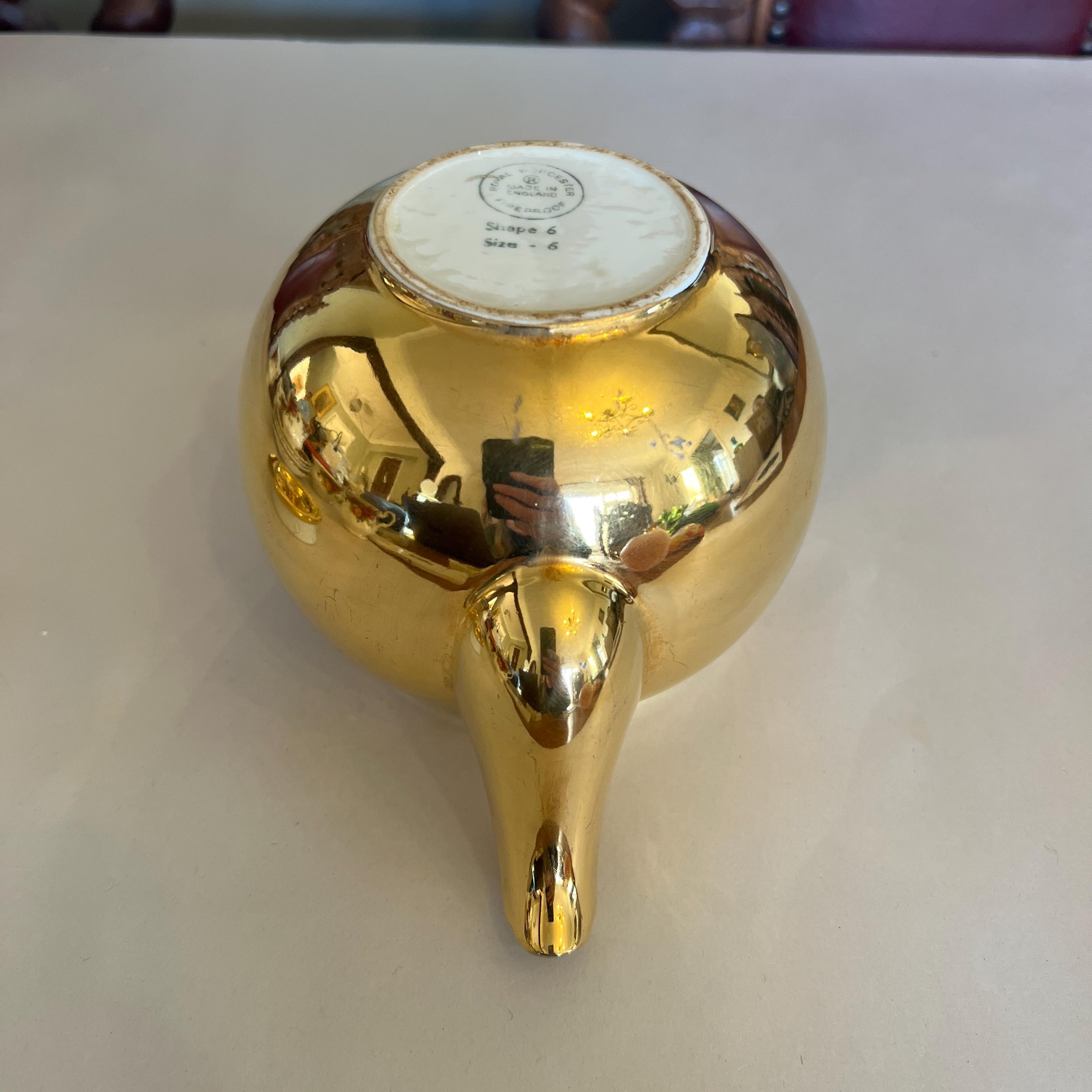 All items carry the maker's mark on the base. The teapot is stamped as shape 6 and size 6 on the base. It has a recessed lid with an air hole to aid pouring and has strainer holes between the body and spout. It pours very well with no drips but it does have a deep throat on the lid, so it should not be overfilled to prevent tea escaping the lid. The gilding on the pot has some minor wear on the handle and there are superficial scratches and other minor signs of use. Around the lid seat the gold lustre has worn on the inner rim surface. These areas can be seen in the photographs.